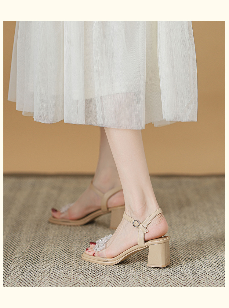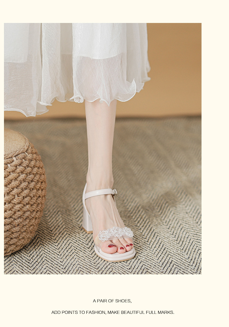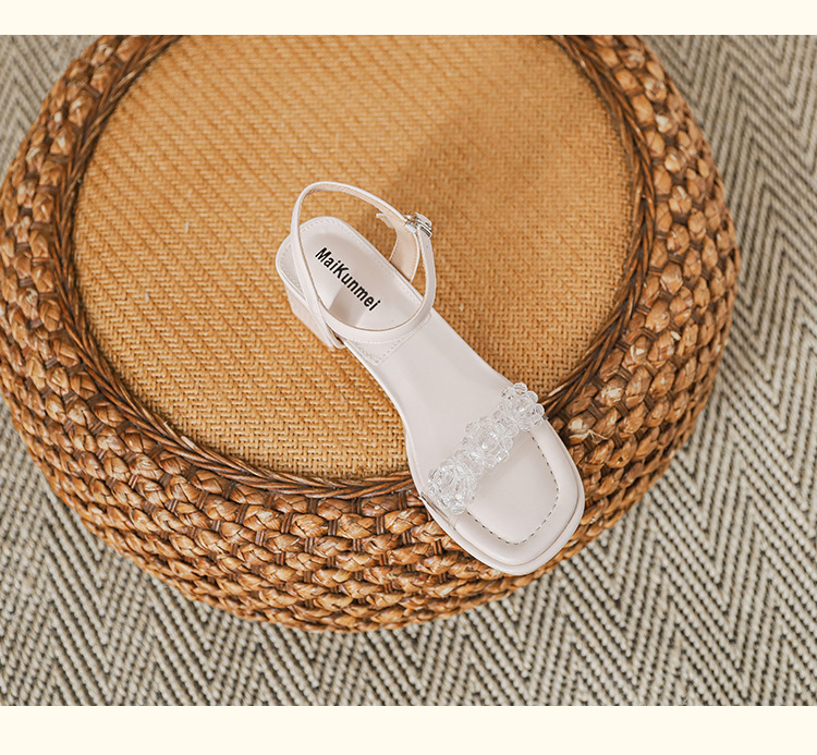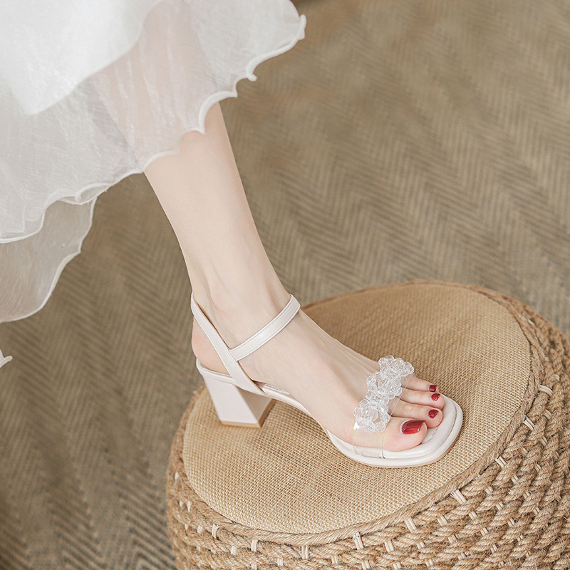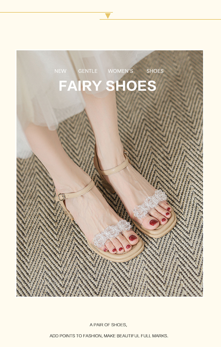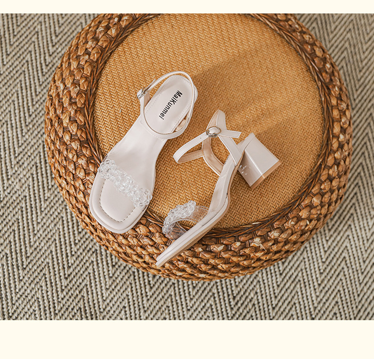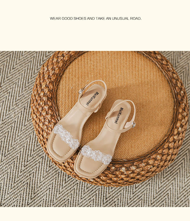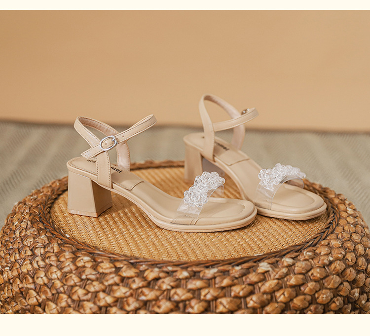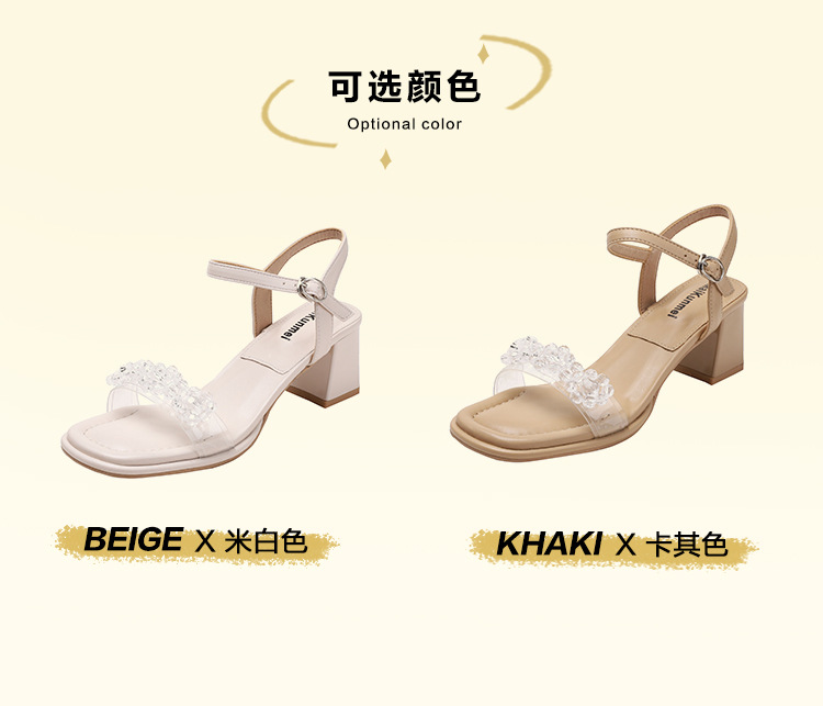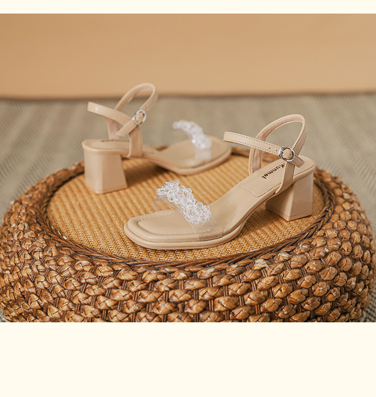 여름 새로운 스타일 여성 샌들 신발 느낌 작은 샤넬 스타일 수제 구슬 스퀘어 헤드 두꺼운 힐 샌들