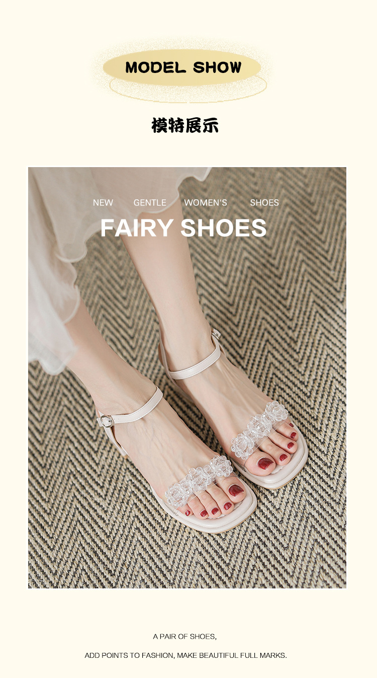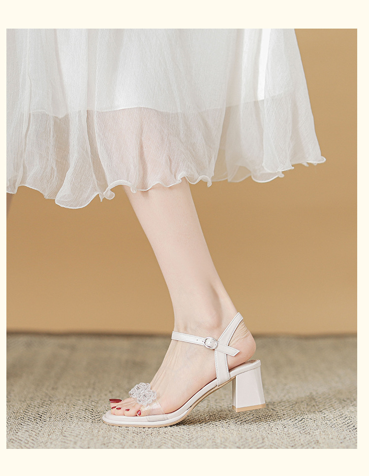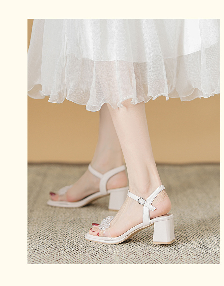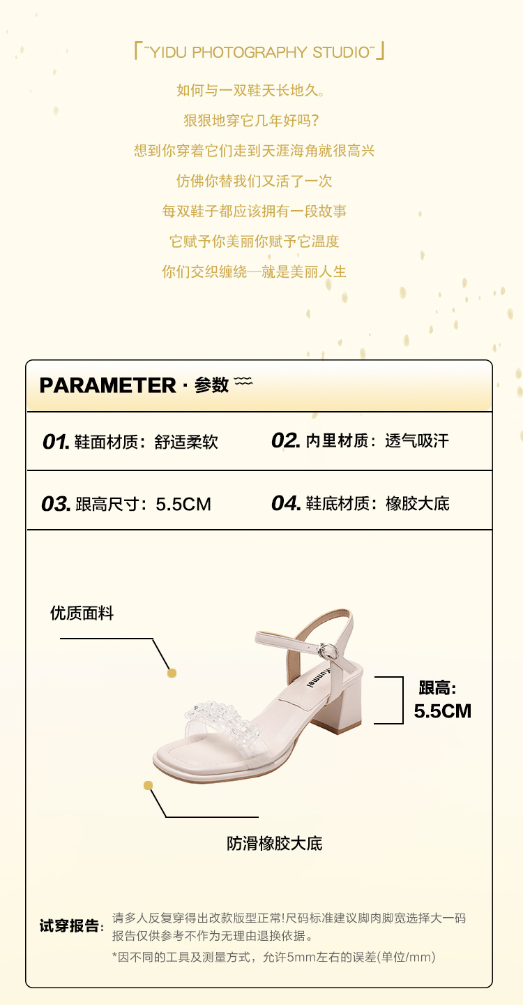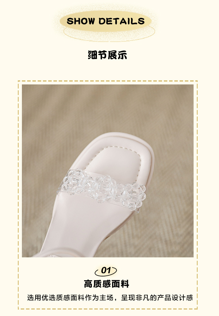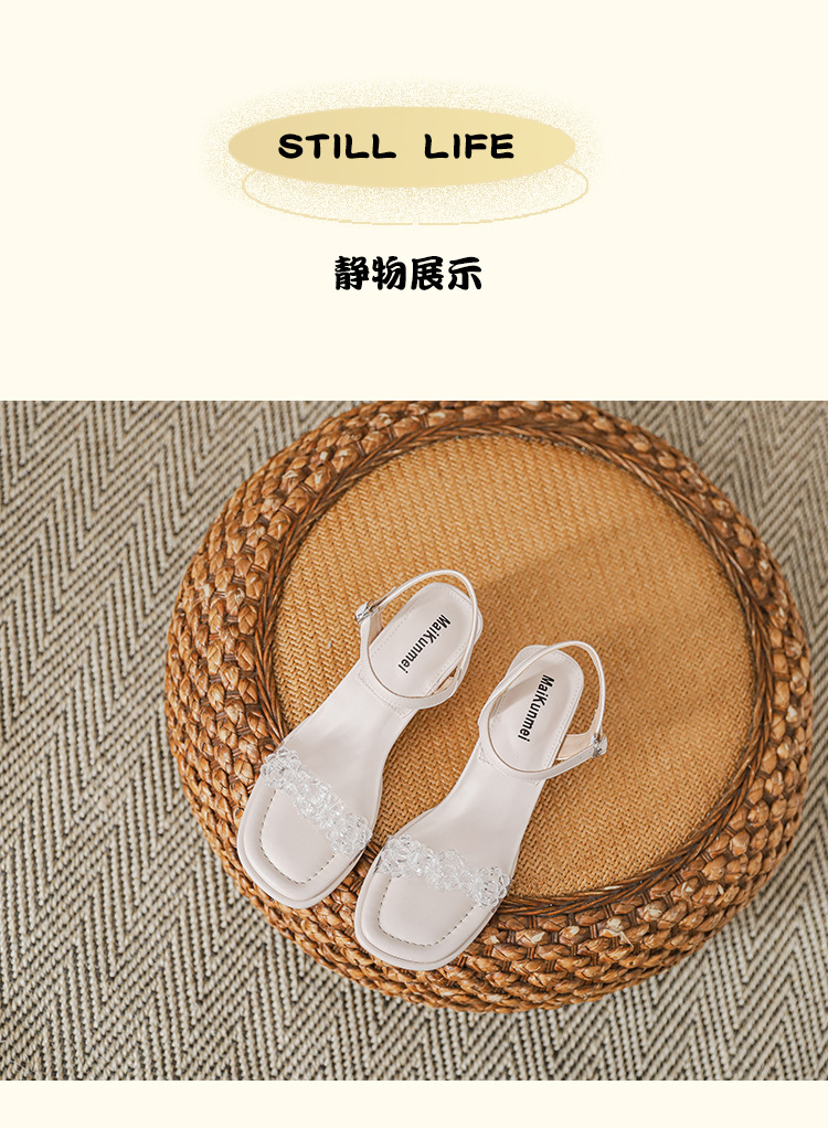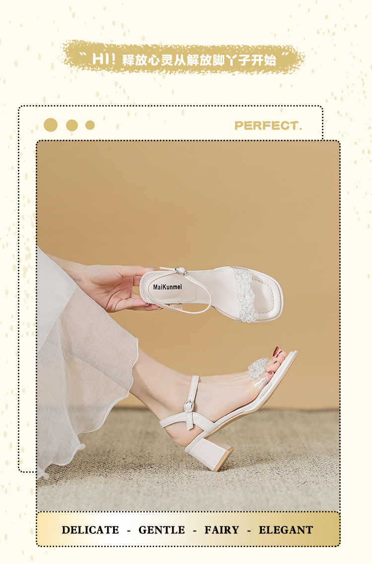여름 새로운 스타일 여성 샌들 신발 느낌 작은 샤넬 스타일 수제 구슬 스퀘어 헤드 두꺼운 힐 샌들