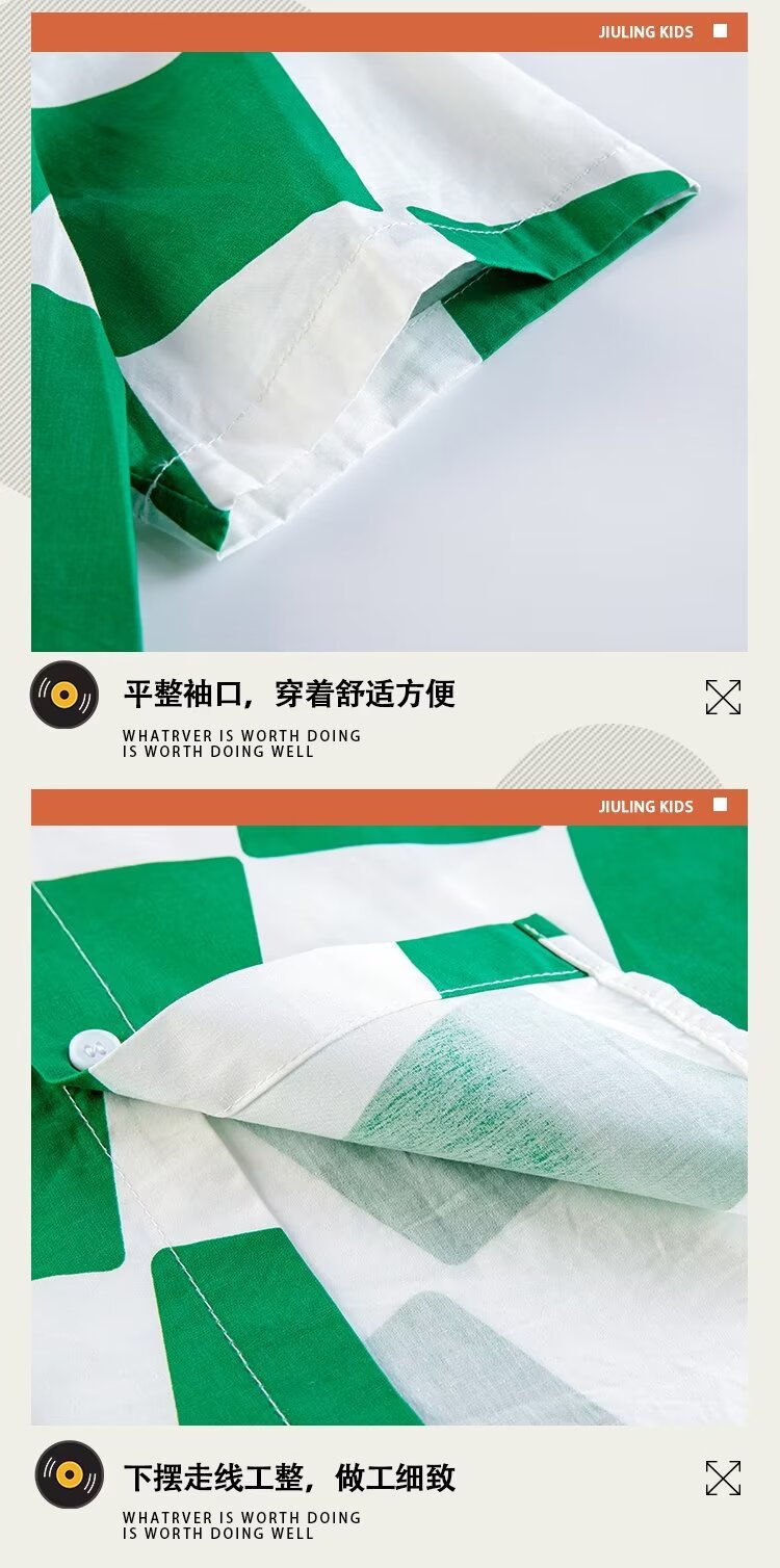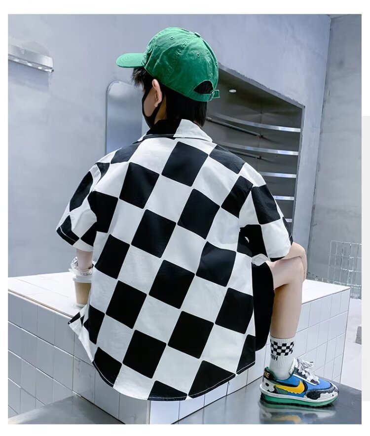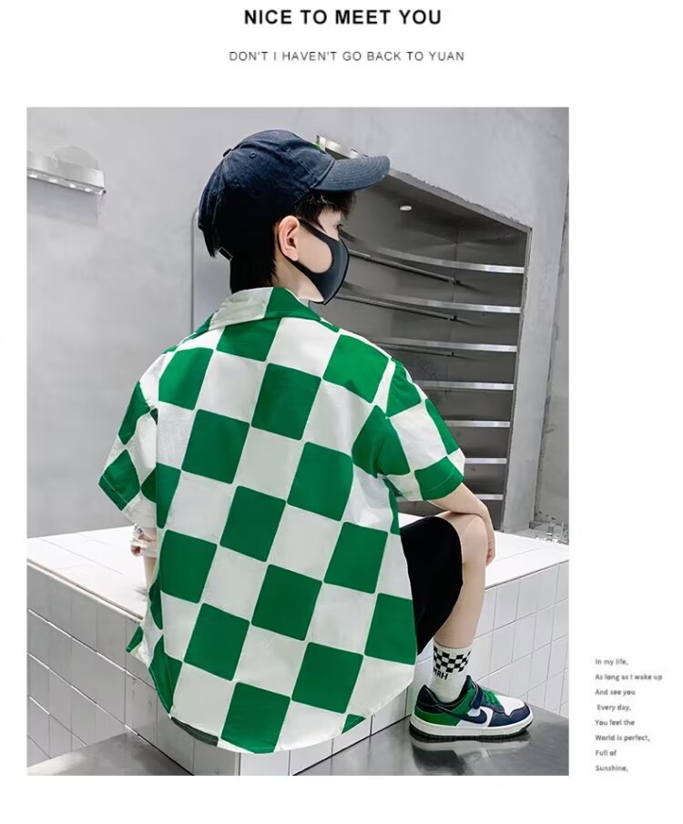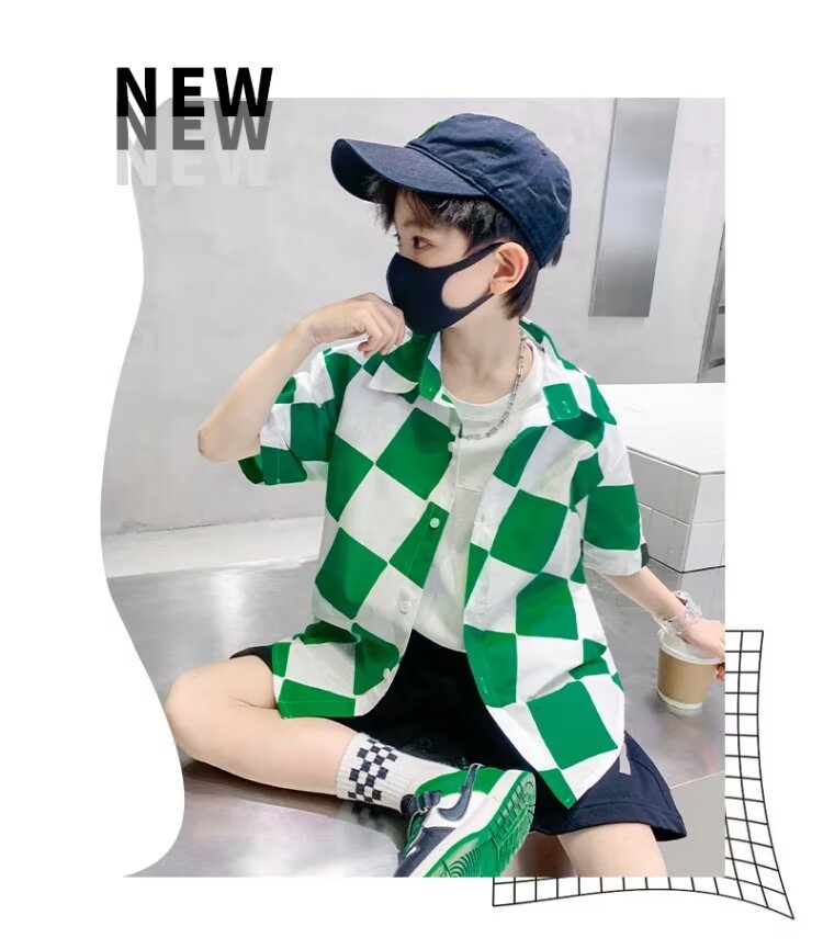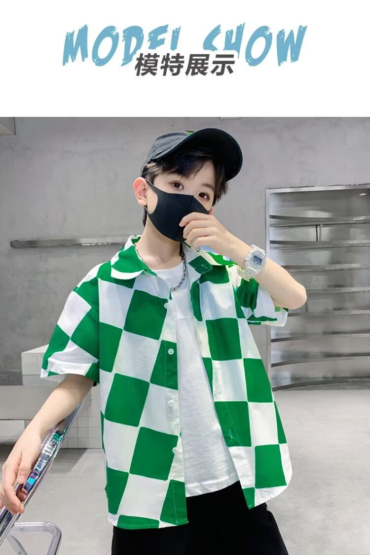 소년 반팔 격자 무늬 프린트 셔츠 2024 여름 스타일 중대형 어린이 캐주얼 라펠 얇은 셔츠 탑스토어 가기