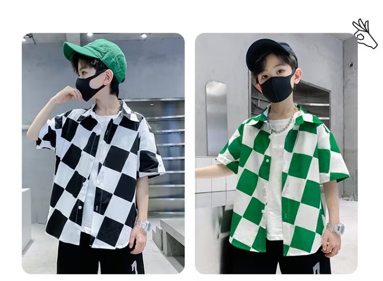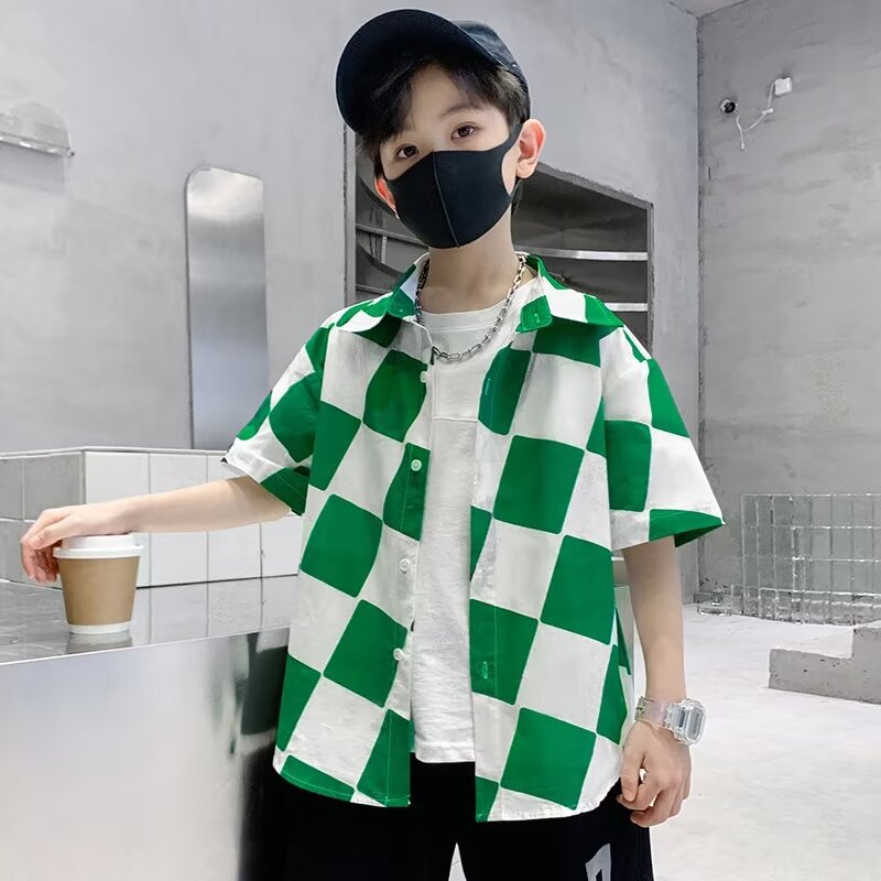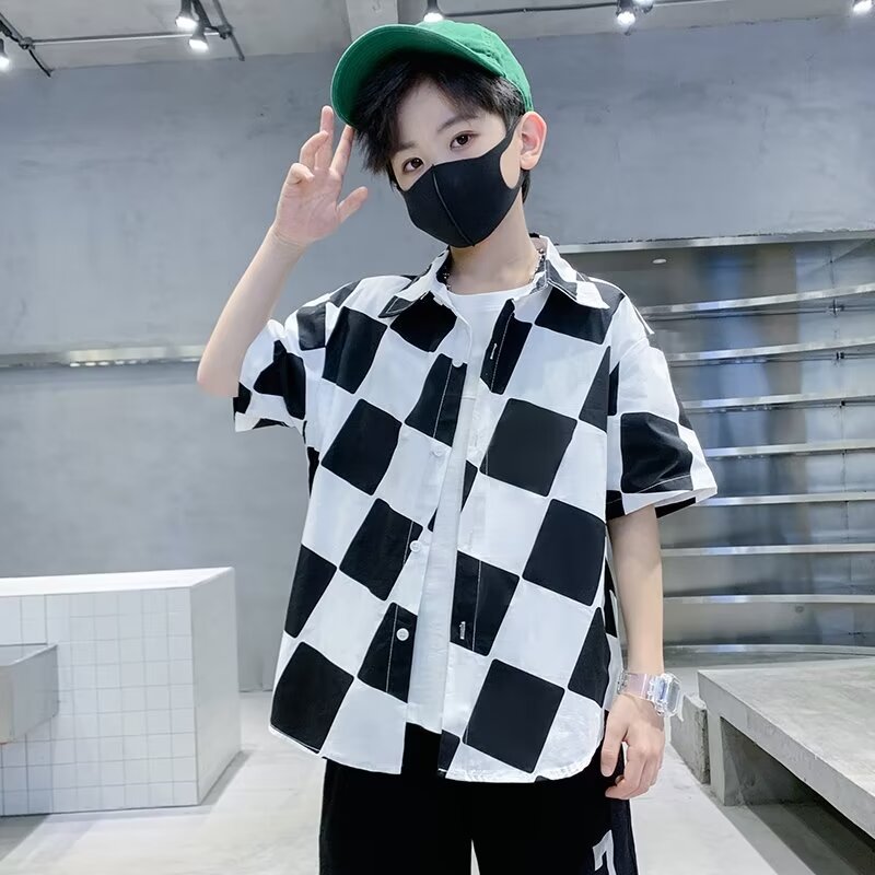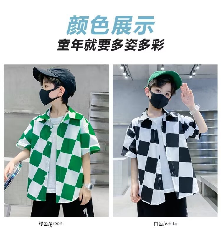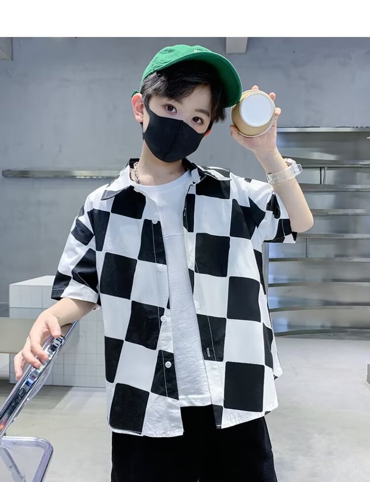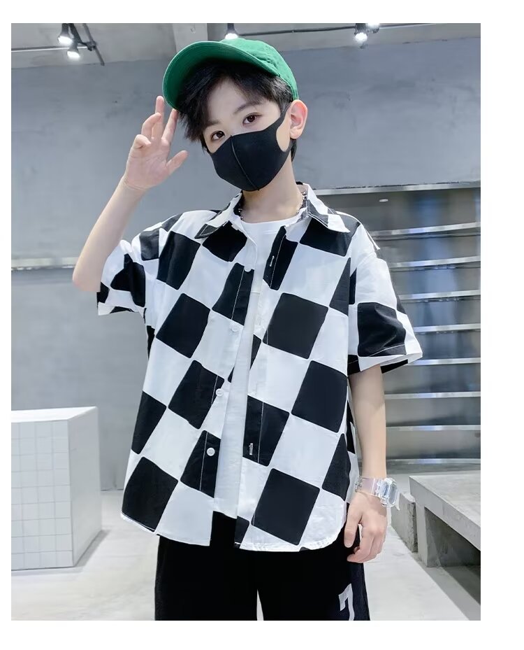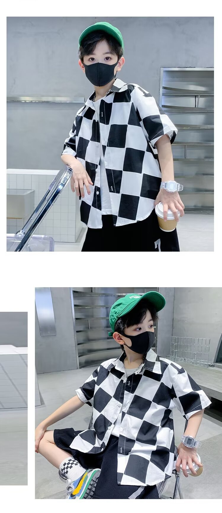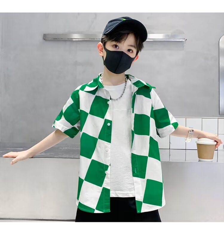 소년 반팔 격자 무늬 프린트 셔츠 2024 여름 스타일 중대형 어린이 캐주얼 라펠 얇은 셔츠 탑