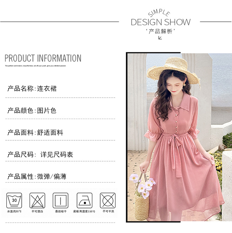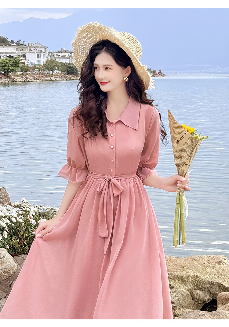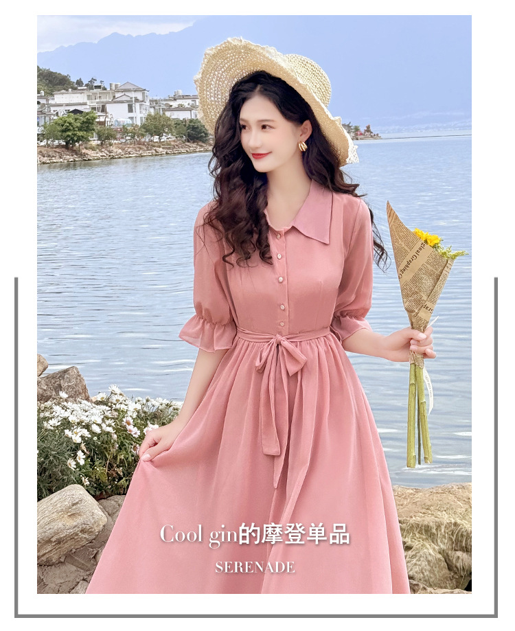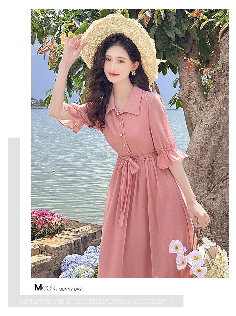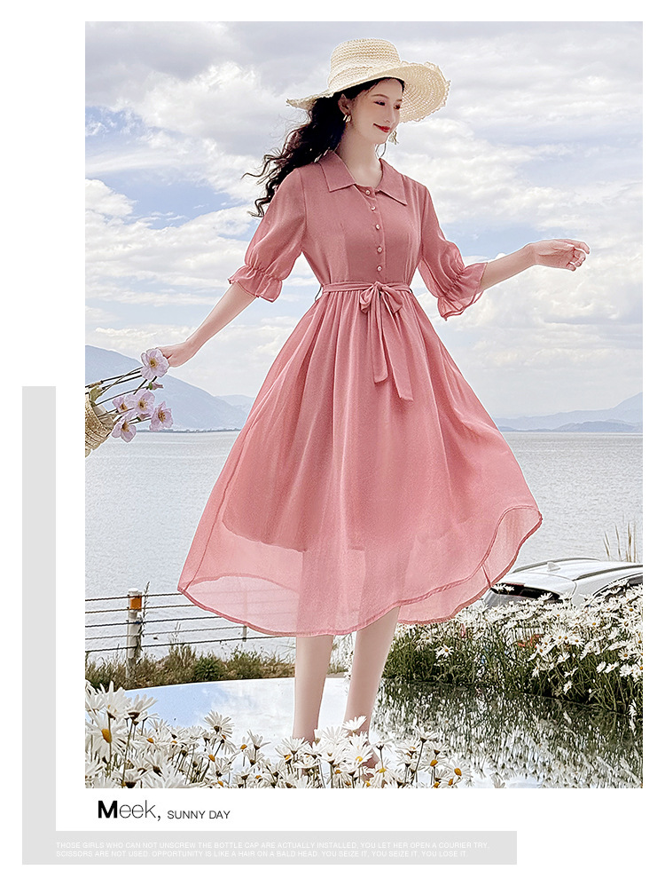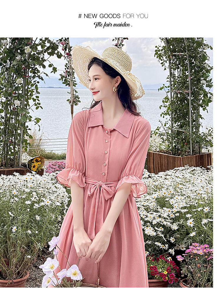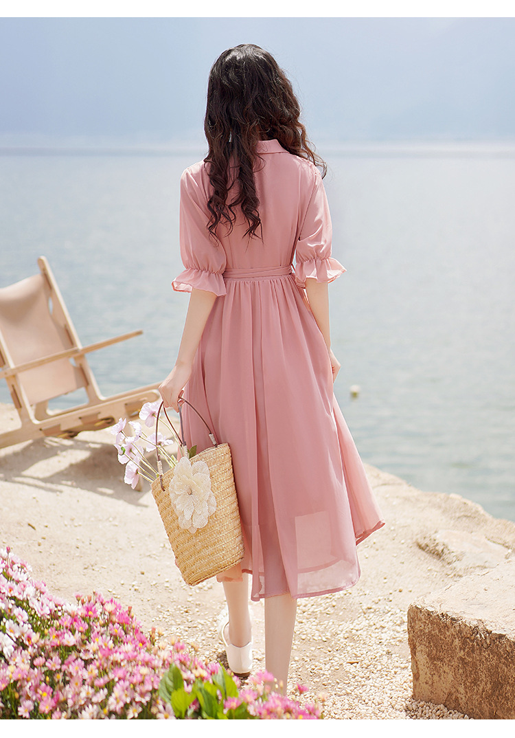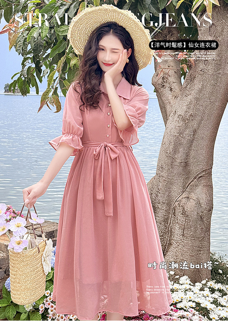 재고 2024 여름 새로운 차 브레이크 프랑스 스타일 모리 예술 핑크 쉬폰 스위트 레이디 셔츠 원피스