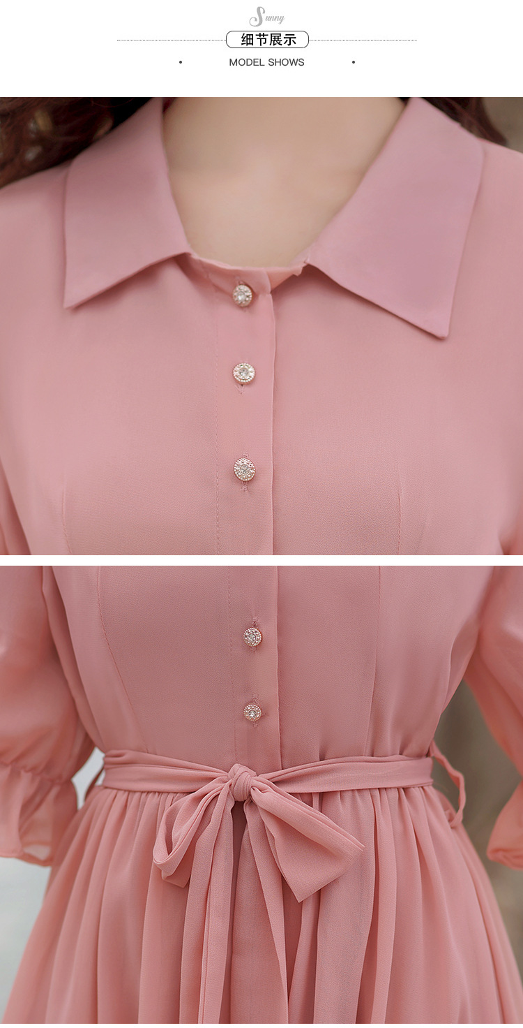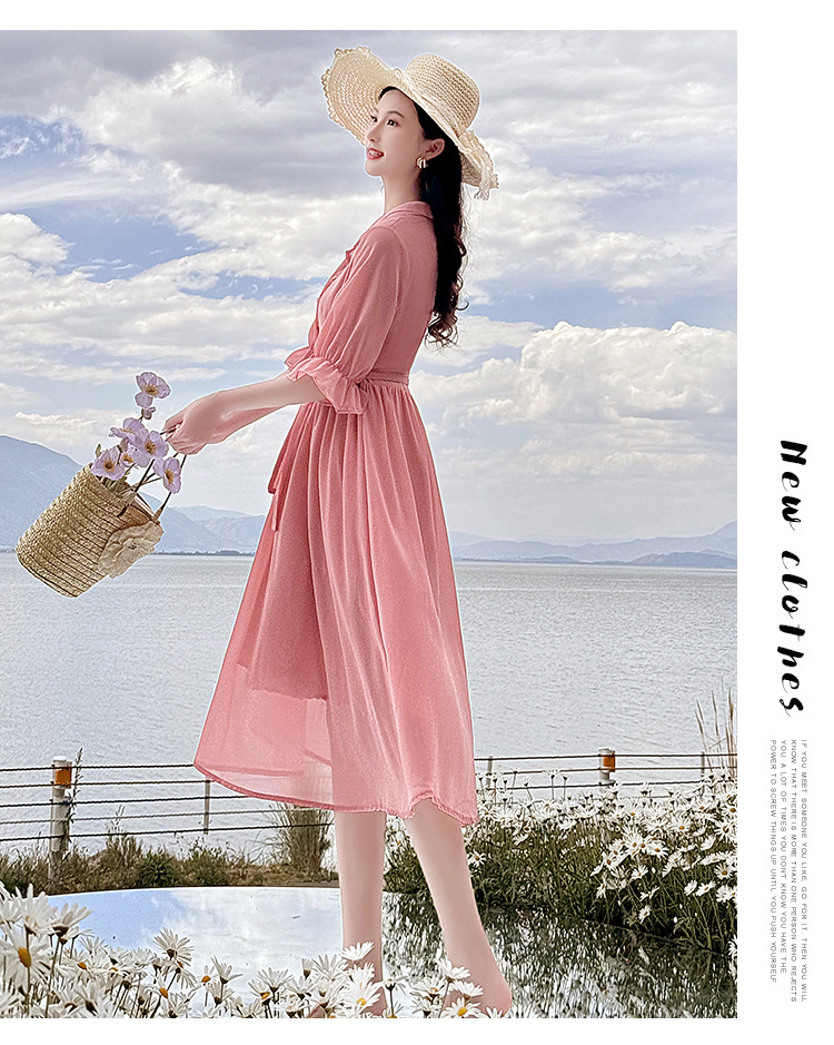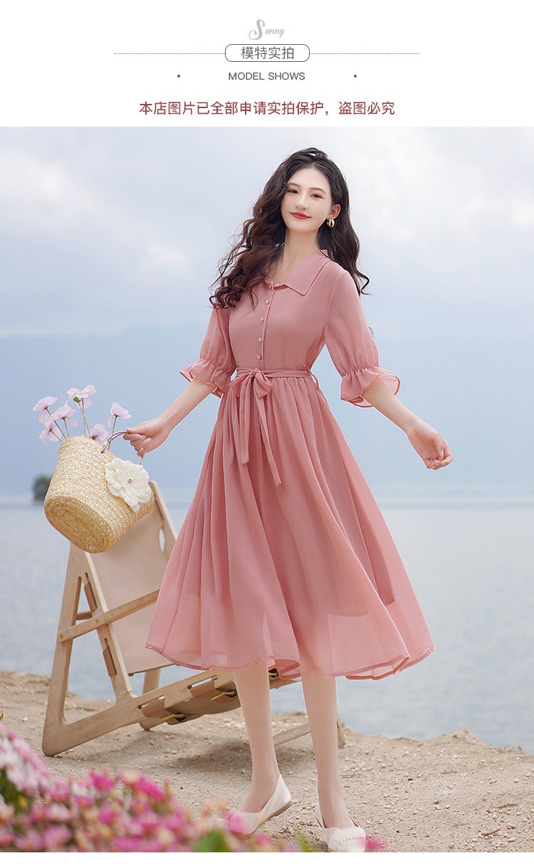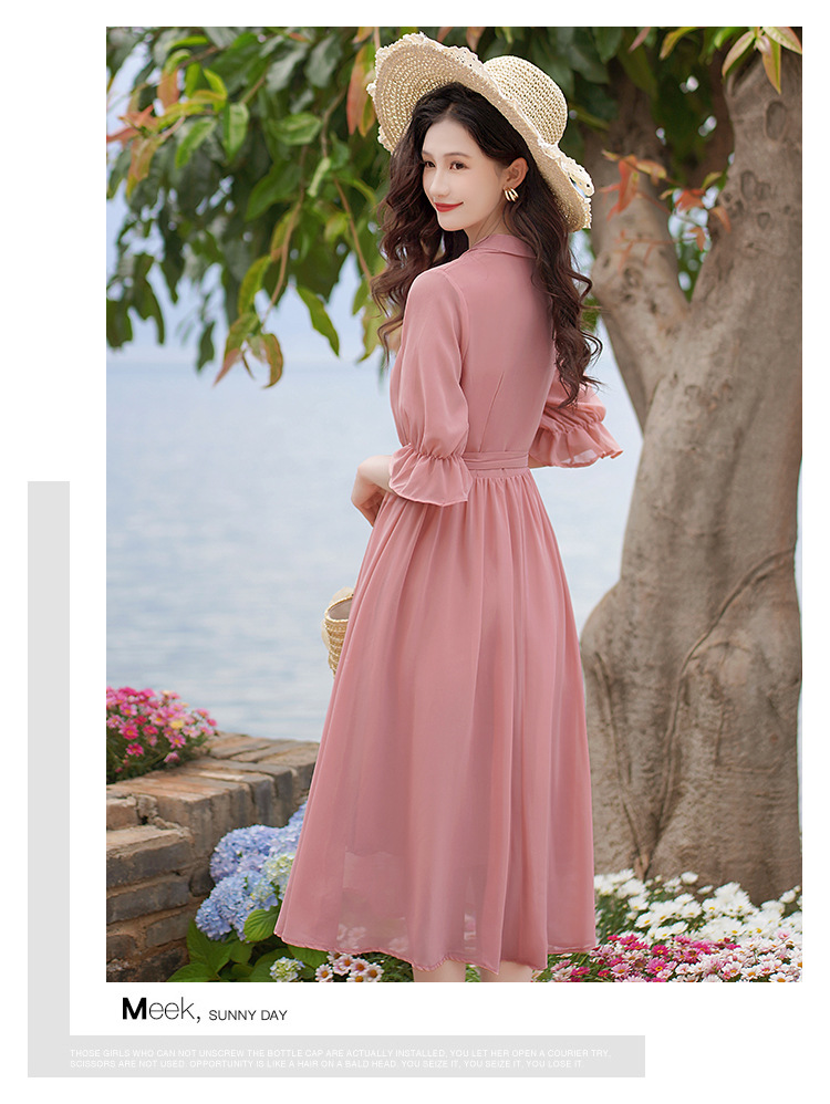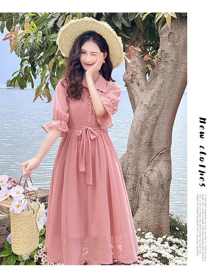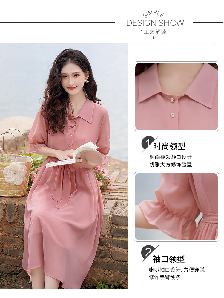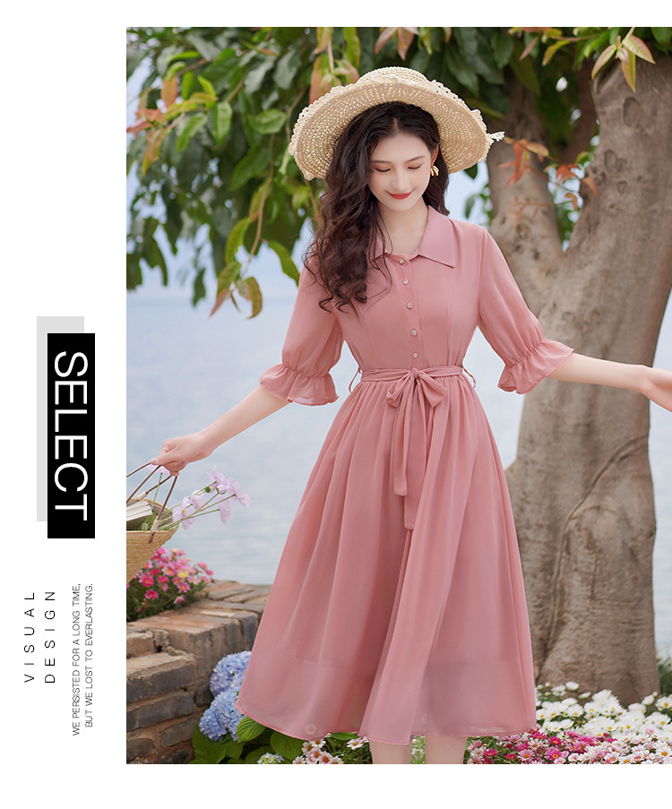 재고 2024 여름 새로운 차 브레이크 프랑스 스타일 모리 예술 핑크 쉬폰 스위트 레이디 셔츠 원피스