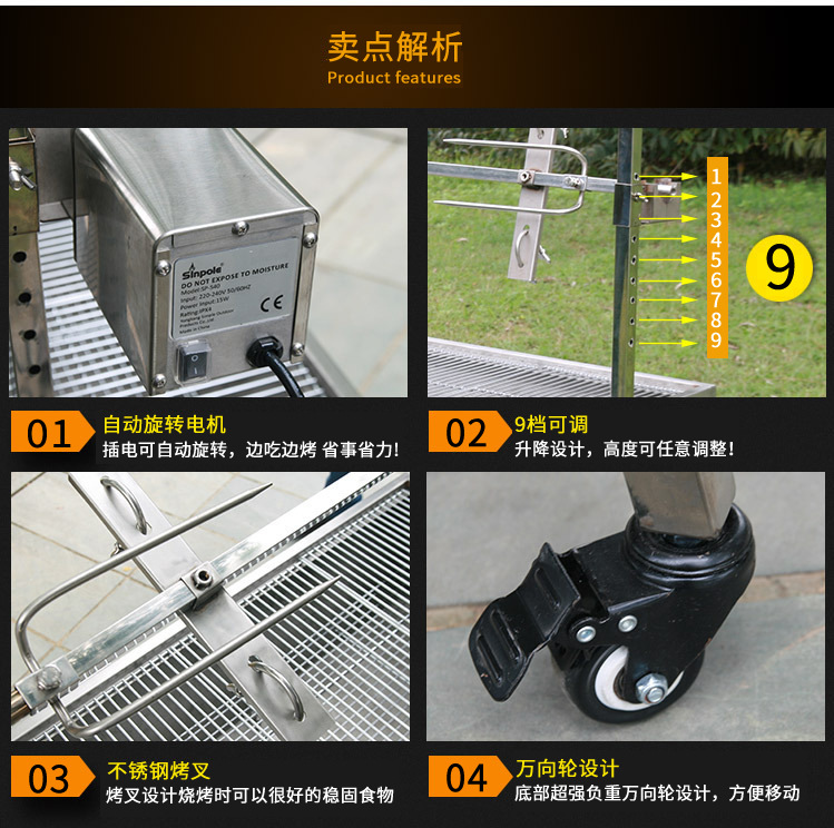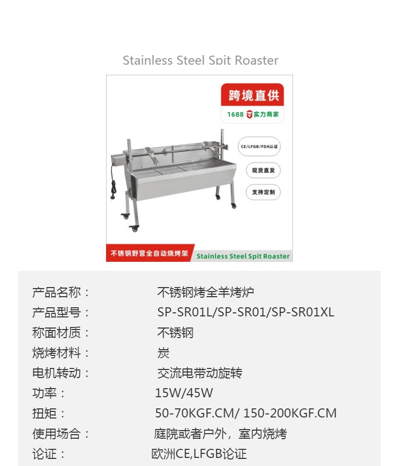 本款不锈钢全自动烧烤炉特别适合家庭或者农场烤全羊,烤乳猪,烤牛排等,主要出口欧美,澳大利亚,新西兰,中东等国家。