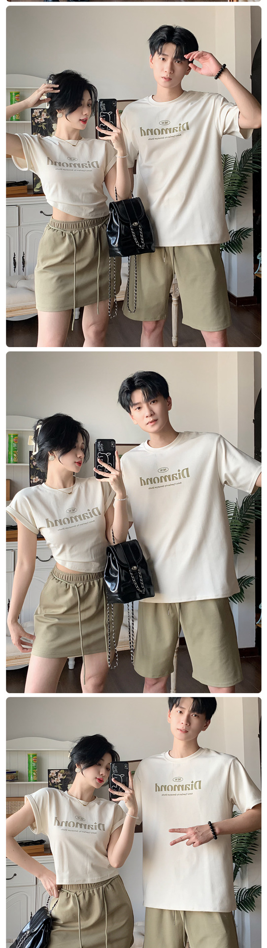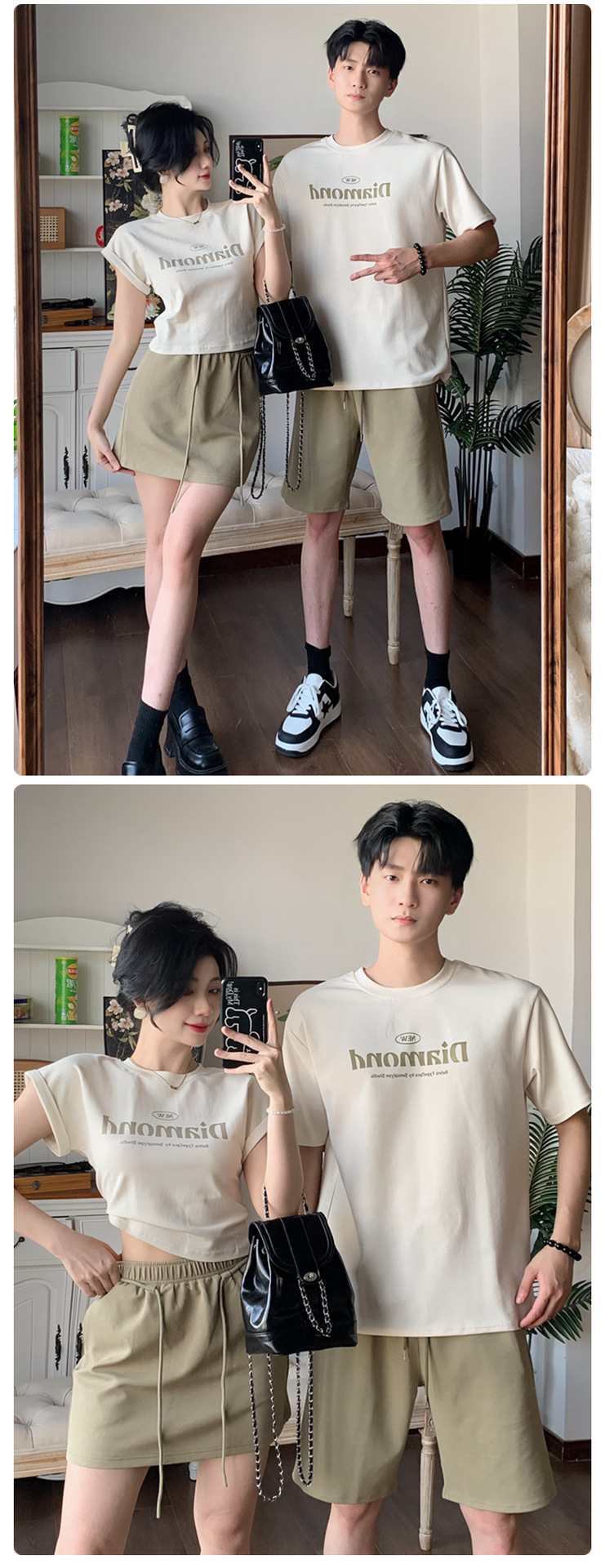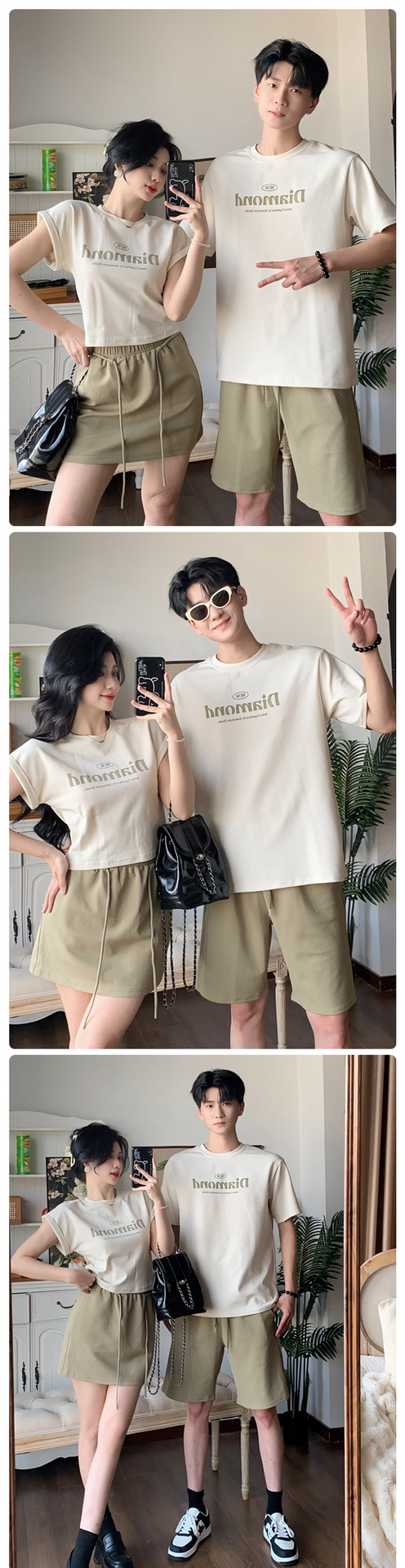 2024 년 여름 새 커플의 올 매치 반팔 편지 프린트 티셔츠 여성용 여름 투피스 세트