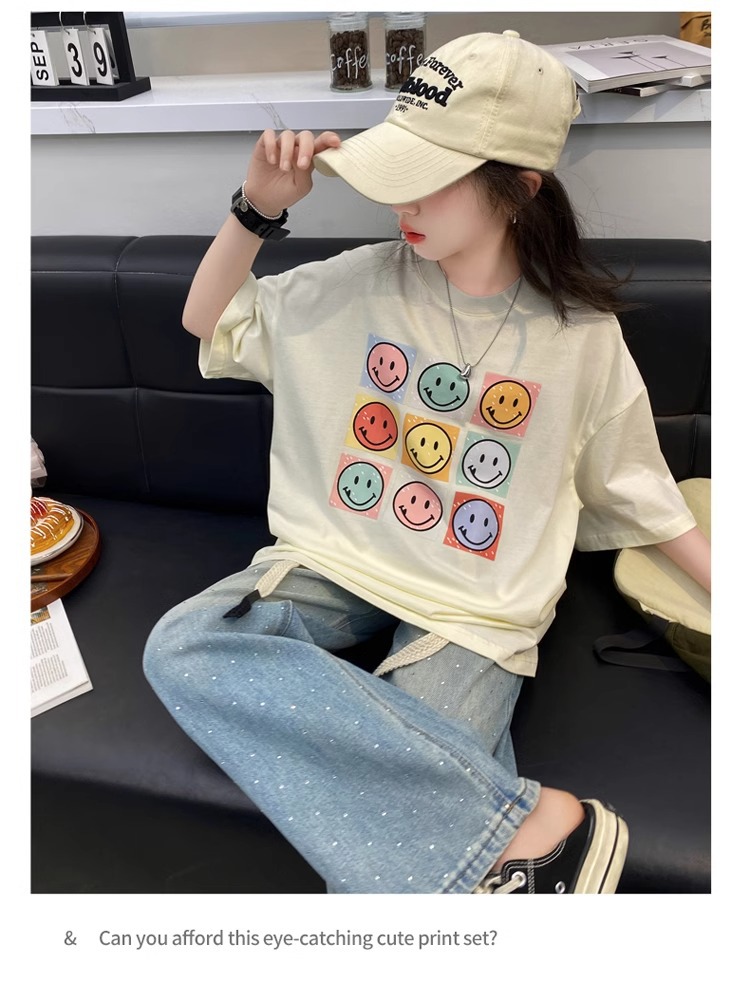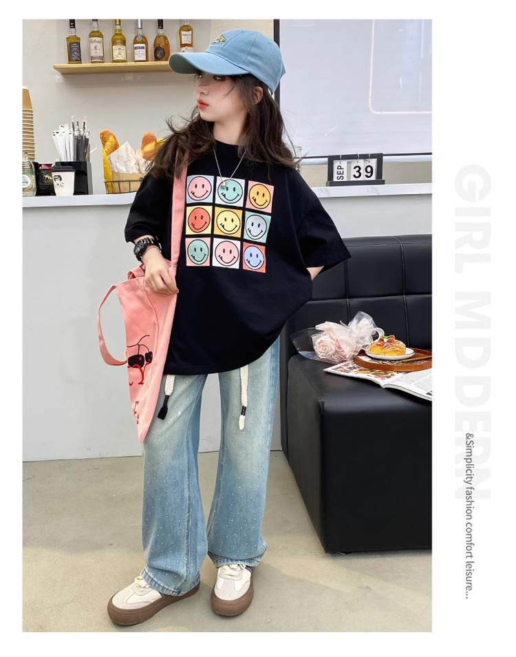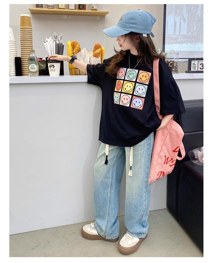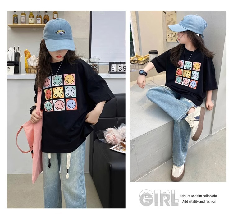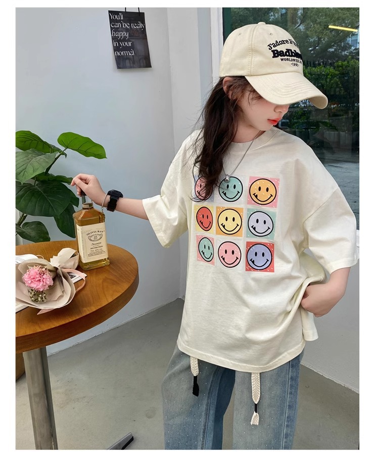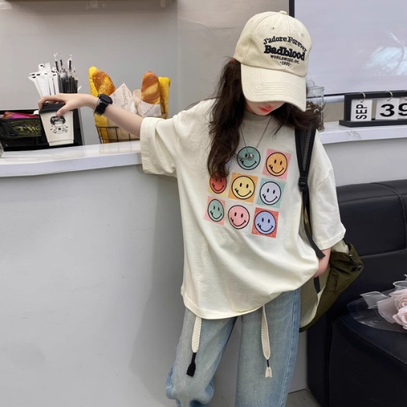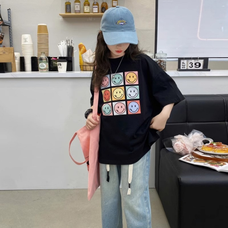 여자 여름 코튼 티셔츠 유행 캐주얼 어린이 서양식 짧은 소매 느슨한 큰 어린이 여름 한국 스타일 탑 티셔츠