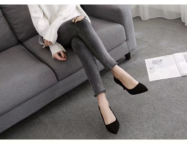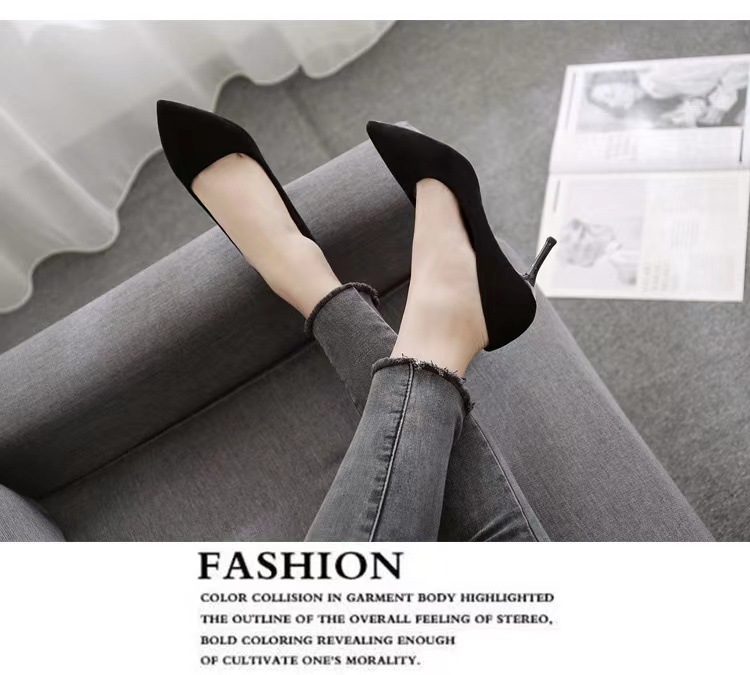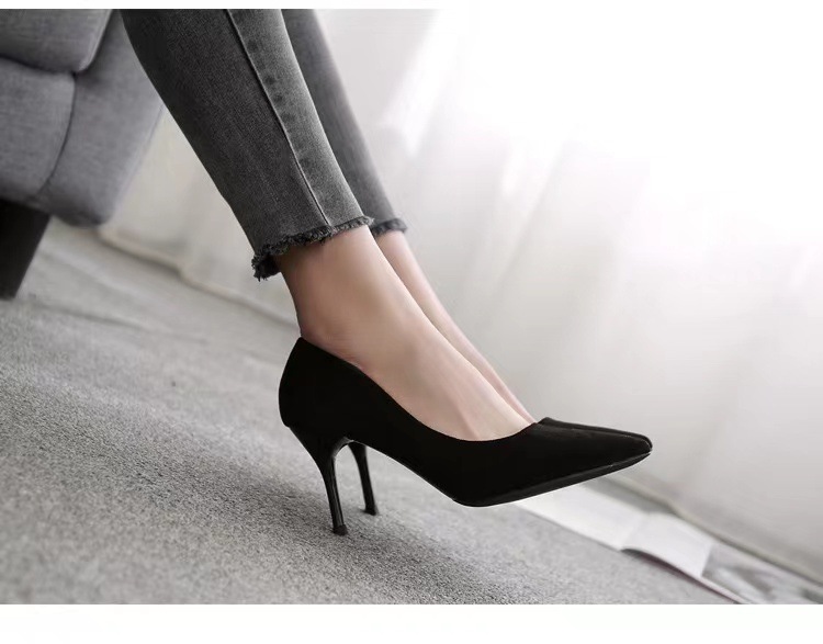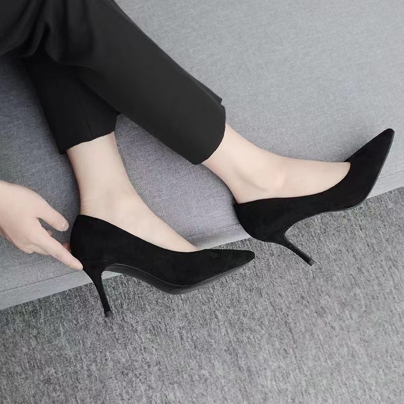 34-42 플러스 사이즈 하이힐 여성 2024 봄과 가을 새 블랙 스틸레토 뾰족한 발가락 스웨이드 전문 작업 신발스토어 가기