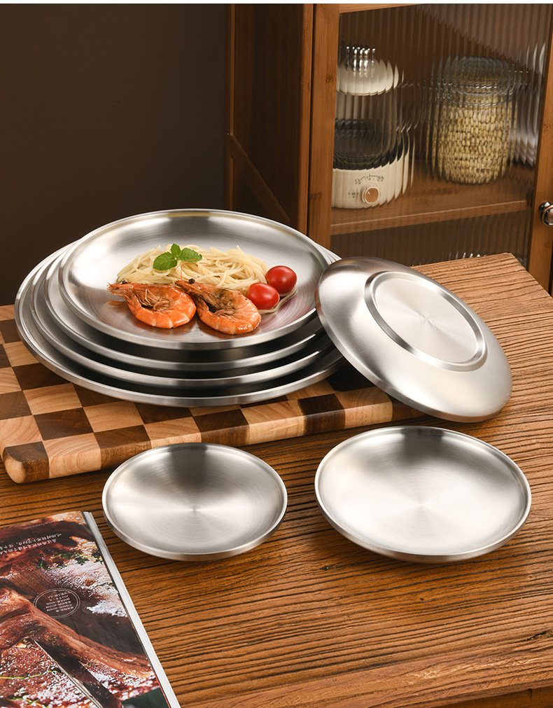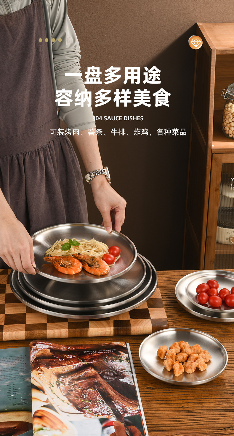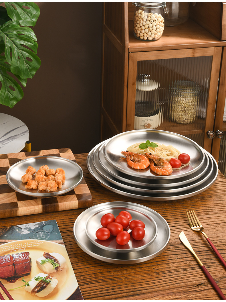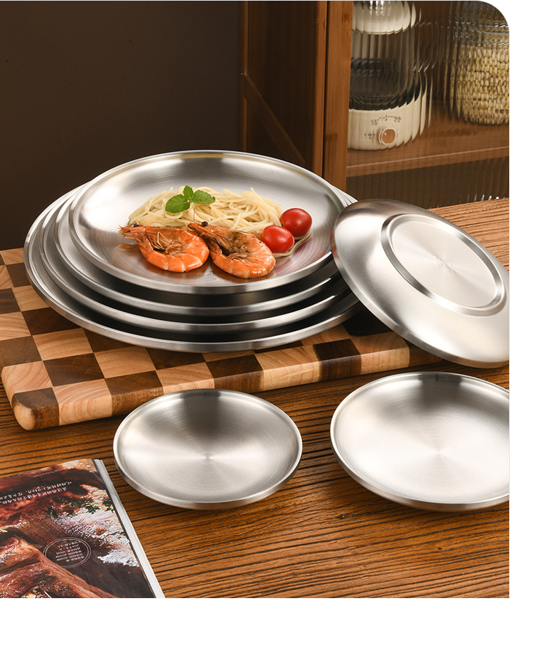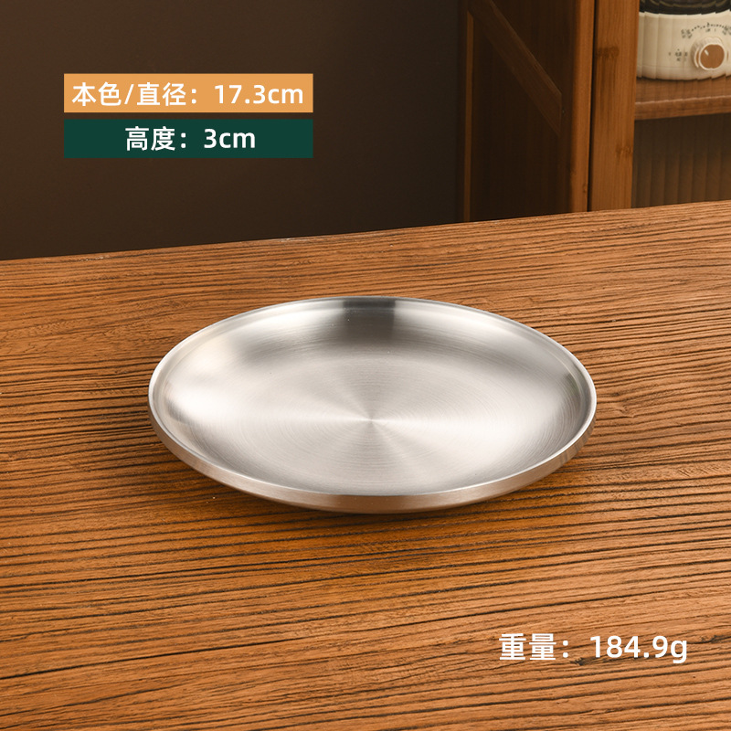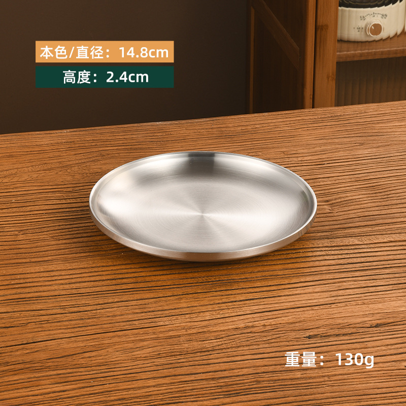 한국 스타일 두꺼운 스테인레스 스틸 더블 레이어 바베큐 플레이트 상업용 가정용 디저트 샵 바베큐 트레이 크리에이티브 라운드 웨스턴 푸드 플레이트스토어 가기