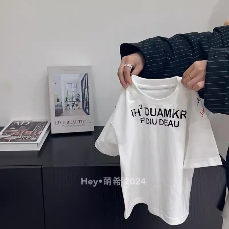 한국 아동복 만화 낙서 흰색 반팔 티셔츠 남성과 여성 어린이 여름 면화 외국 스타일의 옷 도매스토어 가기
