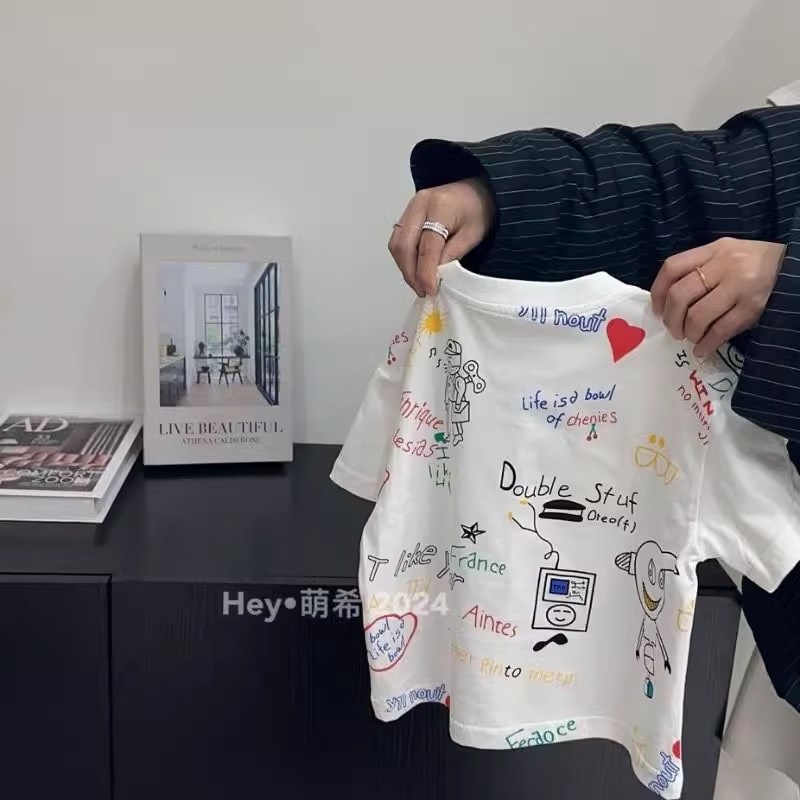 한국 아동복 만화 낙서 흰색 반팔 티셔츠 남성과 여성 어린이 여름 면화 외국 스타일의 옷 도매