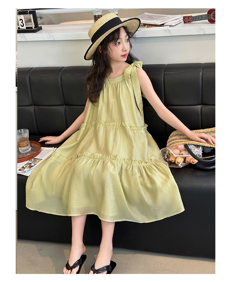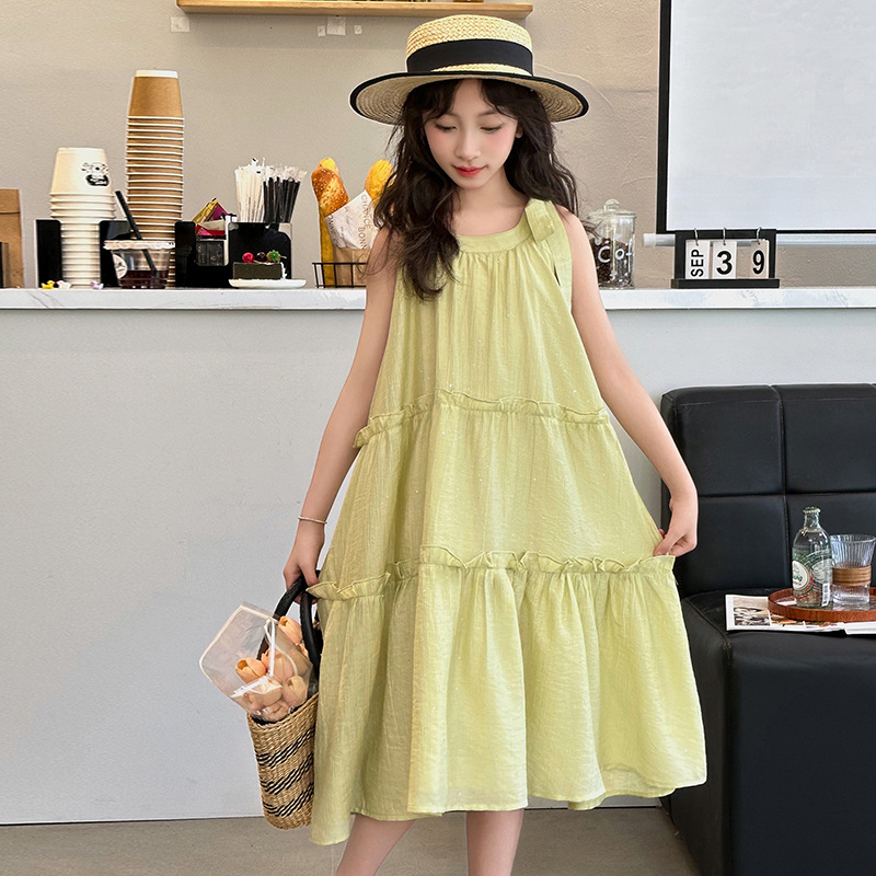 소녀의 큰 소년의 원피스 여름 2024 새로운 어린이 소녀 스타일리스트 조끼 공주 치마 시폰 긴 치마 여름 원피스