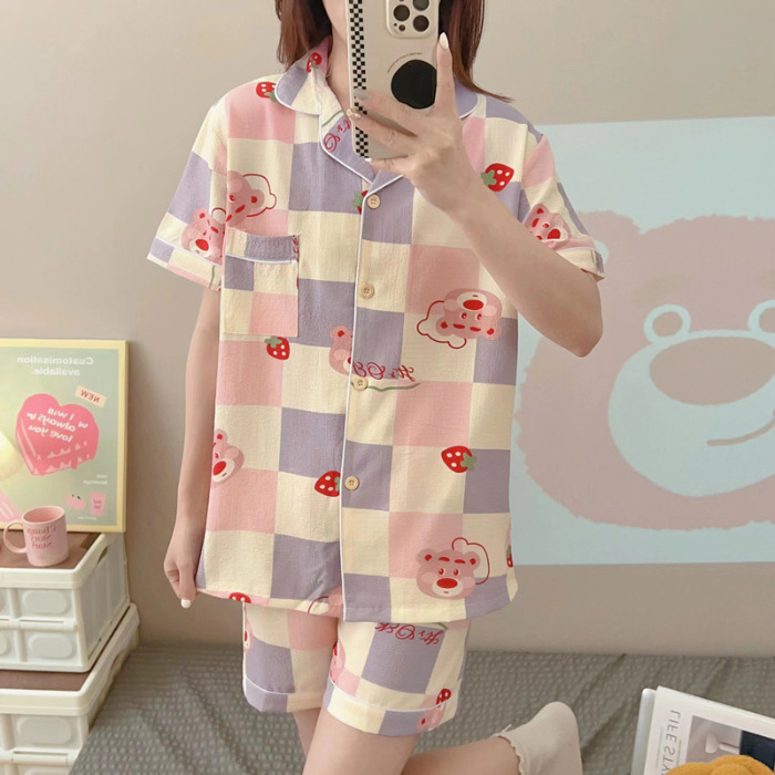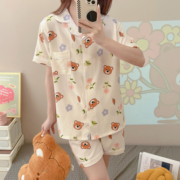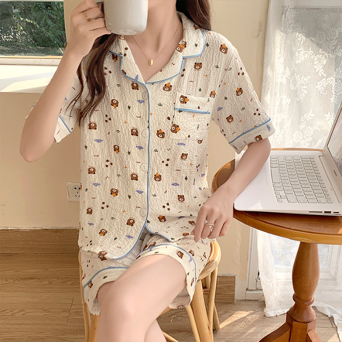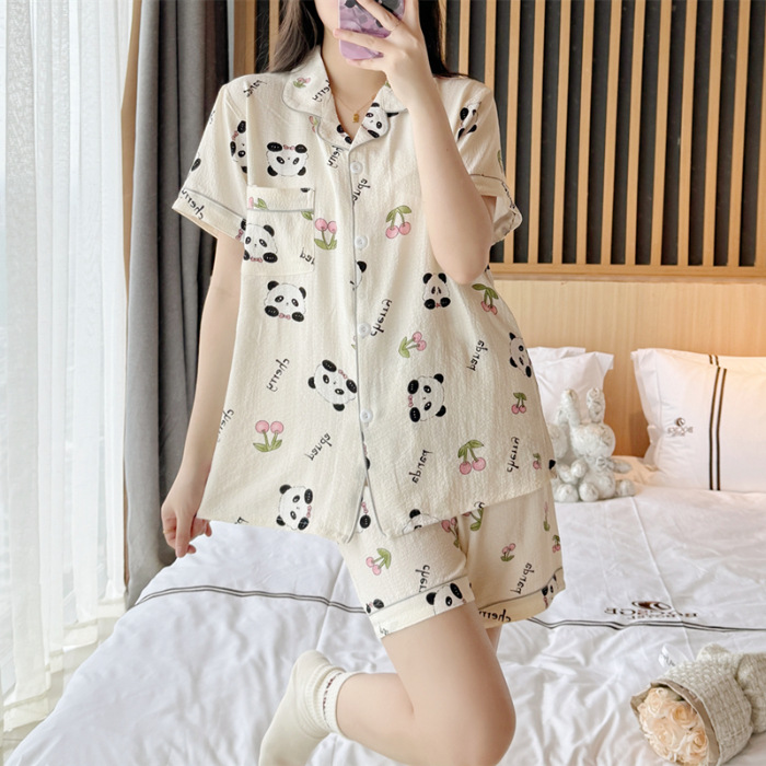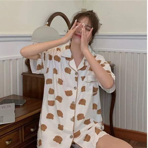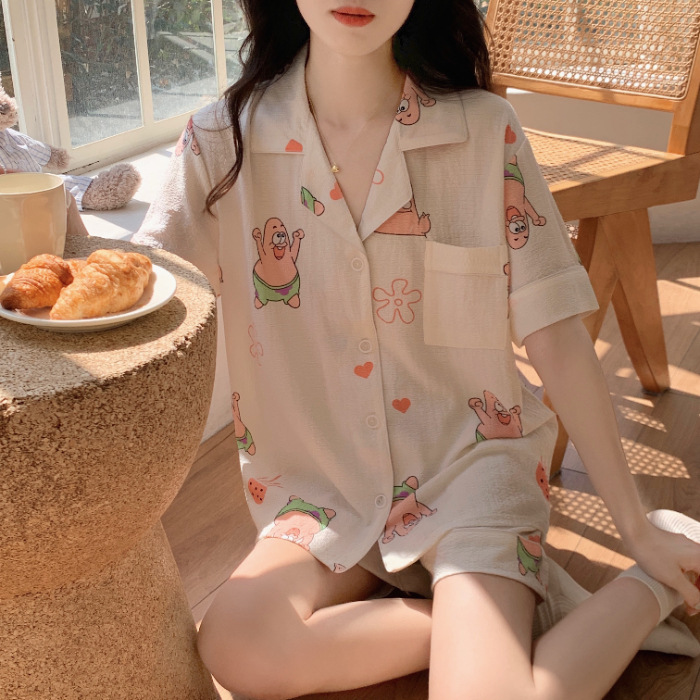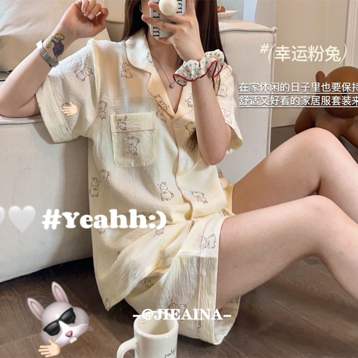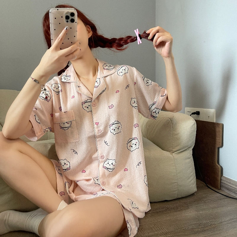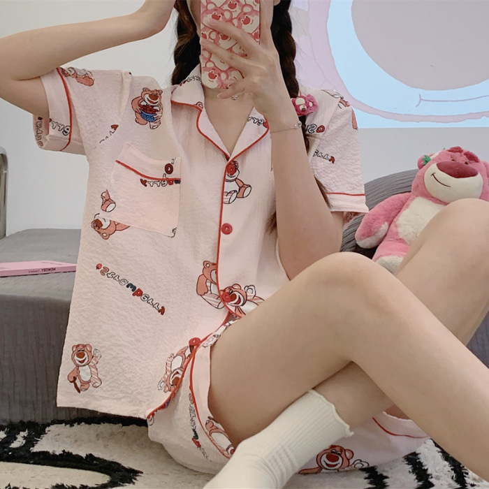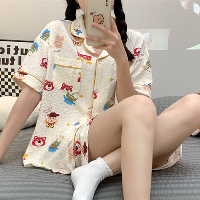 여성용 여름 잠옷, 폴리에스터 폼 크레이프 원단, 인스 스타일 공주풍 반팔 여름 얇은 홈웨어 세트, 만화 디자인스토어 가기