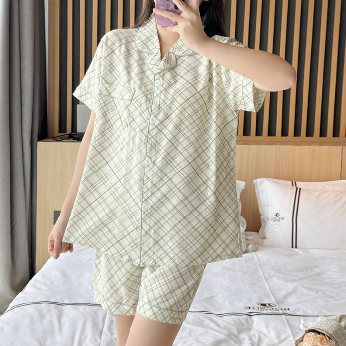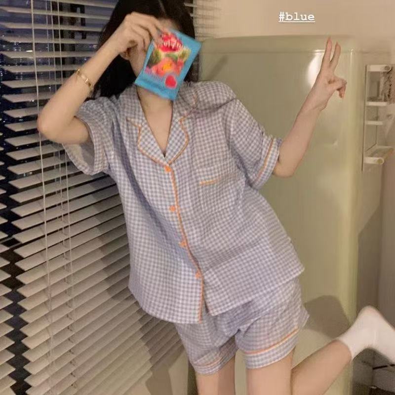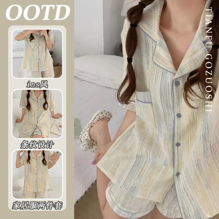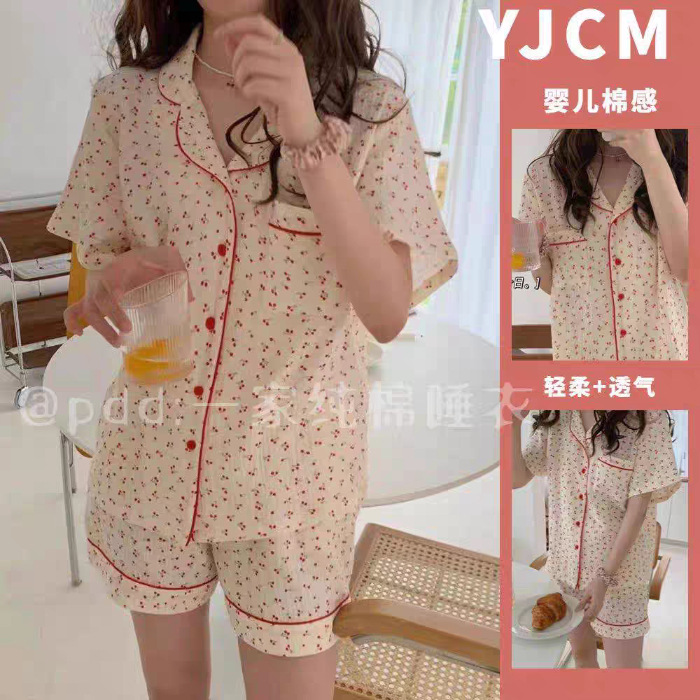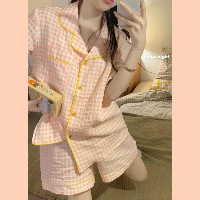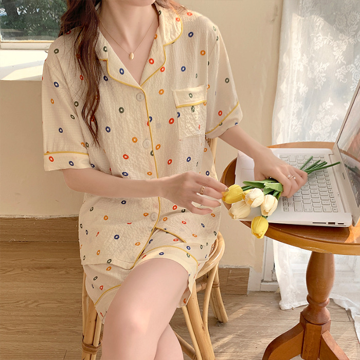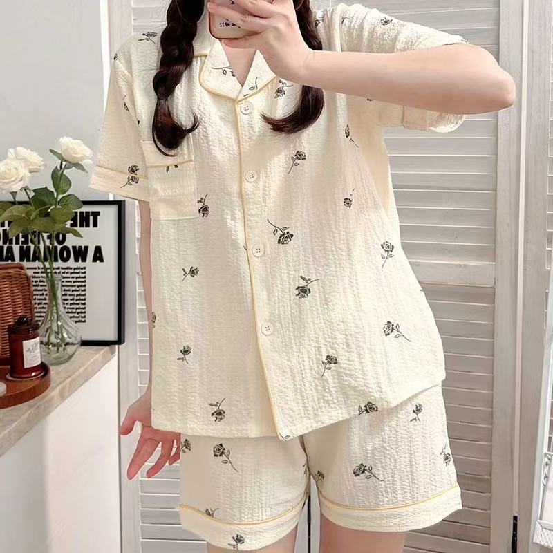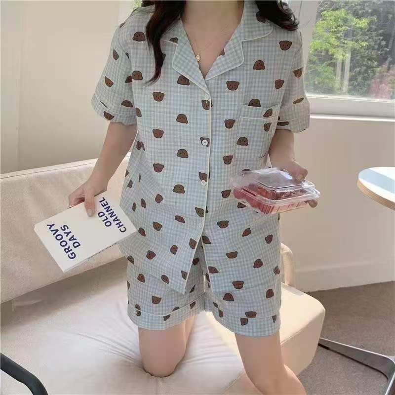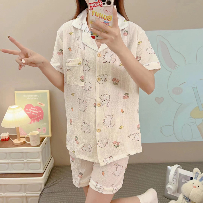여성용 여름 잠옷, 폴리에스터 폼 크레이프 원단, 인스 스타일 공주풍 반팔 여름 얇은 홈웨어 세트, 만화 디자인스토어 가기