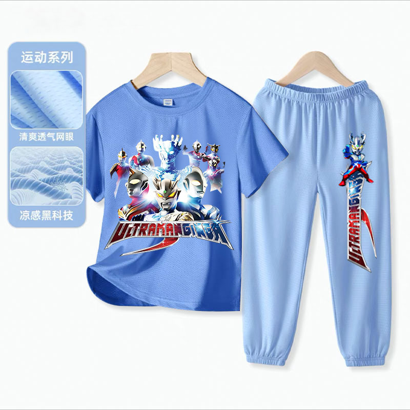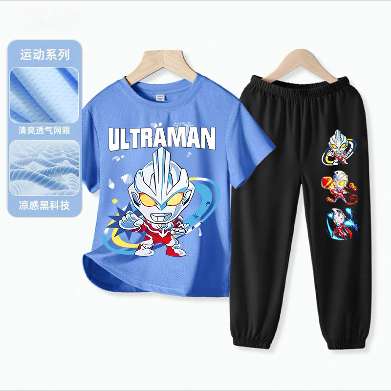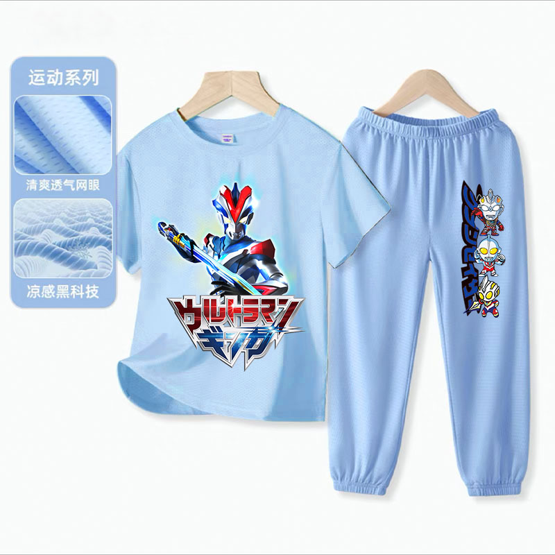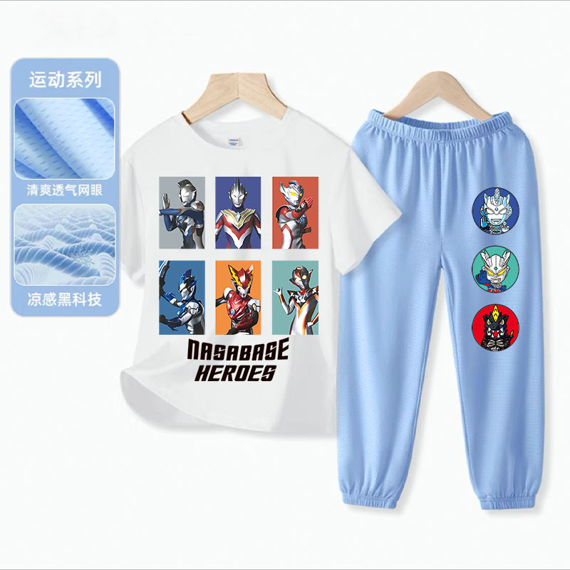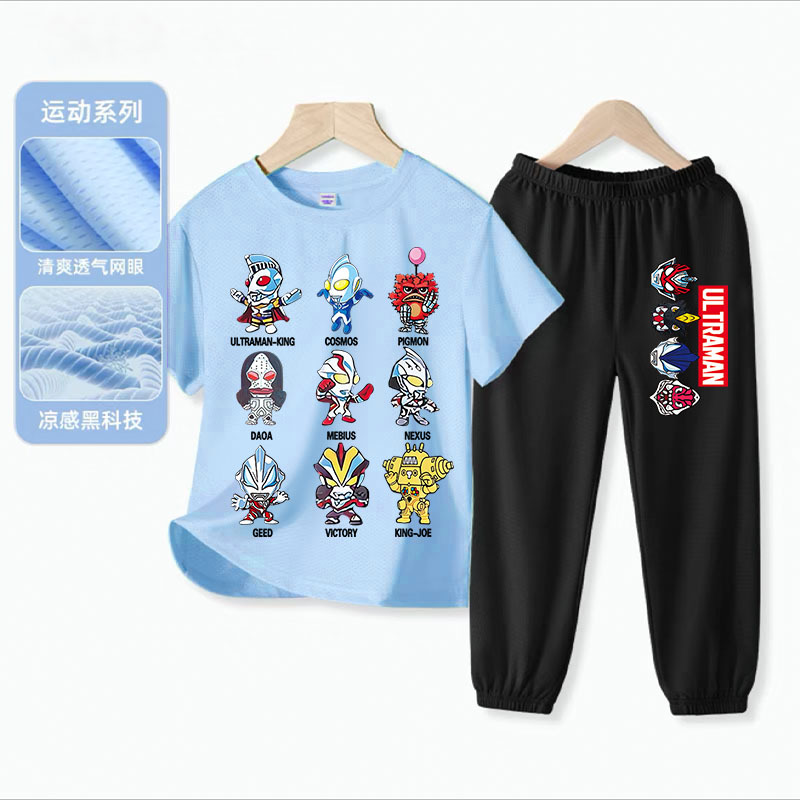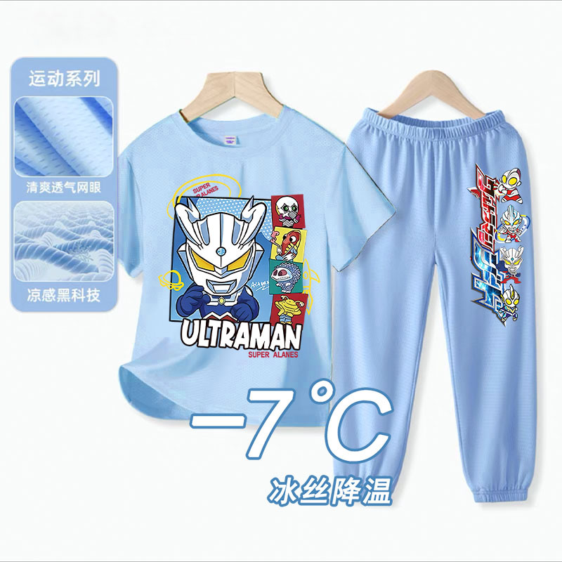 울트라 맨 소년 아이스 실크 반팔 세트 아기 소년 빠른 건조 여름 얇은 어린이 스포츠 옷 모기 방지 바지스토어 가기