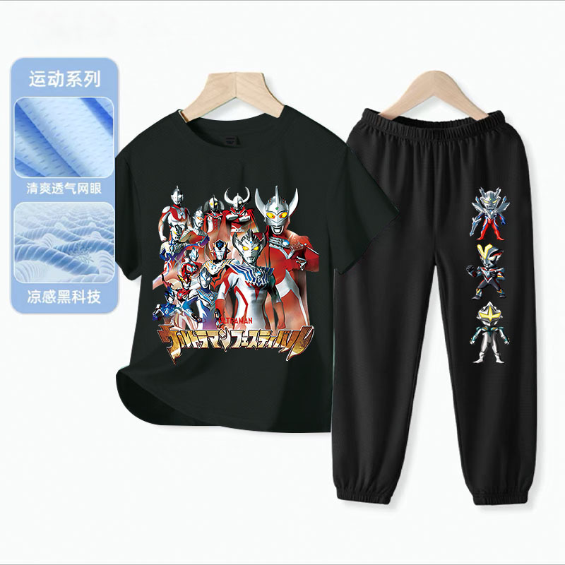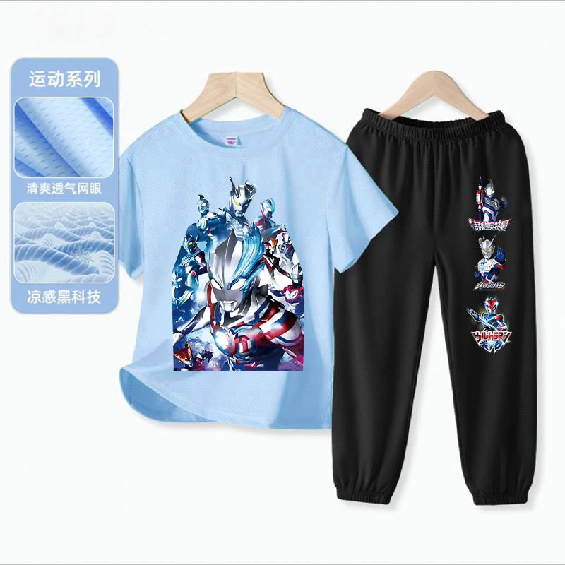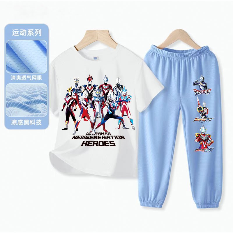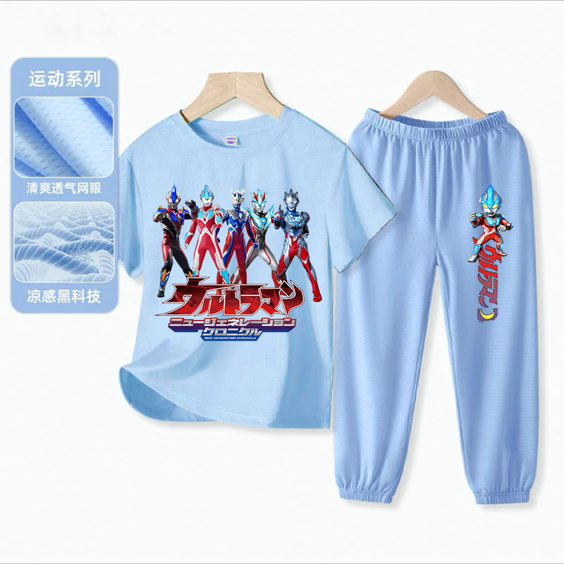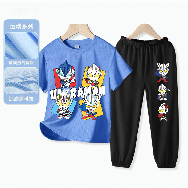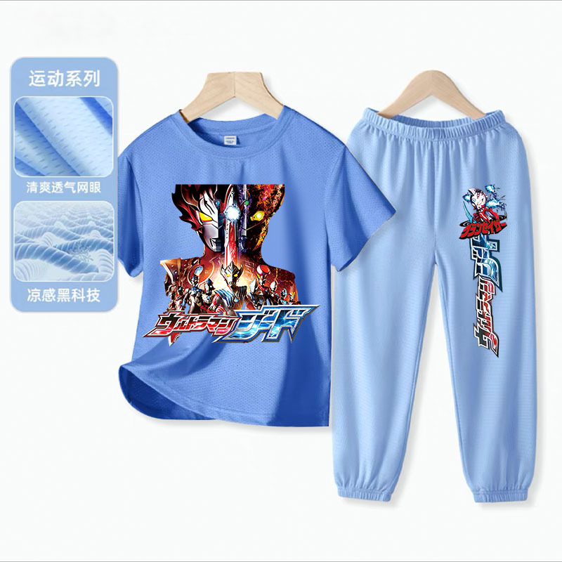울트라 맨 소년 아이스 실크 반팔 세트 아기 소년 빠른 건조 여름 얇은 어린이 스포츠 옷 모기 방지 바지스토어 가기
