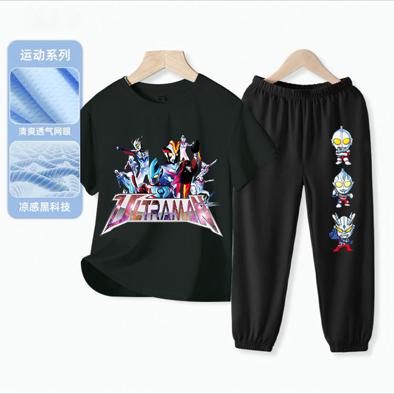 울트라 맨 소년 아이스 실크 반팔 세트 아기 소년 빠른 건조 여름 얇은 어린이 스포츠 옷 모기 방지 바지