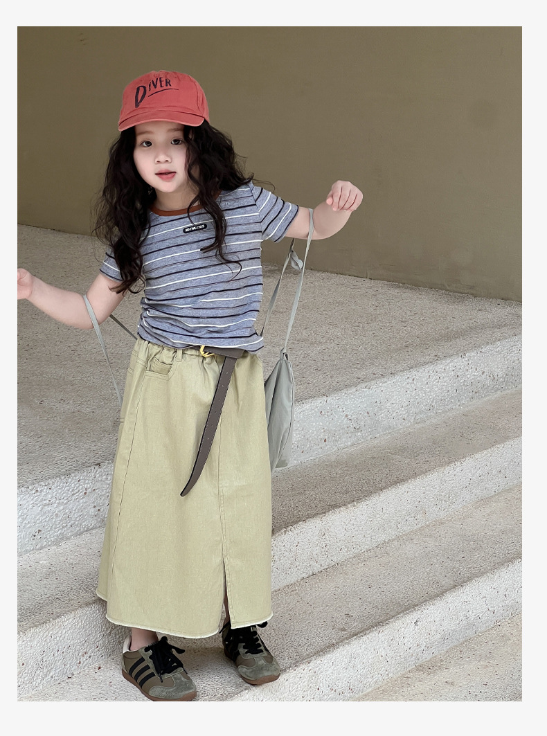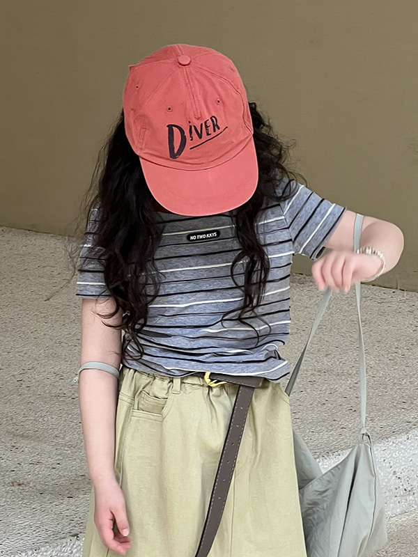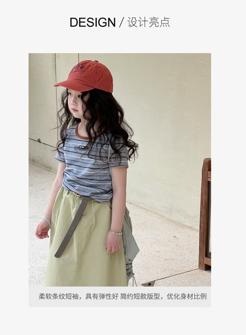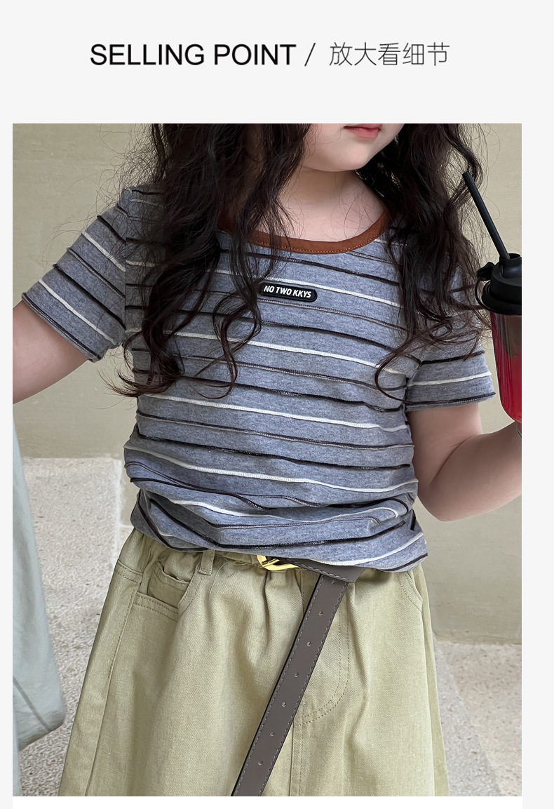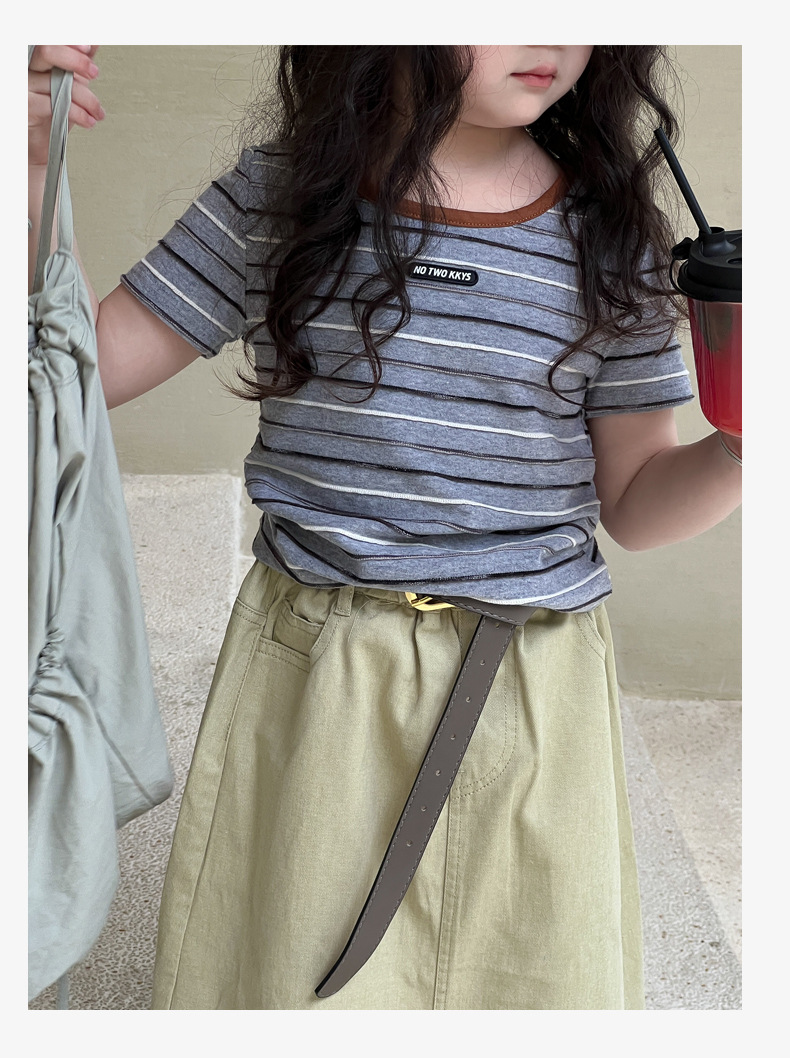여아용 한국 스타일 티셔츠 2025 여름 신상 아동용 세련된 입체 스트라이프 반팔 중대형 아동용 패셔너블 여름옷 트렌디 티셔츠