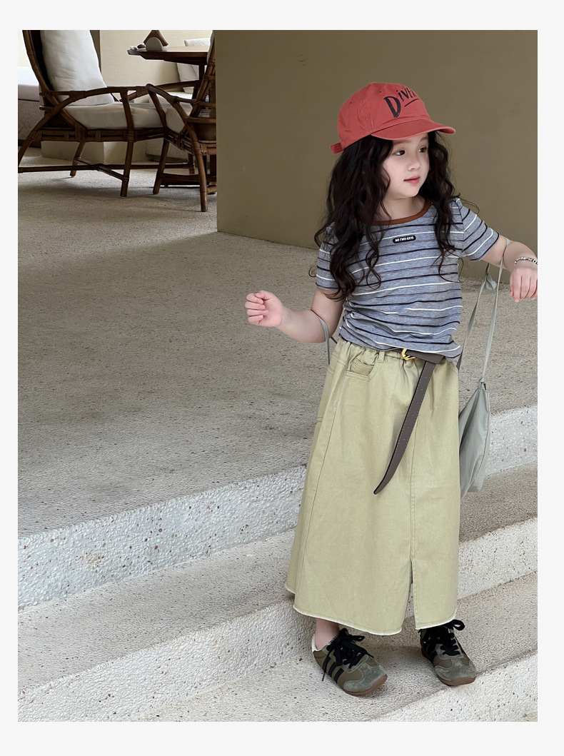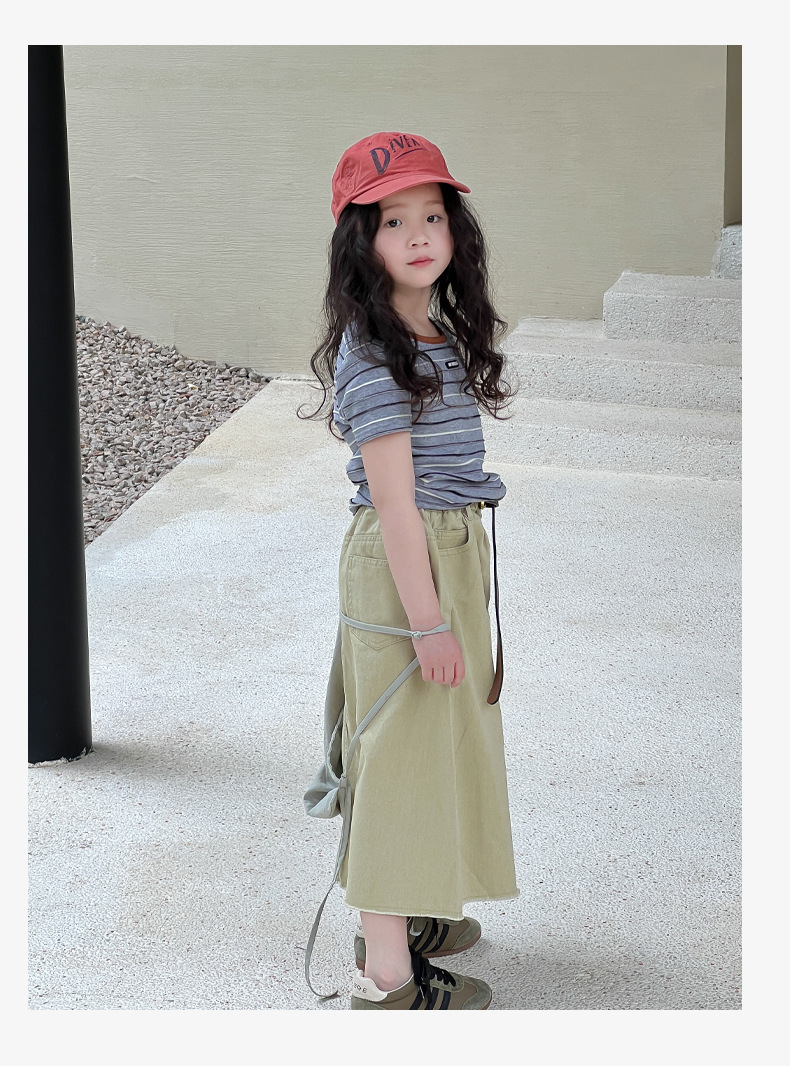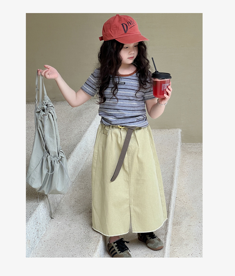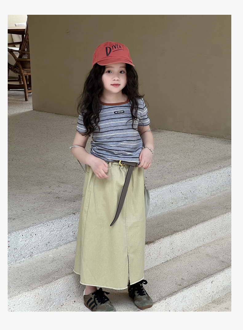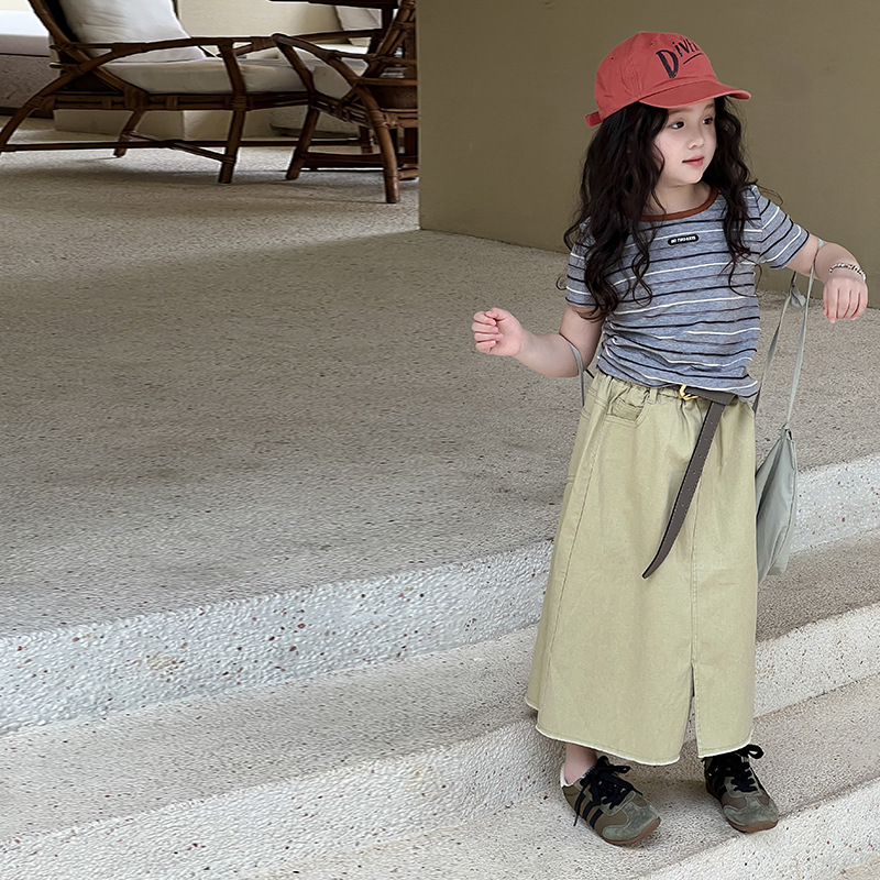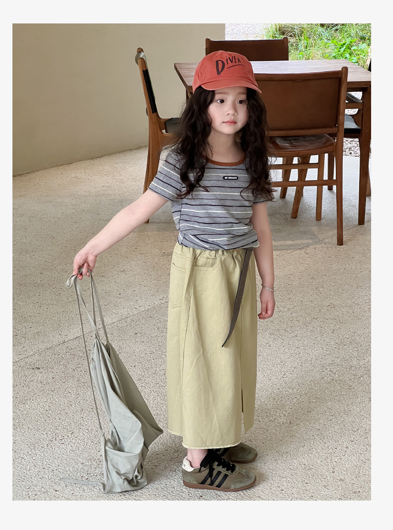 여아용 한국 스타일 티셔츠 2025 여름 신상 아동용 세련된 입체 스트라이프 반팔 중대형 아동용 패셔너블 여름옷 트렌디 티셔츠