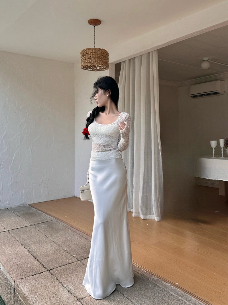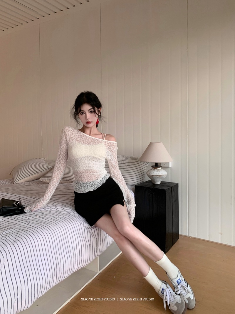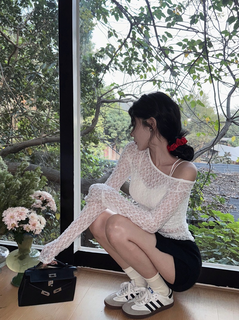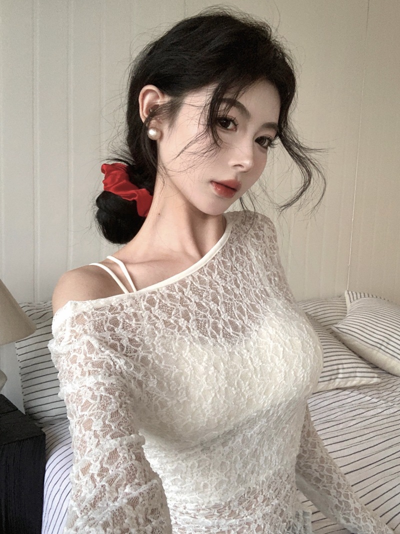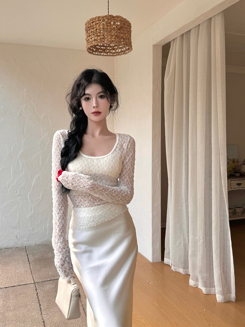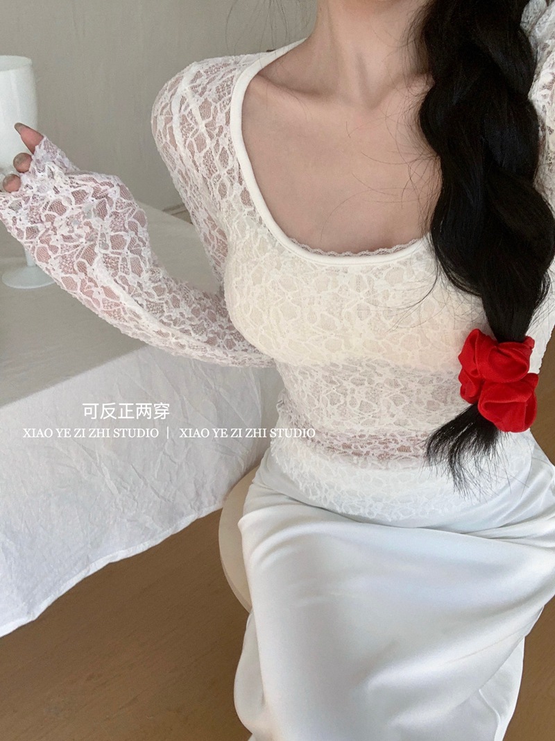 프랑스 빈티지 크로 셰 뜨개질 레이스 U-넥 긴 소매 레이스 셔츠 여성의 여름 새로운 뜨거운 소녀 섹시한 관점 슬림 탑
