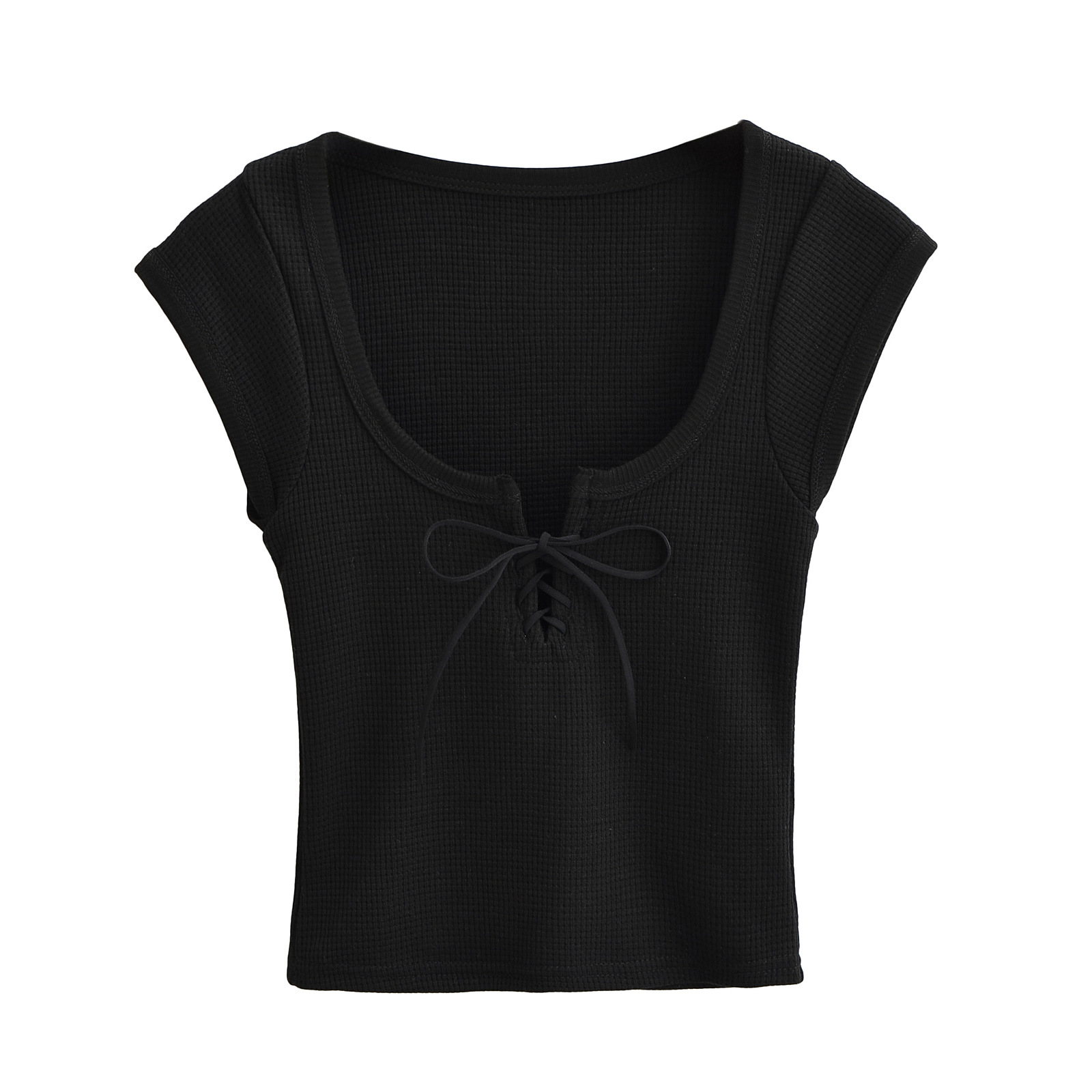 와플 대형 U 넥 스트랩 반팔 티셔츠 여성용 2024 년 여름 새 달콤한 스파이스 소녀 슬림 핏 쇼트 크롭 탑