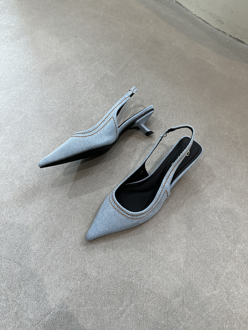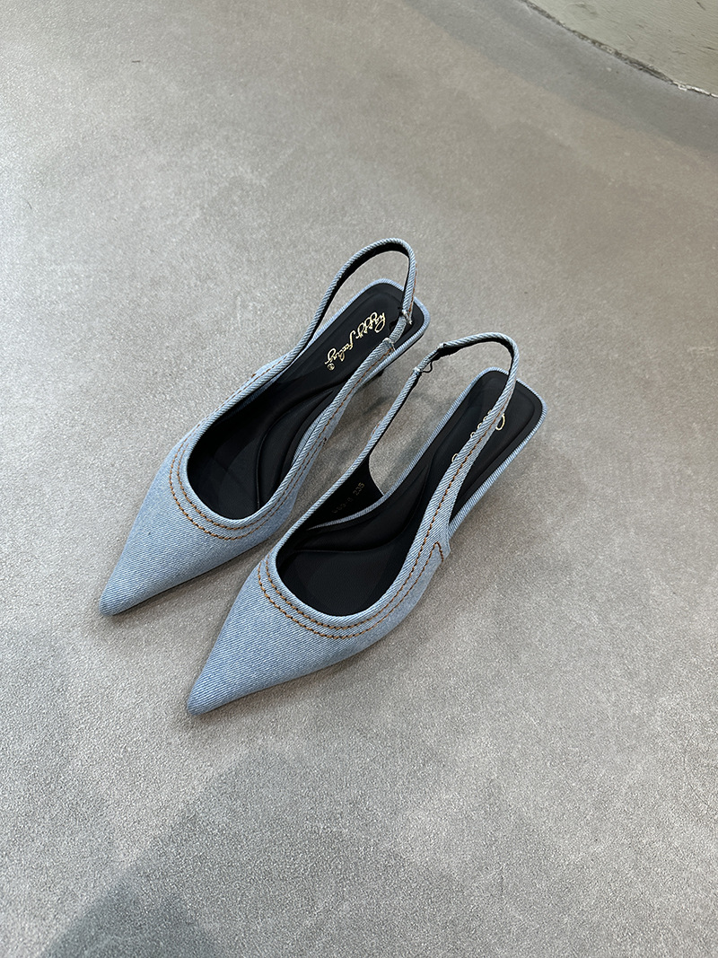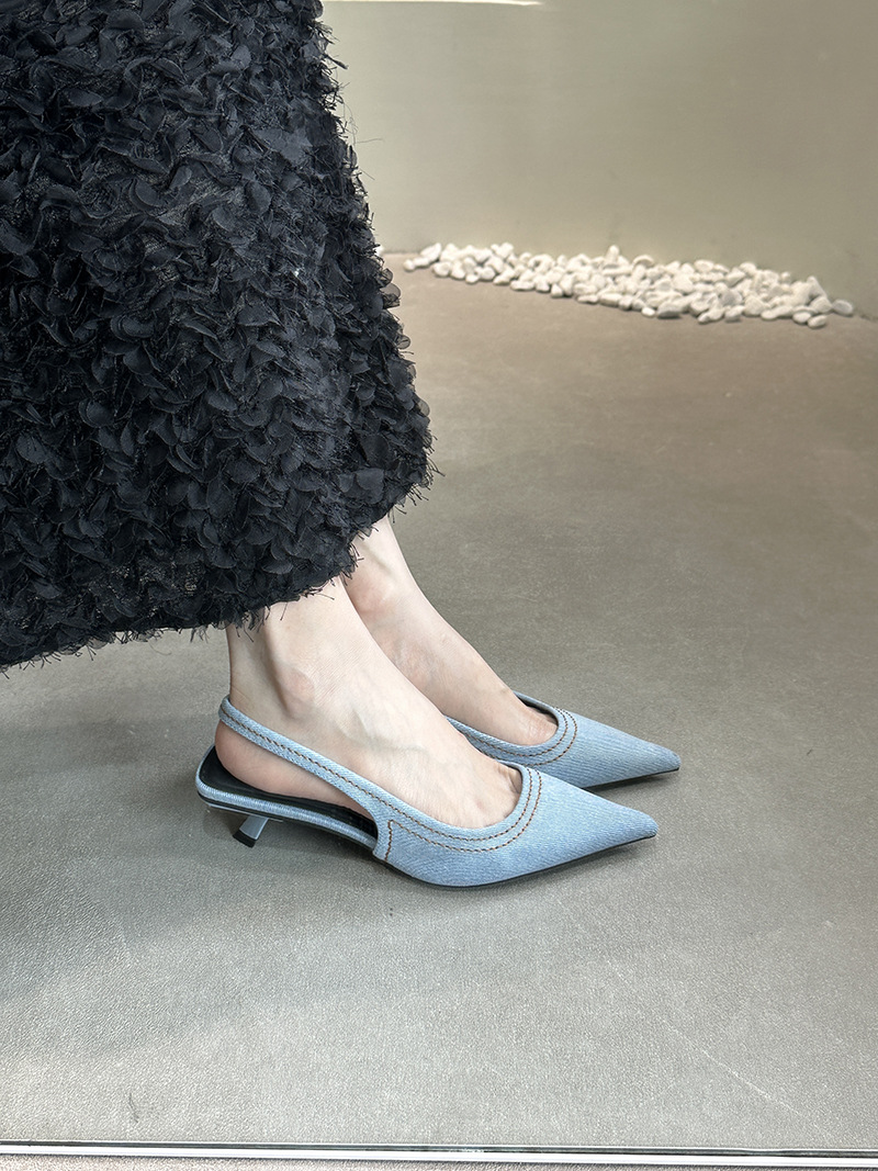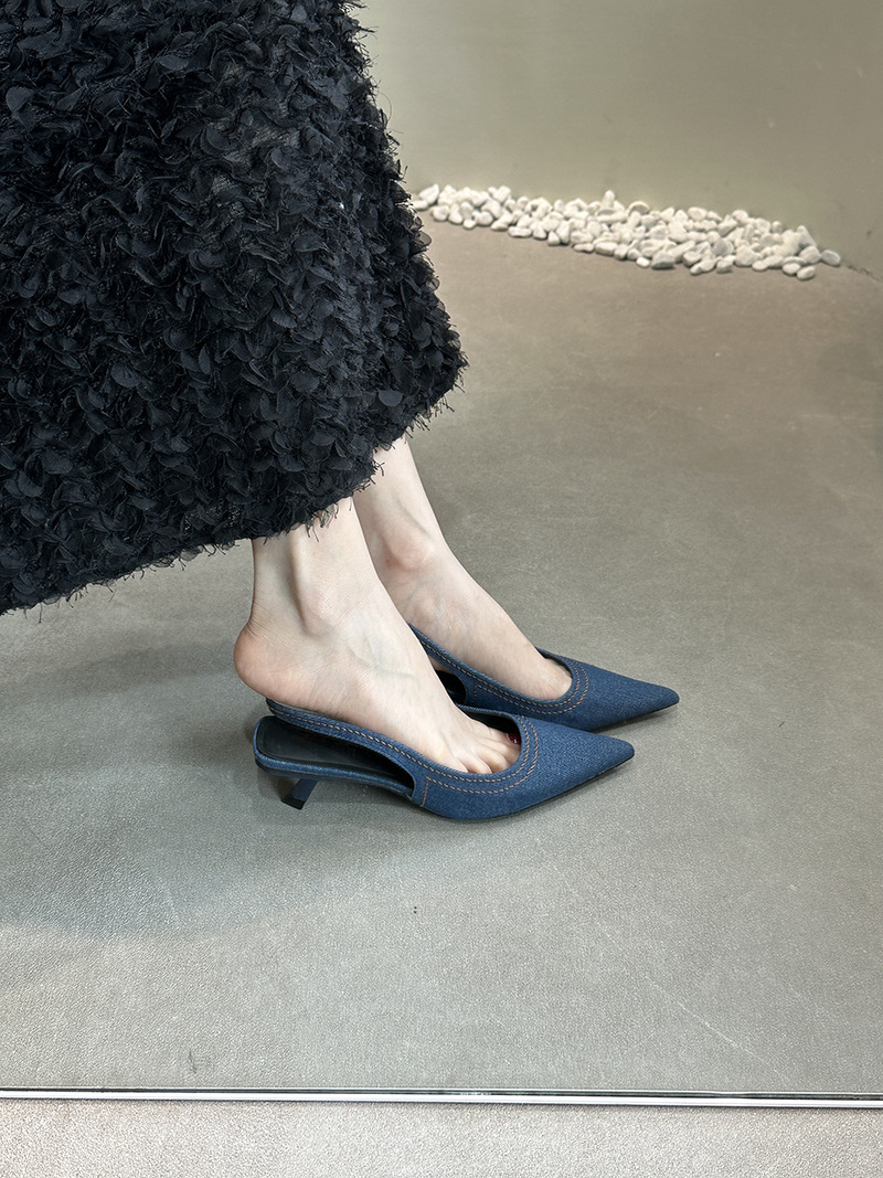 프랑스 스틸레토 힐 뾰족한 선체 샌들 여성 신발 요정 신발 여름 데님 발가락 고양이 힐 뮬러 펌프
