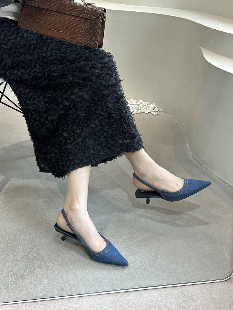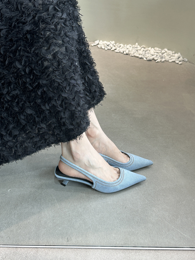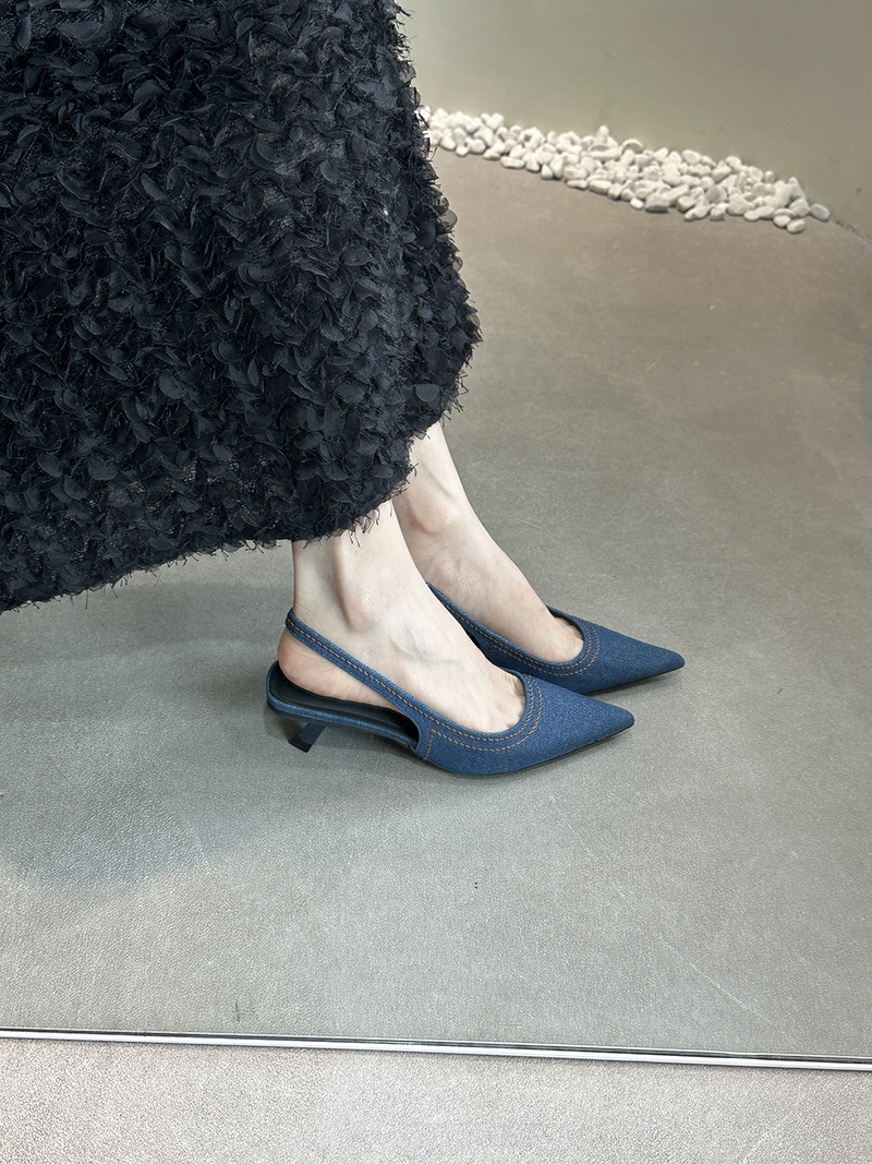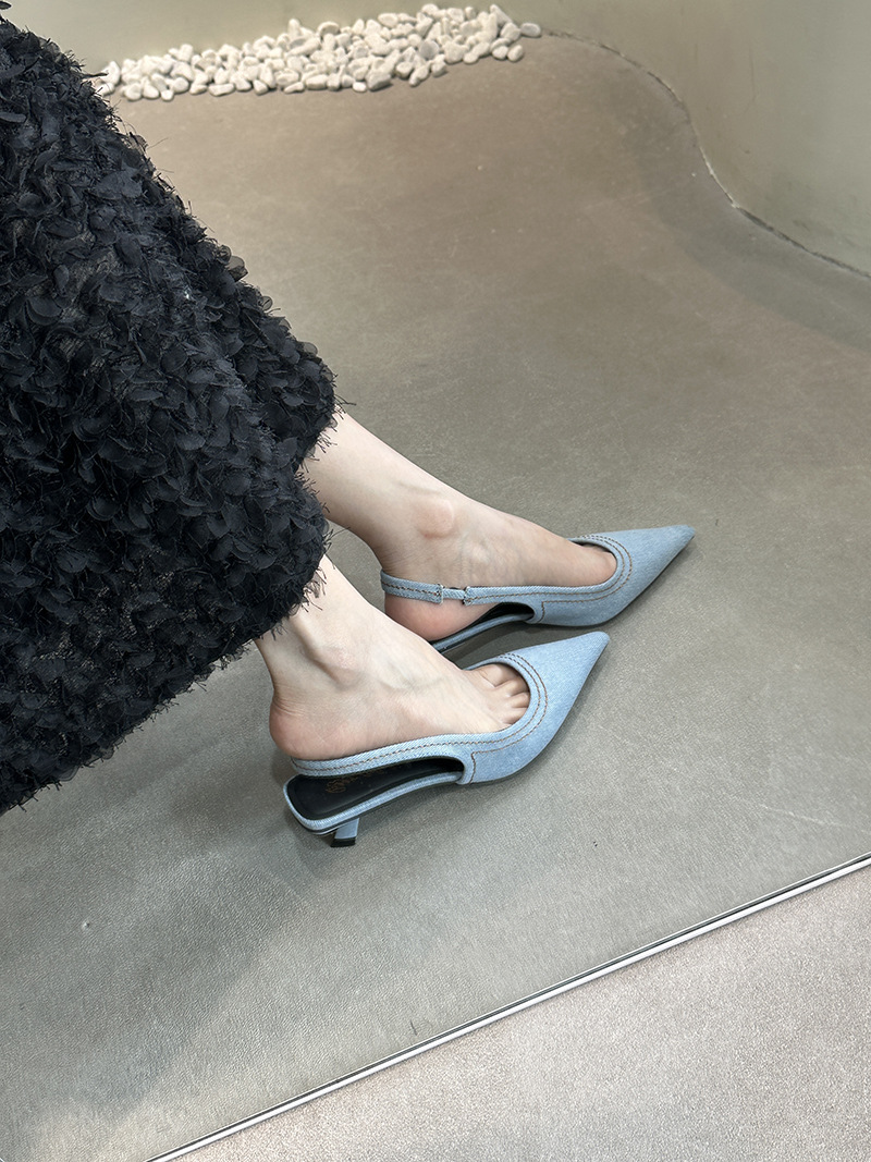 프랑스 스틸레토 힐 뾰족한 선체 샌들 여성 신발 요정 신발 여름 데님 발가락 고양이 힐 뮬러 펌프