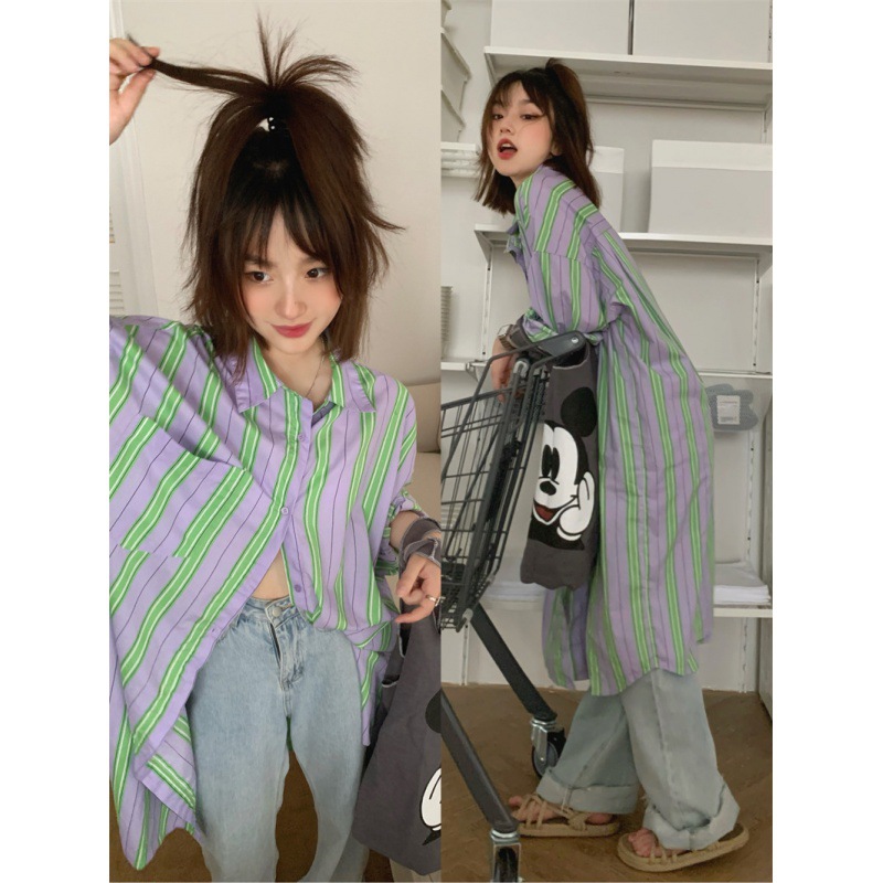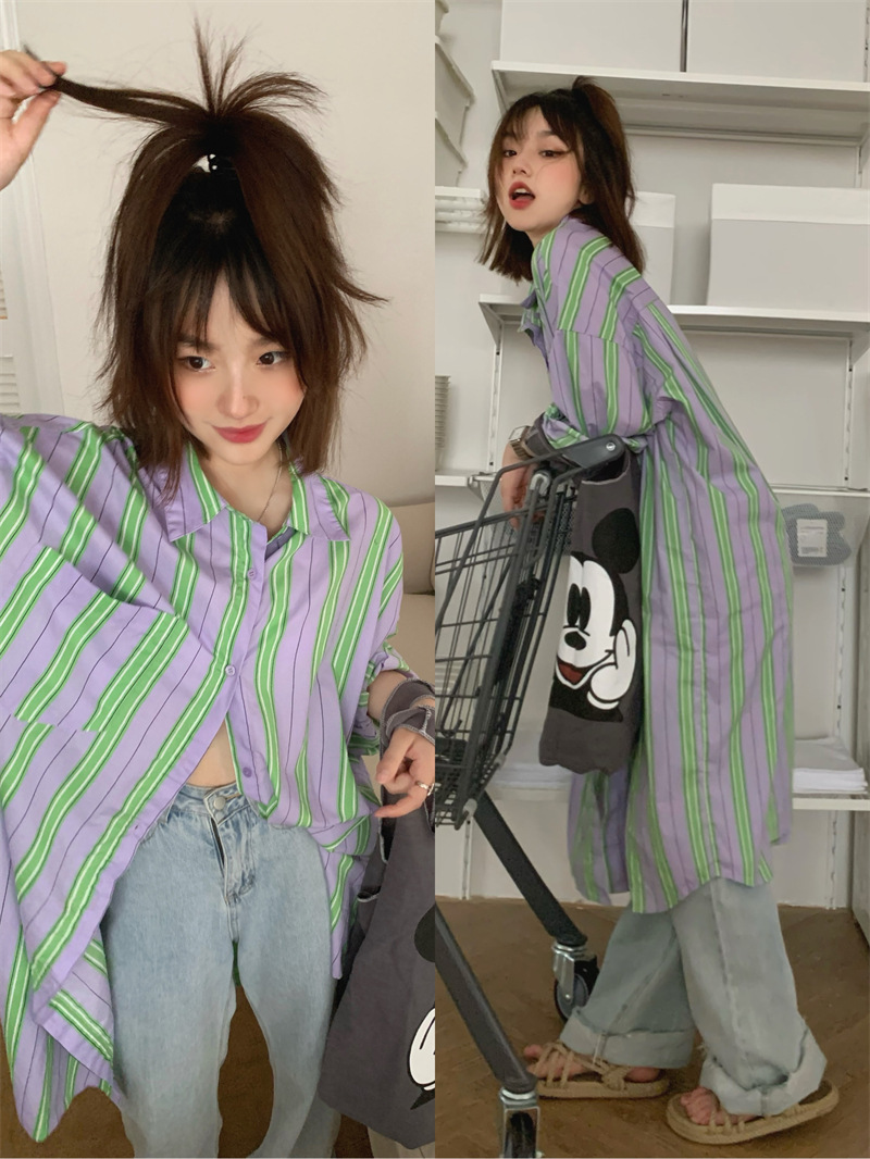 2024 봄 착용 블로거 착용 수직 스트라이프 느슨한 긴 태양 방지 콘트라스트 컬러 셔츠 긴소매 스트라이프 셔츠스토어 가기