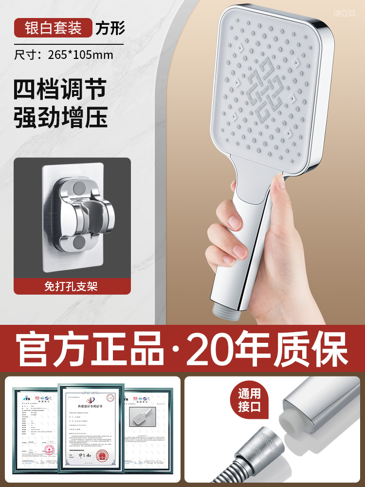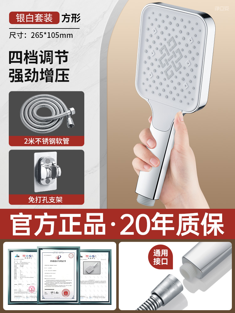 • 【실버 세트 5】 4단 수압 조절 샤워기 + 2m 방폭 호스 + 무타공 거치대⚑