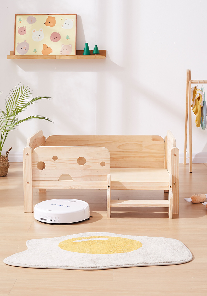 • 작은 원형 구멍 원목 침대 + 산뜻한 노란색 격자 무늬 얇은 매트 + 베개