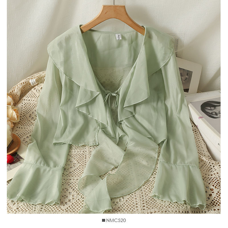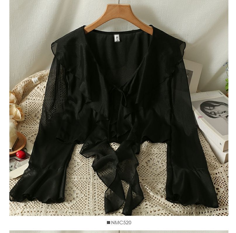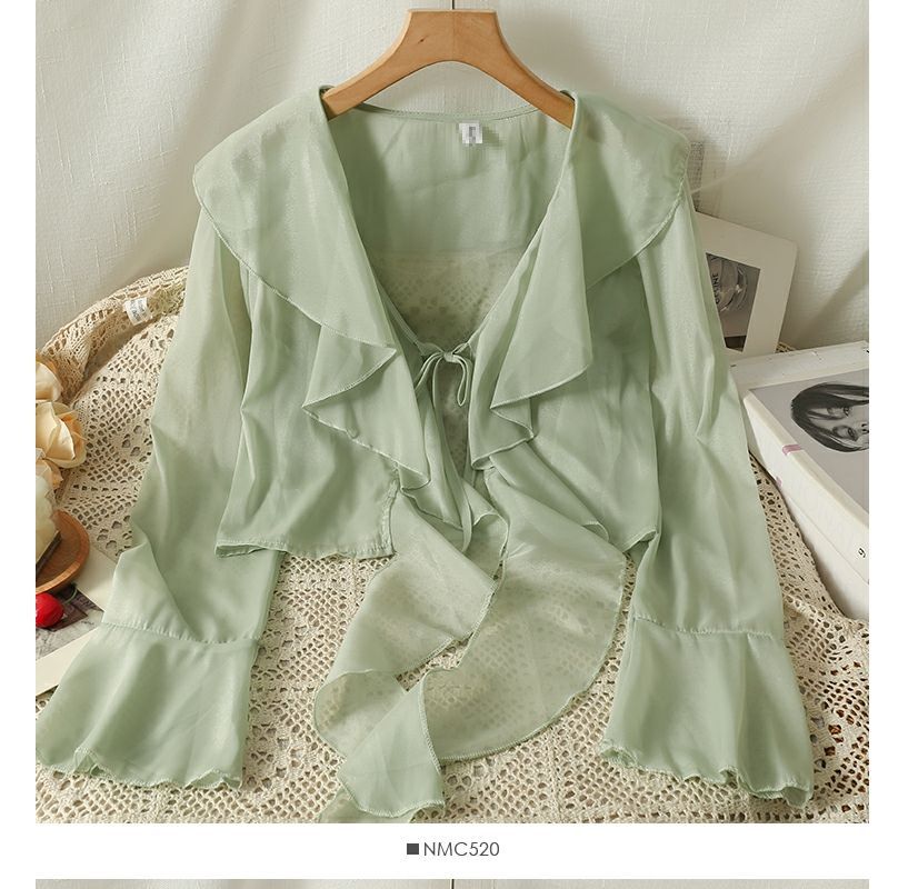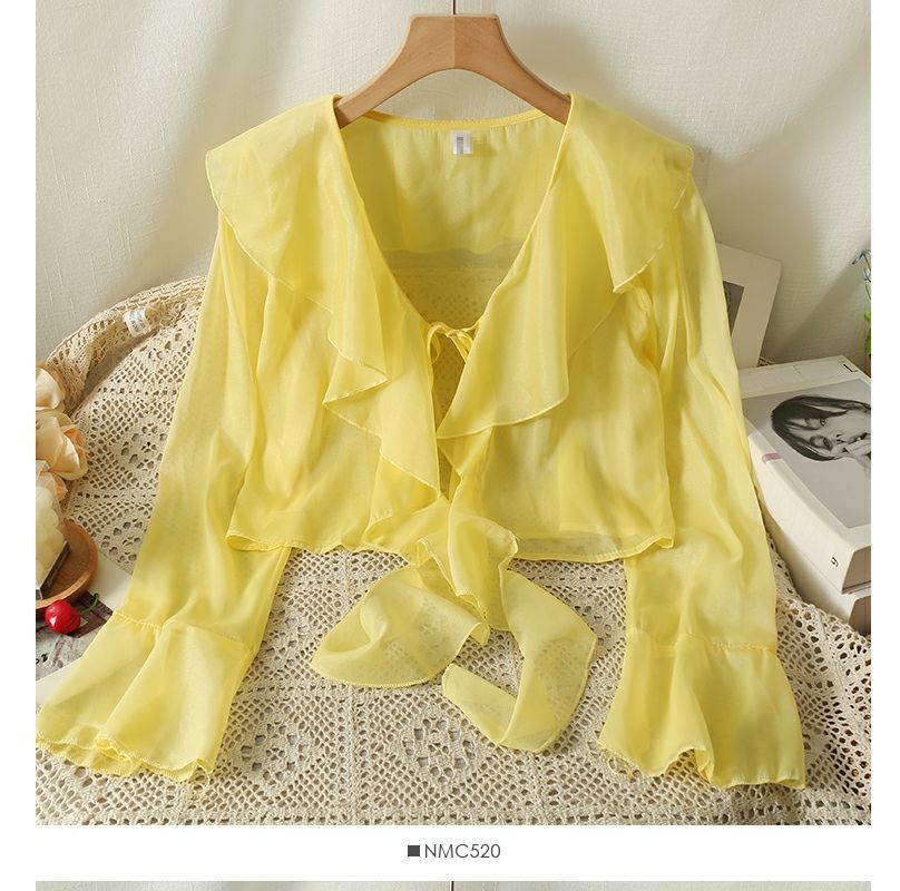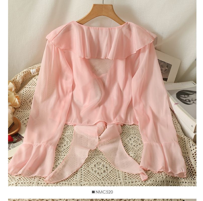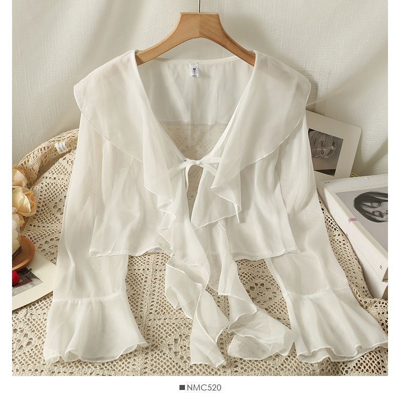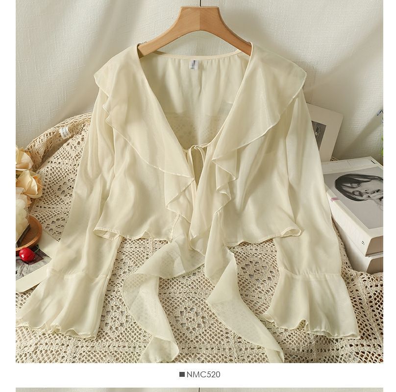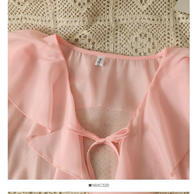 달콤한 러플 레이스 업 짧은 쉬폰 셔츠 여성용 여름 슬립 스커트 아우터 숄 작은 코트 선 스크린 블라우스