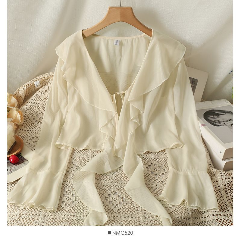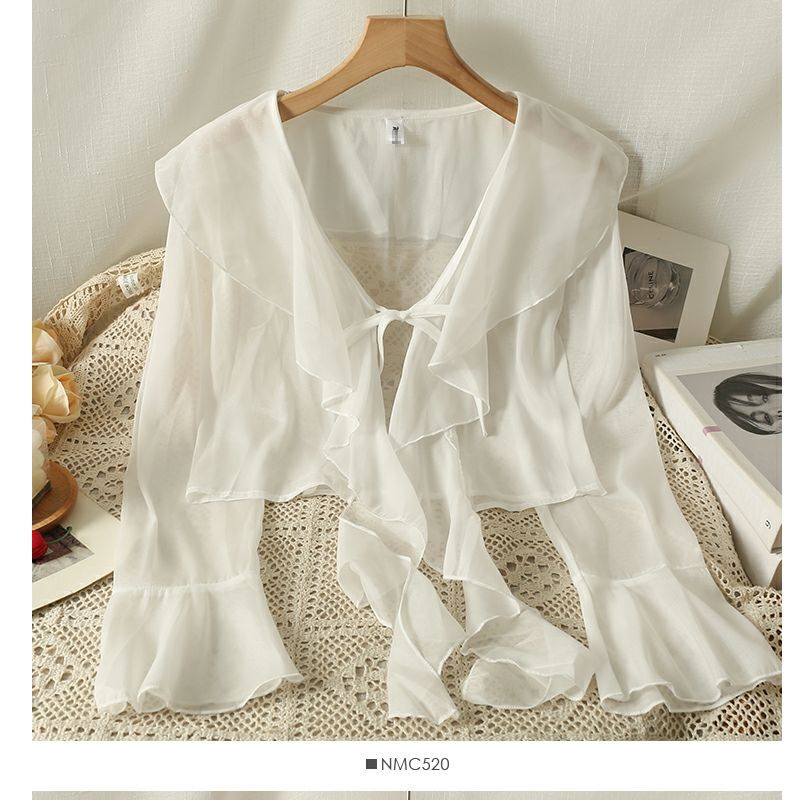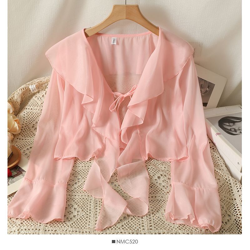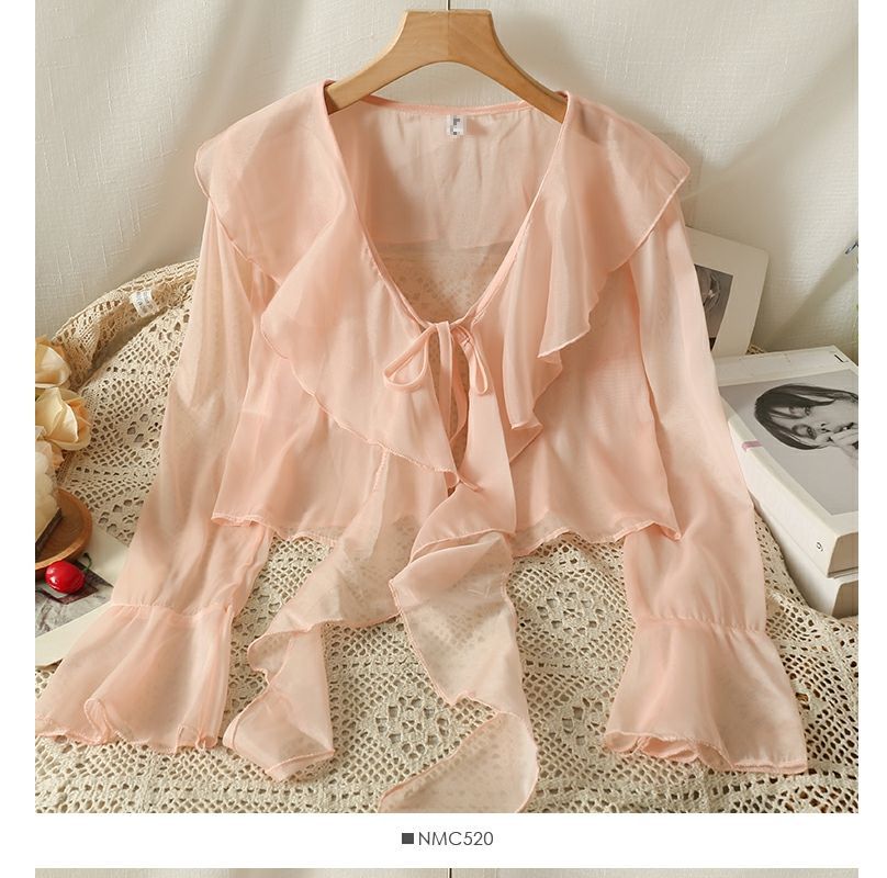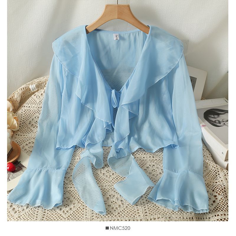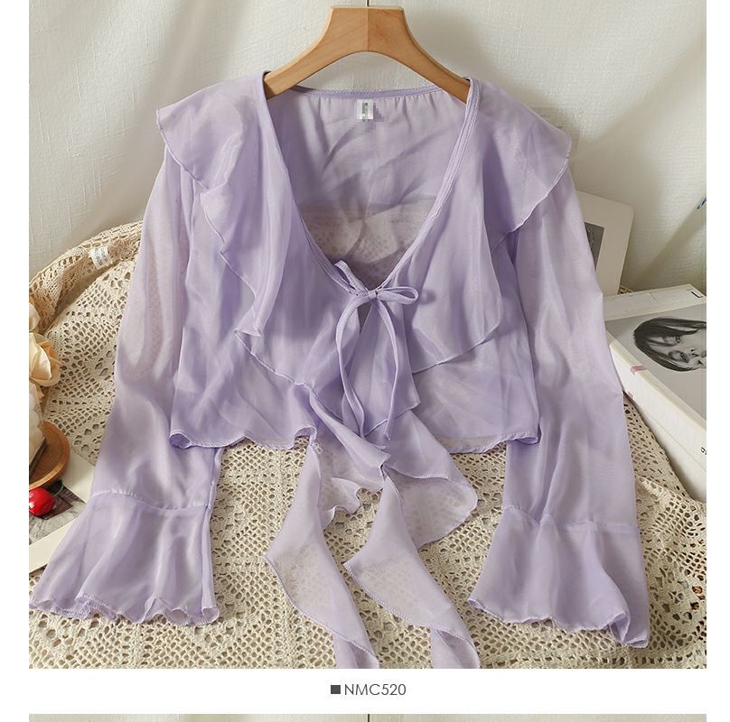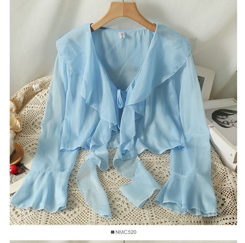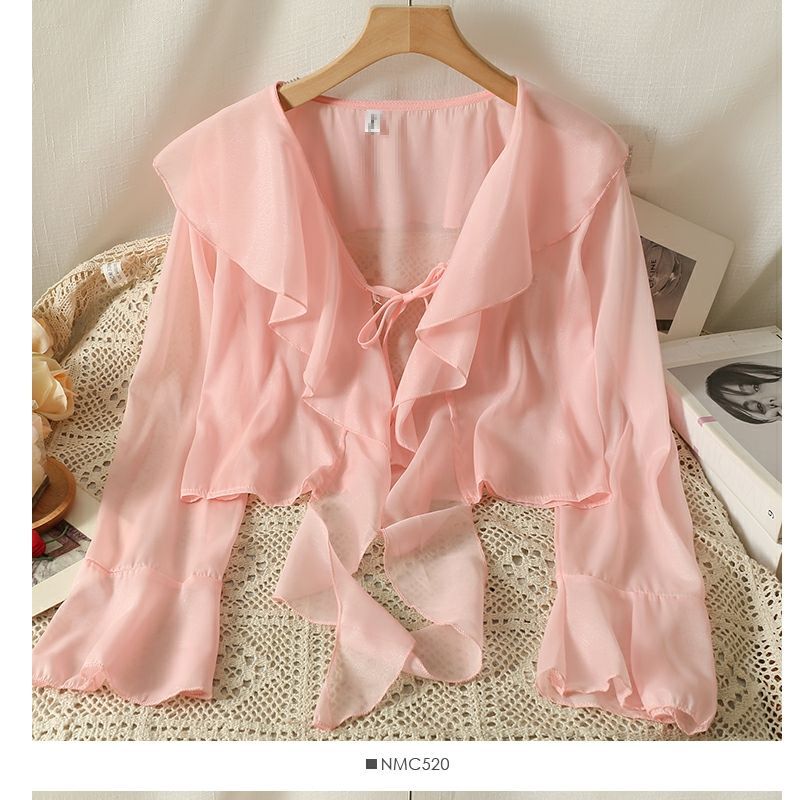 달콤한 러플 레이스 업 짧은 쉬폰 셔츠 여성용 여름 슬립 스커트 아우터 숄 작은 코트 선 스크린 블라우스스토어 가기