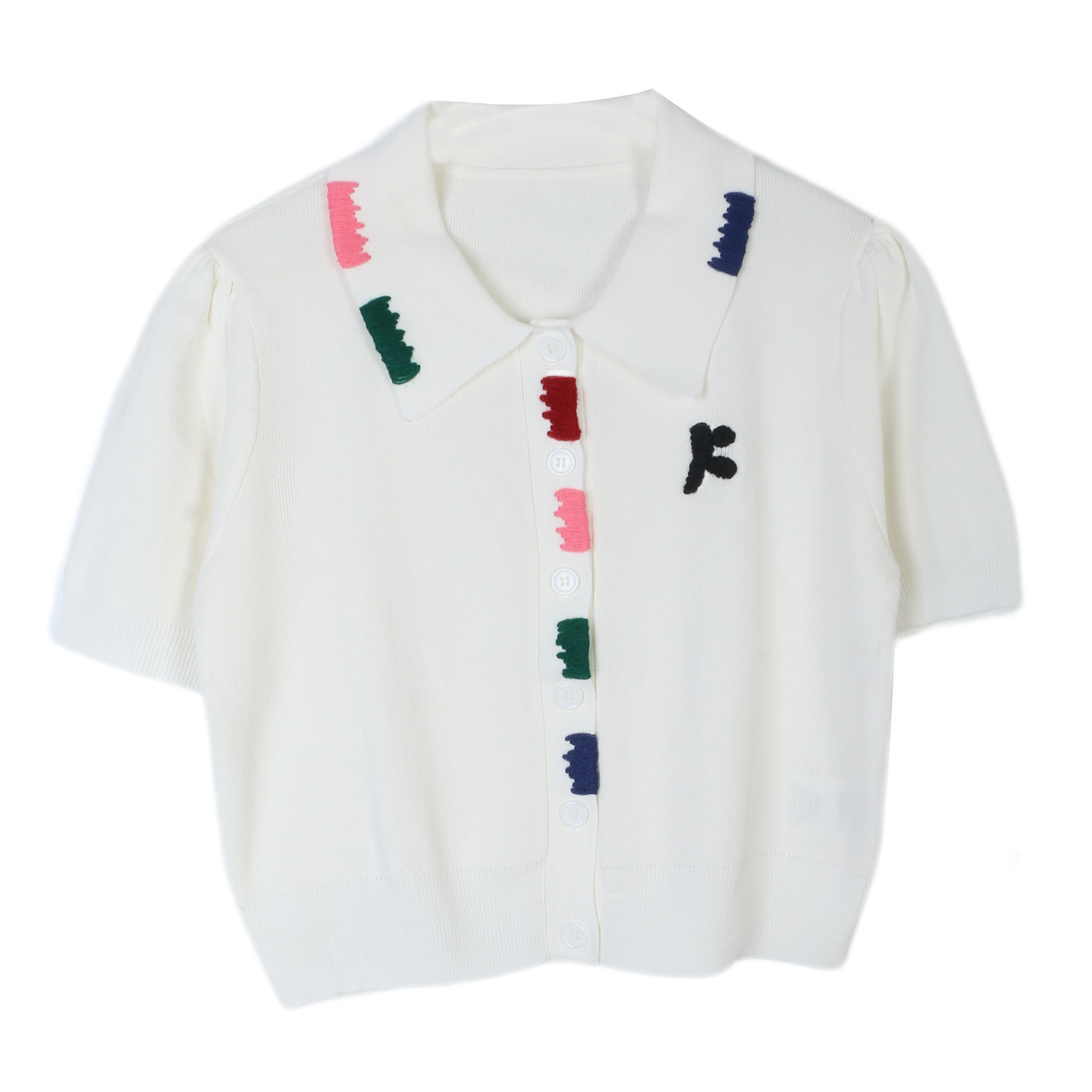 2024 봄과 여름 새로운 달콤한 니트 카디건 여성의 다채로운 중공업 핸드 훅 폴로 목 짧은 니트 카디건 탑