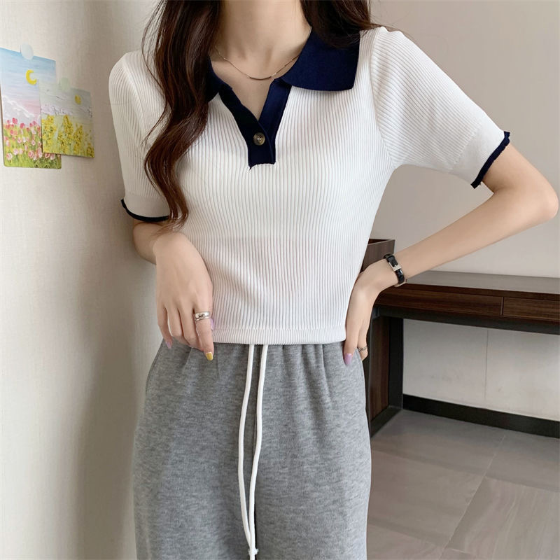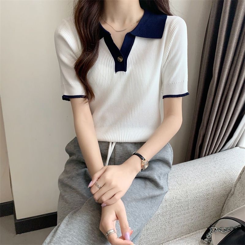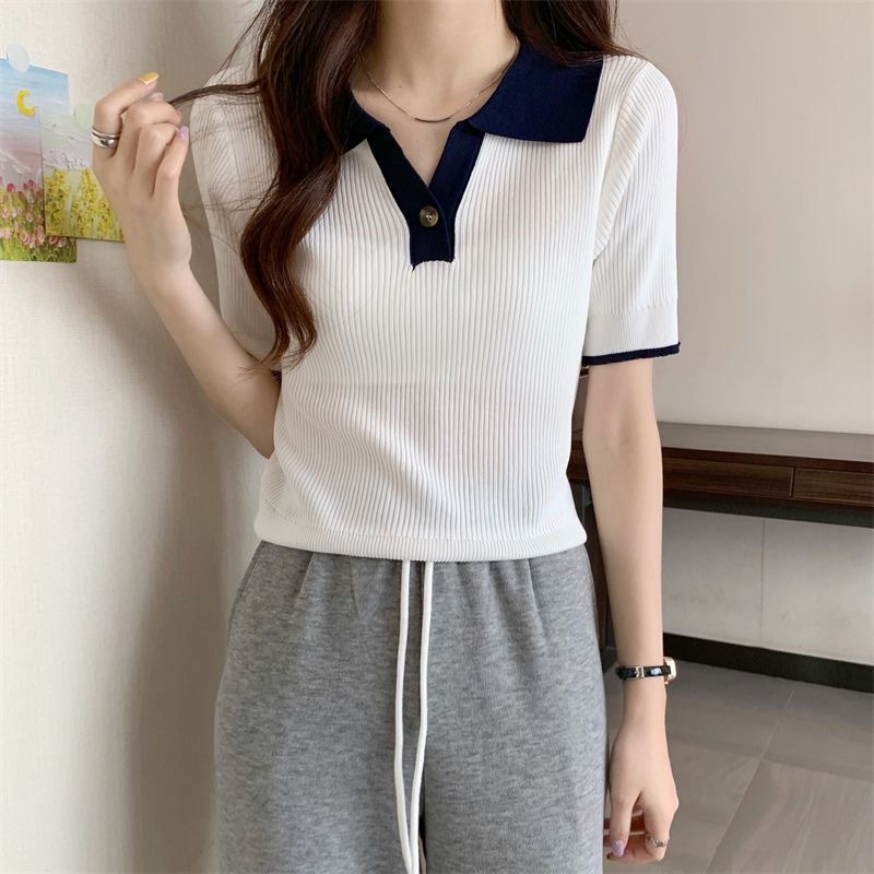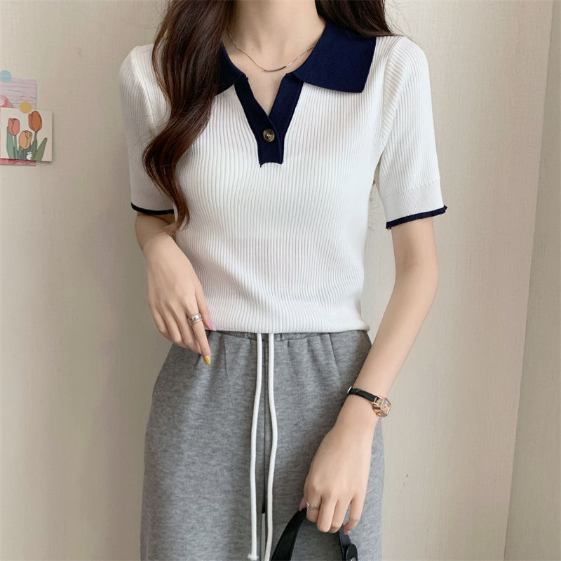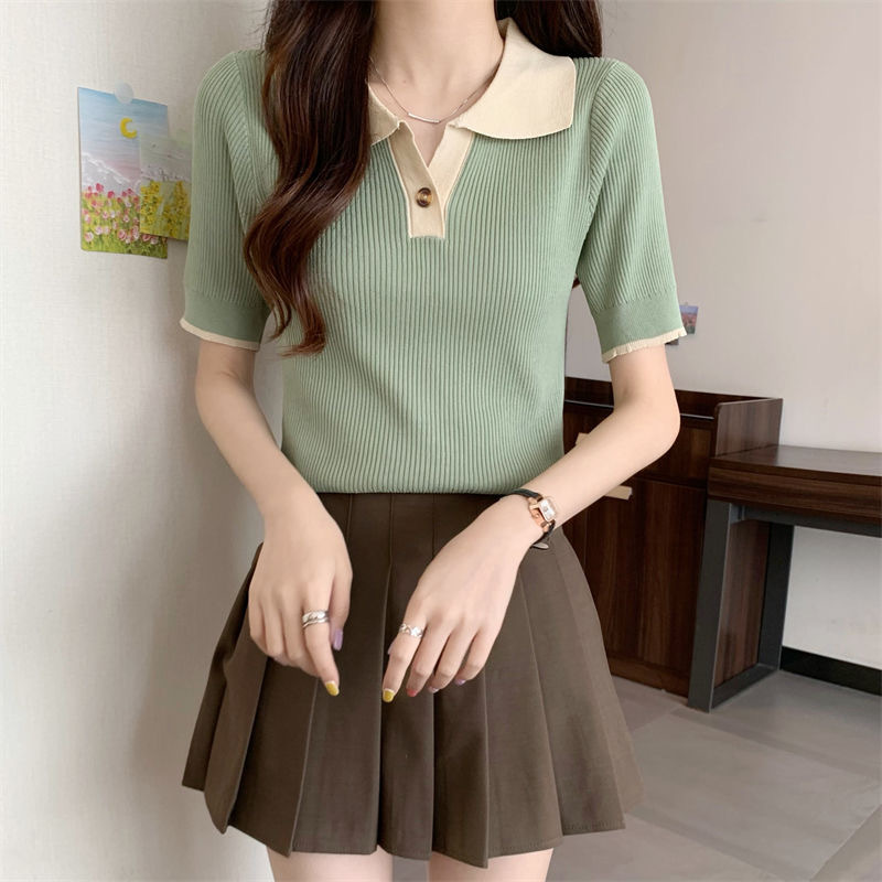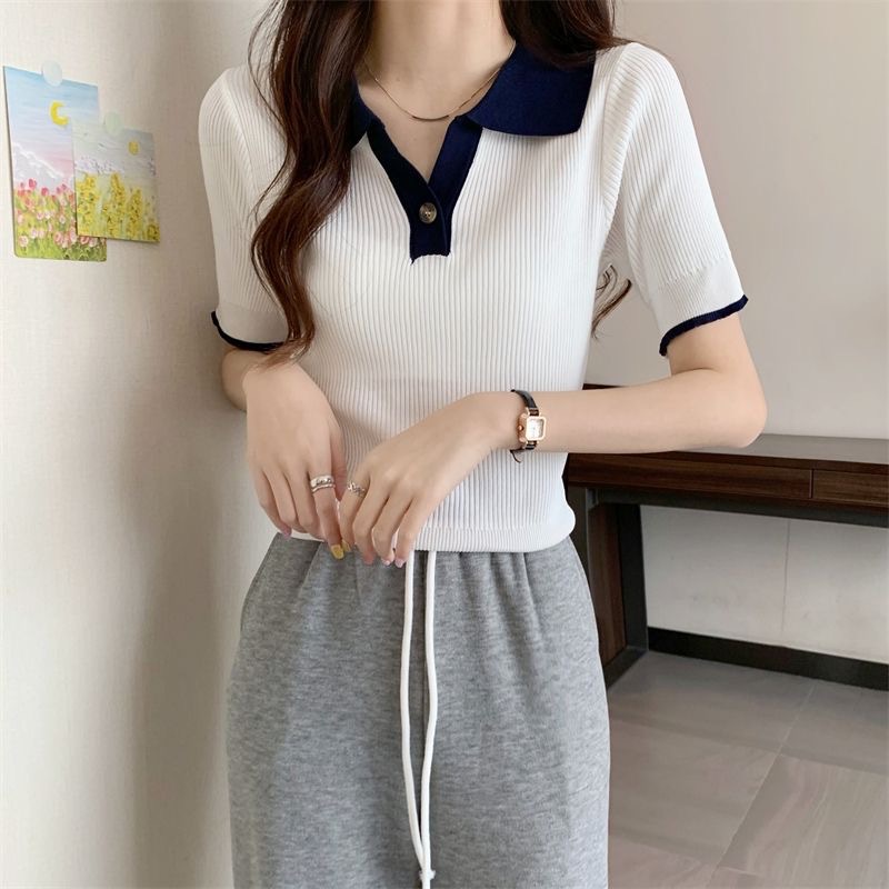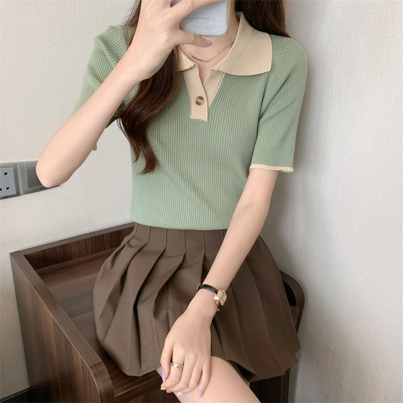 빈티지 라셀 콘트라스트 컬러 니트웨어 여성 한국식 여름 반팔 폴로 칼라 틈새 슬림 핏 얇은 톱 5 색스토어 가기