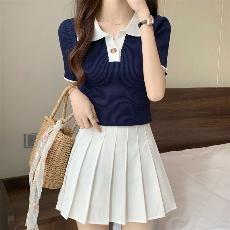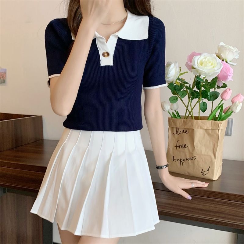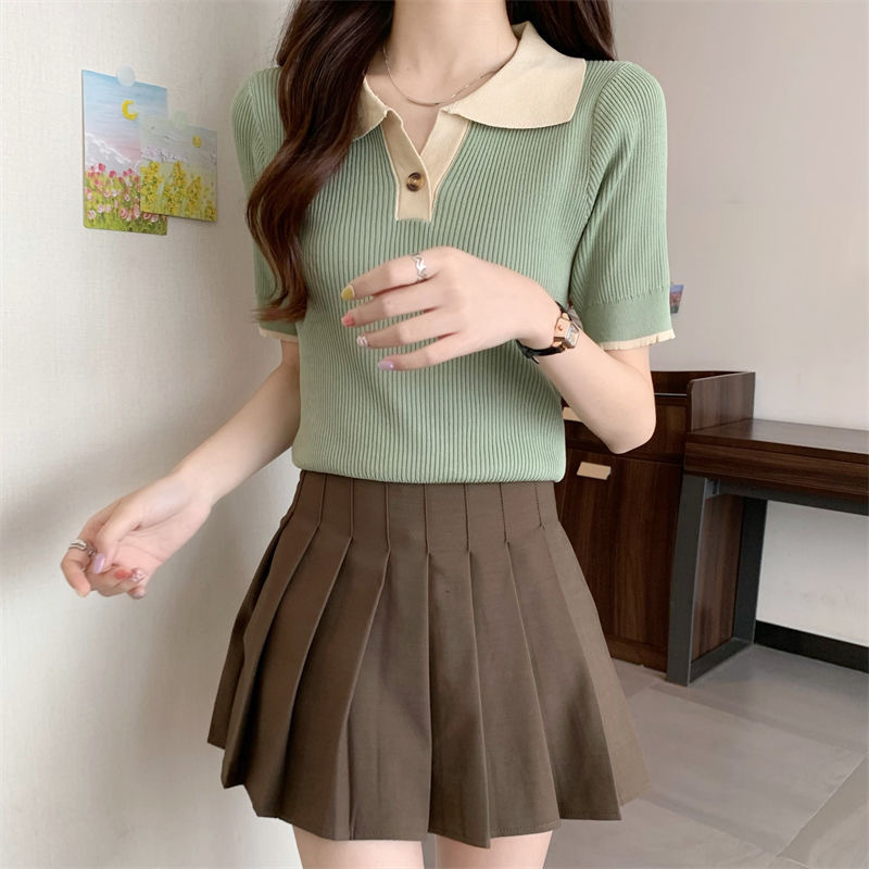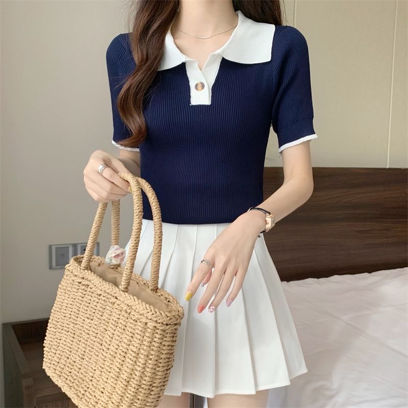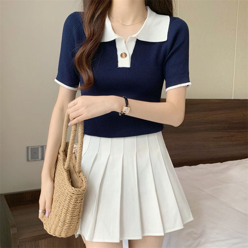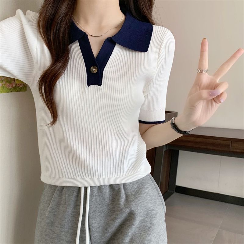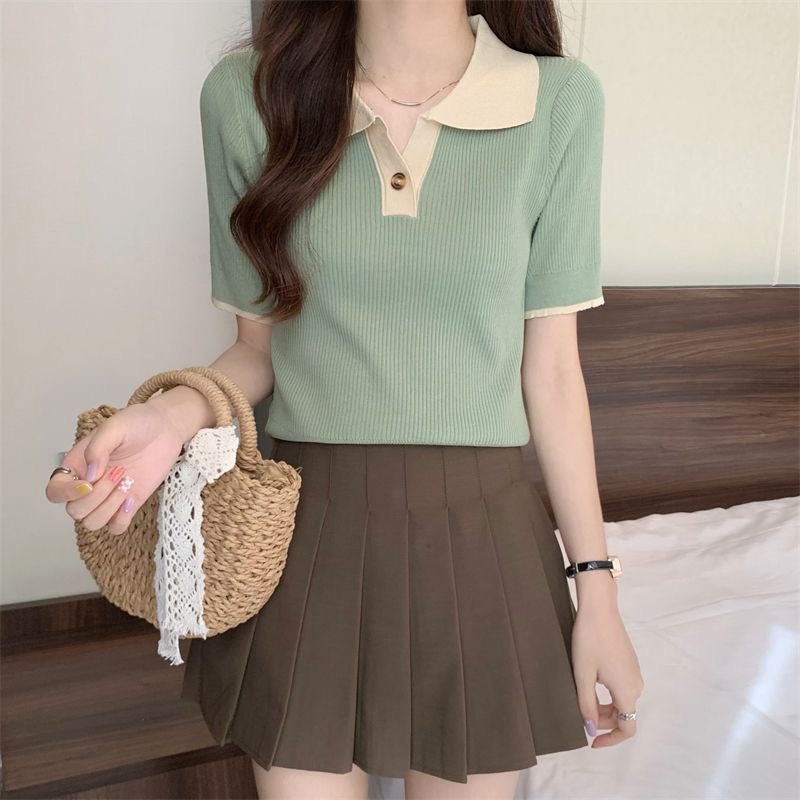 빈티지 라셀 콘트라스트 컬러 니트웨어 여성 한국식 여름 반팔 폴로 칼라 틈새 슬림 핏 얇은 톱 5 색스토어 가기