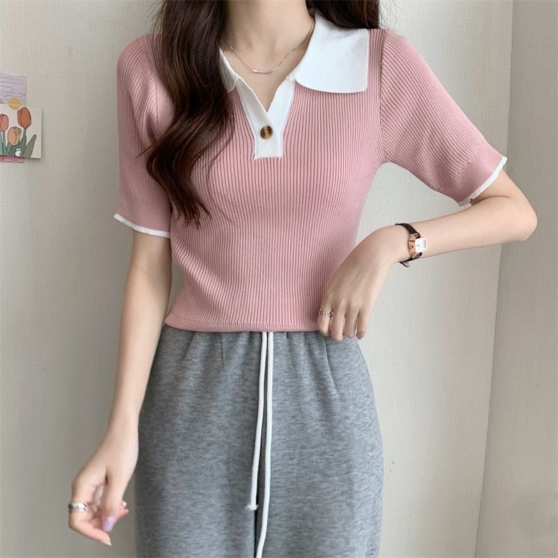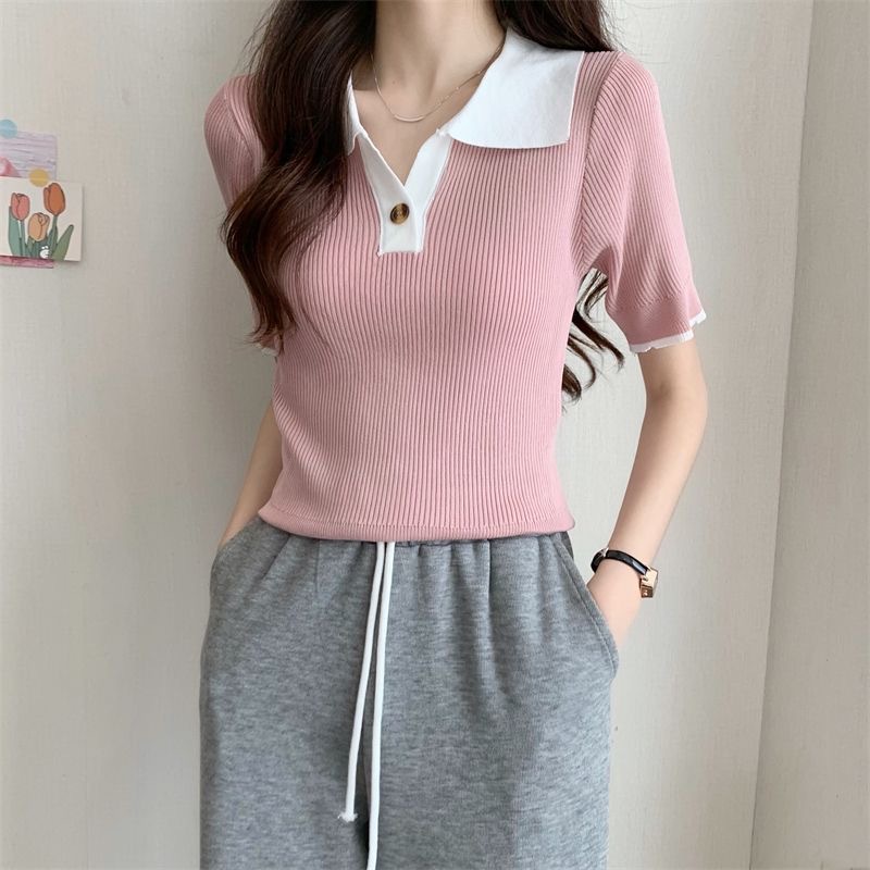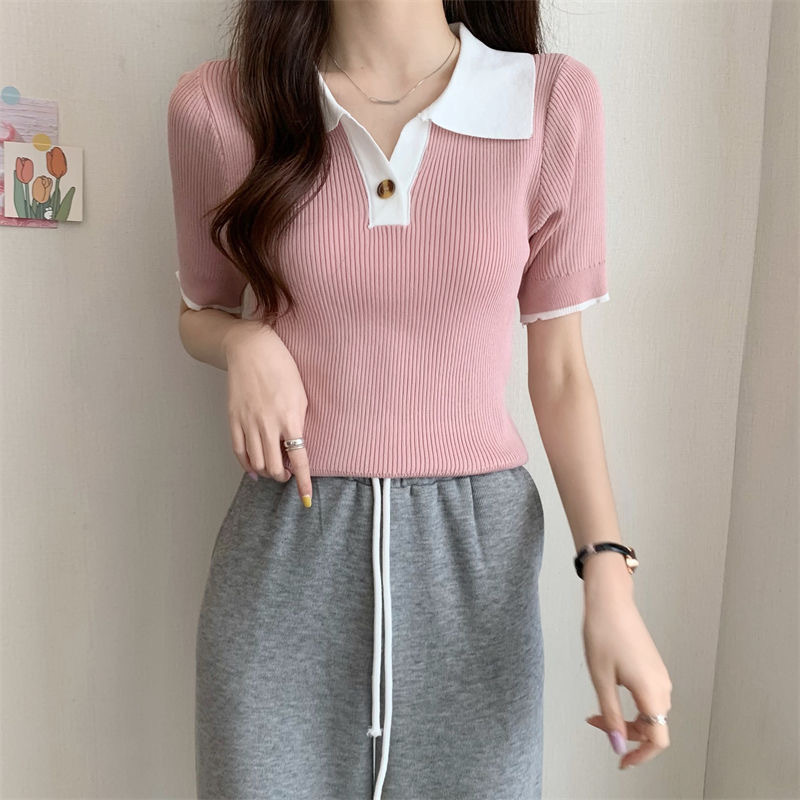 빈티지 라셀 콘트라스트 컬러 니트웨어 여성 한국식 여름 반팔 폴로 칼라 틈새 슬림 핏 얇은 톱 5 색
