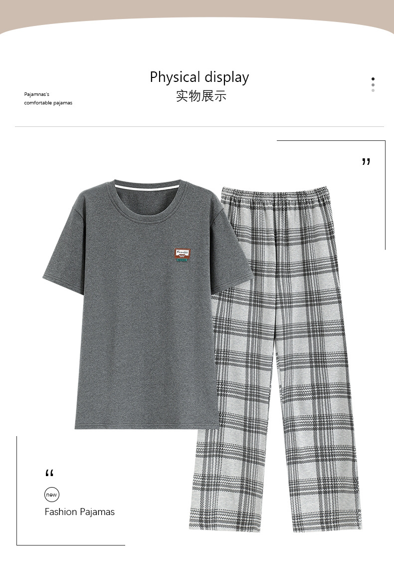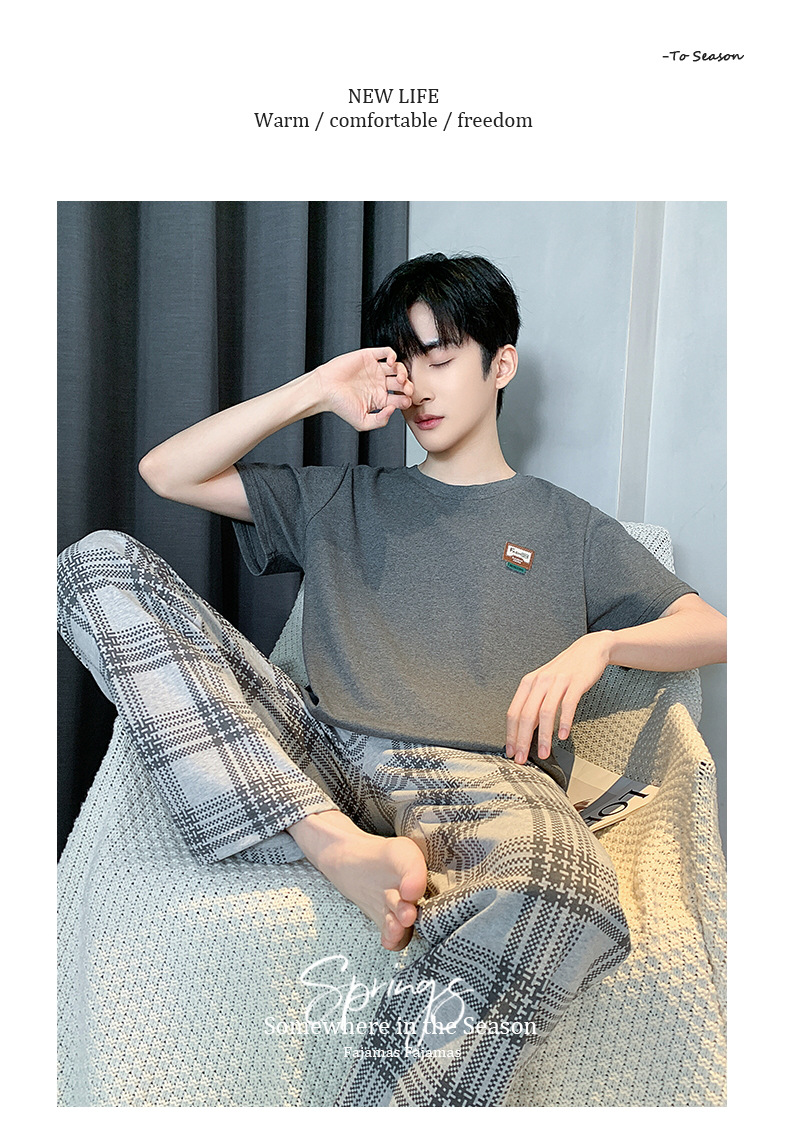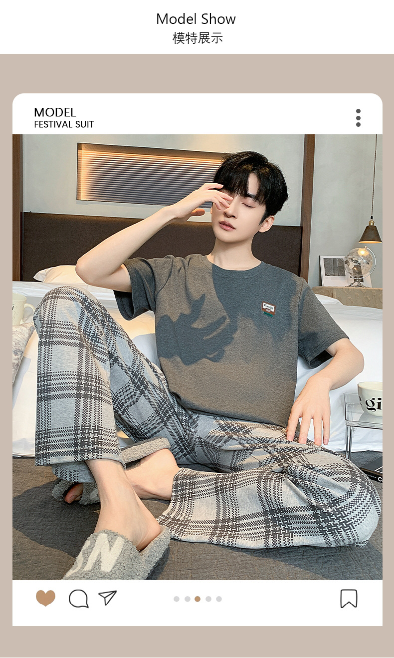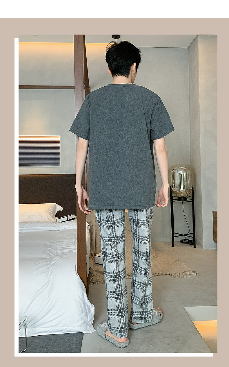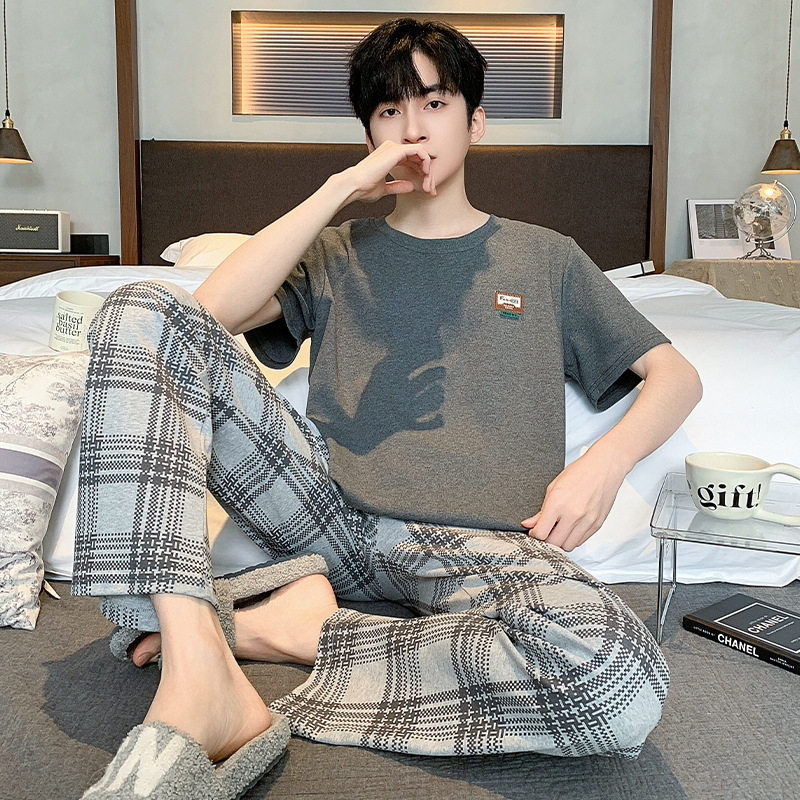 새로운 잠옷 남자 둥근 목 얇은 면 반팔 바지 세트 청소년 봄과 여름 면 2 피스 홈 옷