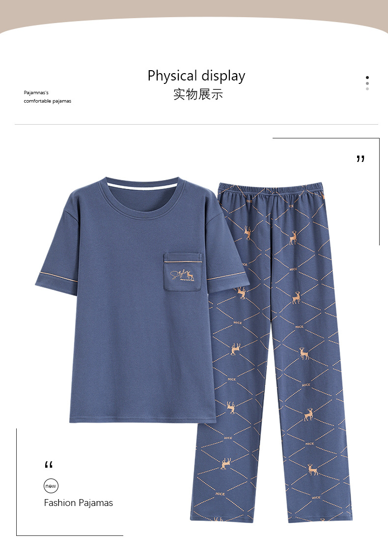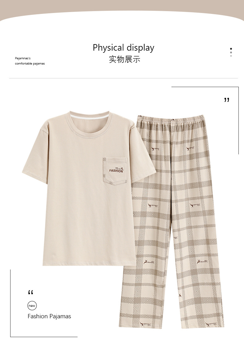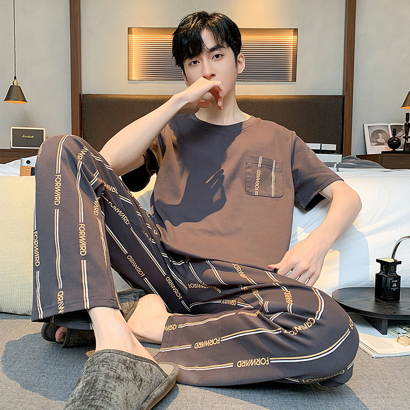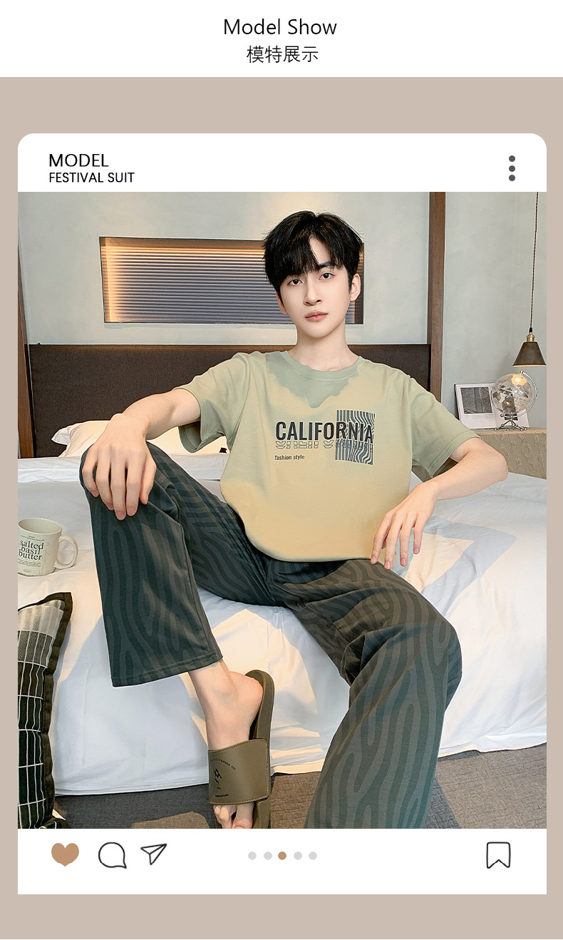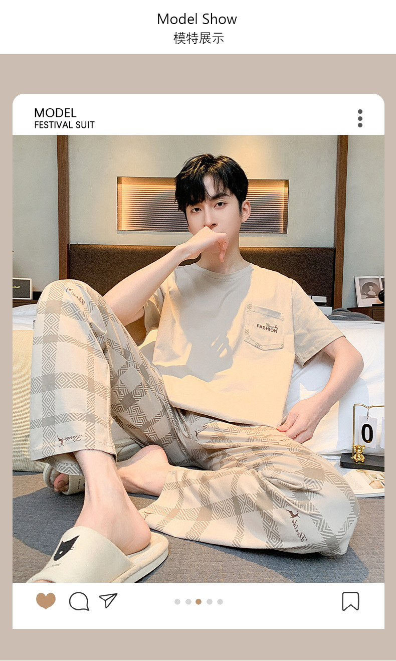 새로운 잠옷 남자 둥근 목 얇은 면 반팔 바지 세트 청소년 봄과 여름 면 2 피스 홈 옷