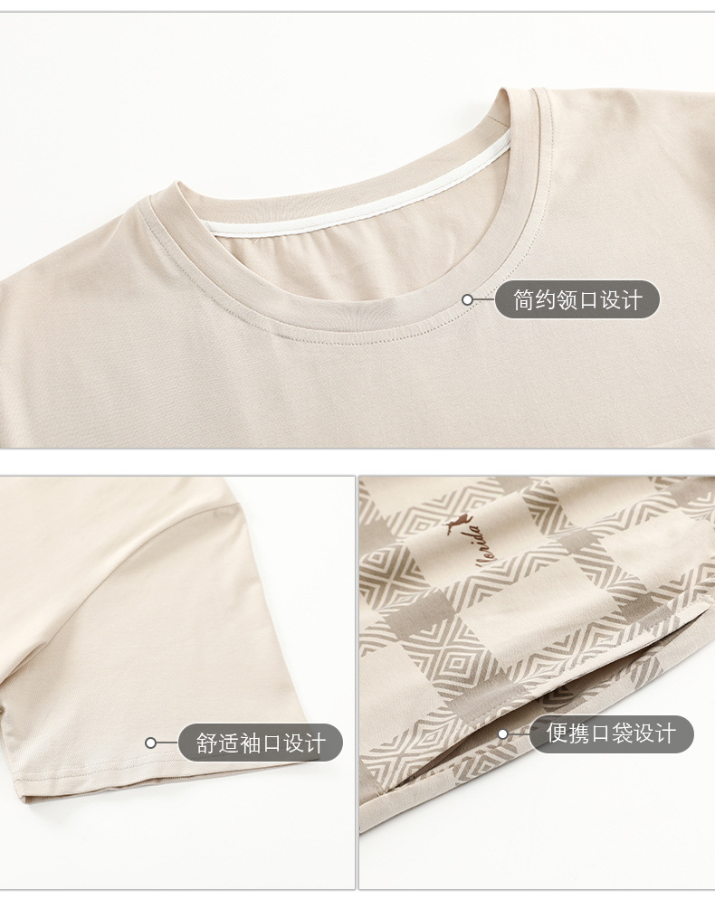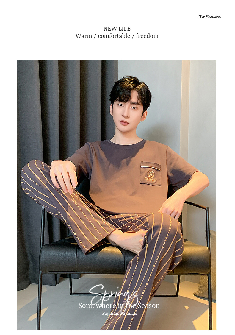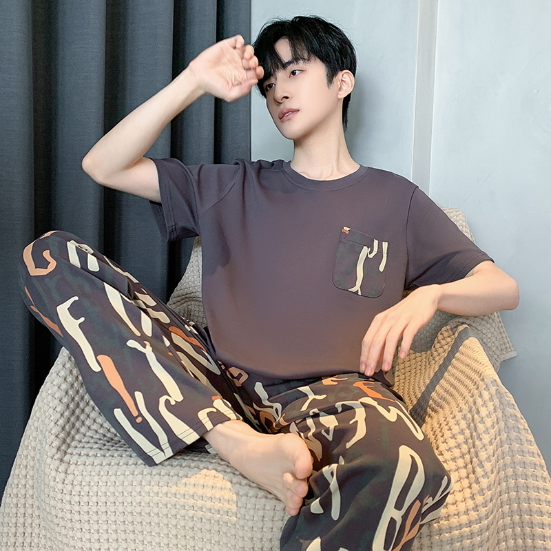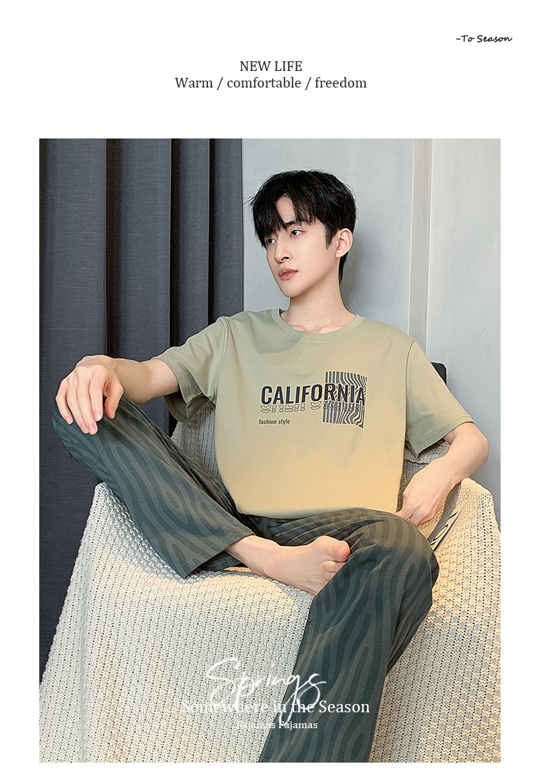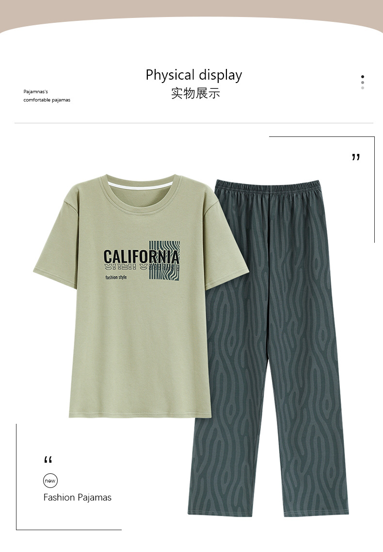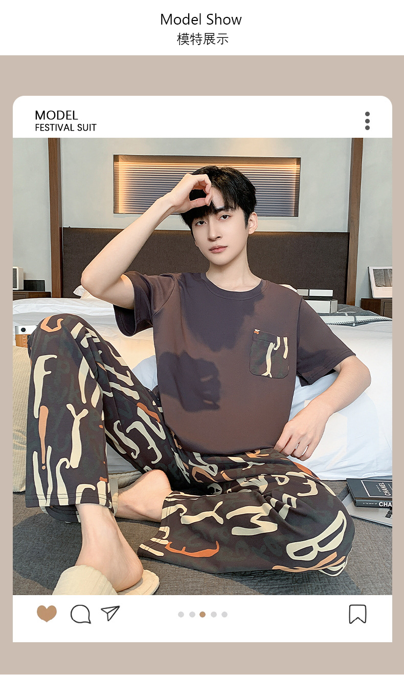 새로운 잠옷 남자 둥근 목 얇은 면 반팔 바지 세트 청소년 봄과 여름 면 2 피스 홈 옷