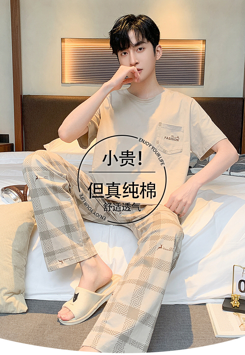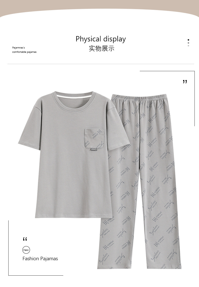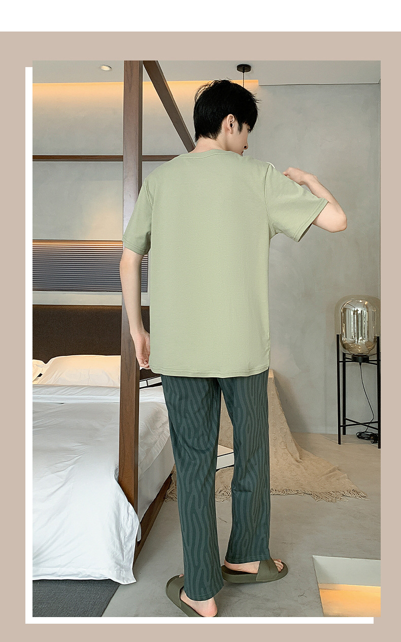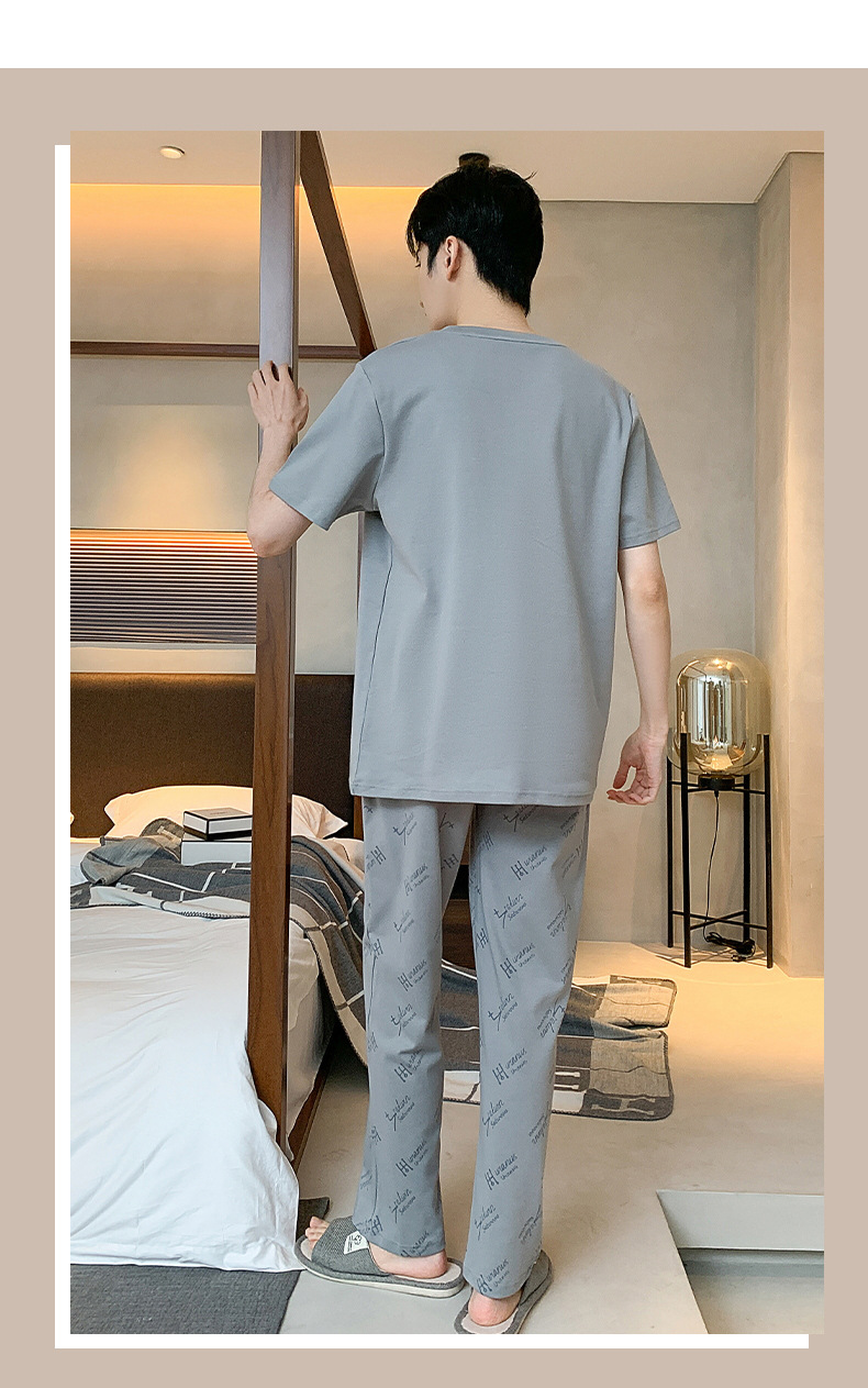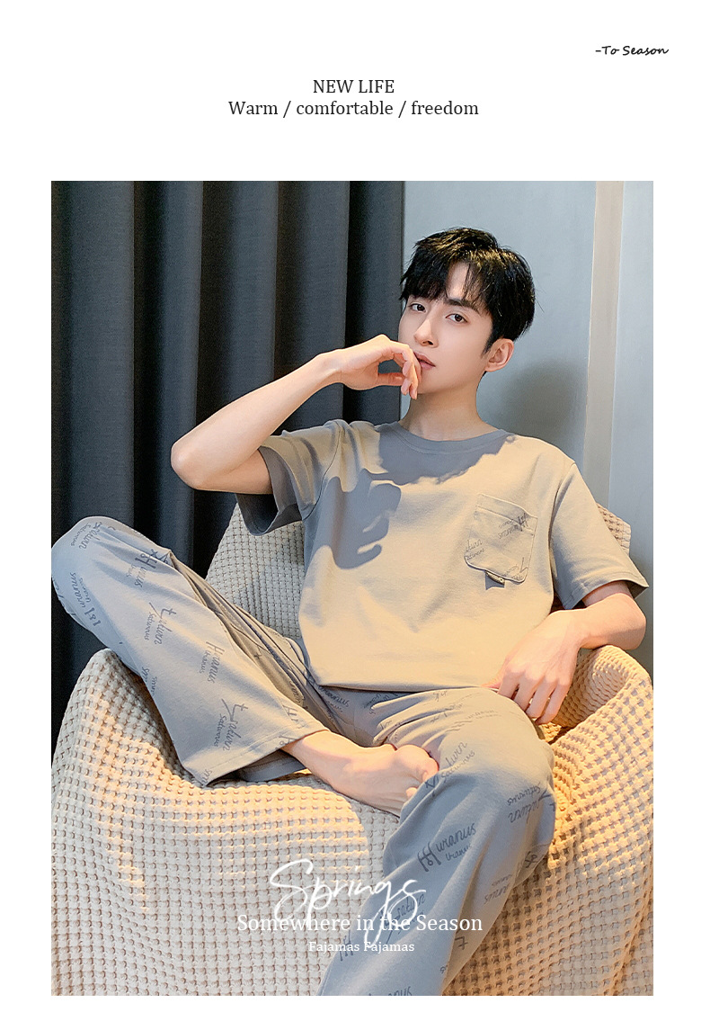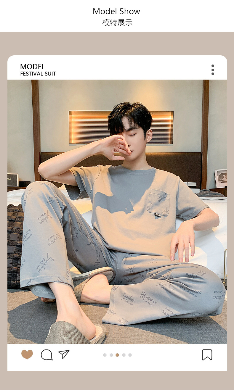 새로운 잠옷 남자 둥근 목 얇은 면 반팔 바지 세트 청소년 봄과 여름 면 2 피스 홈 옷스토어 가기