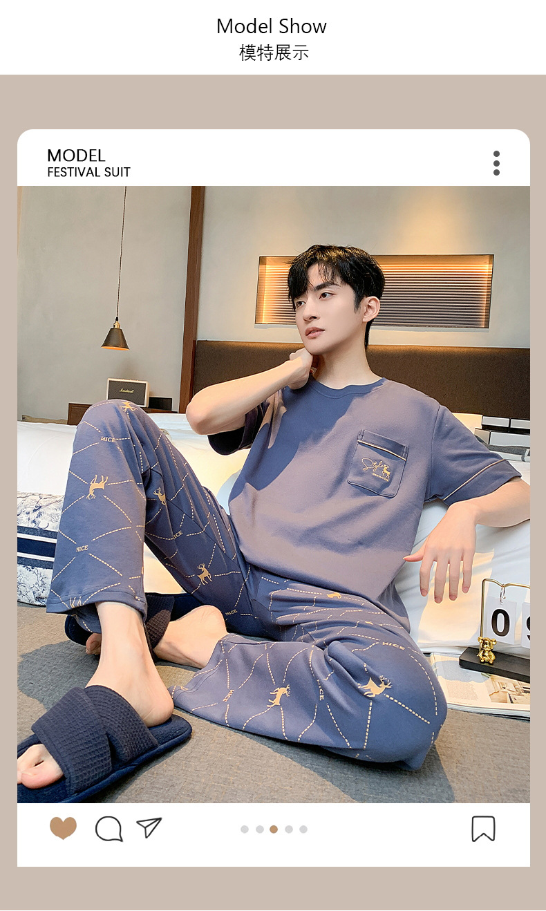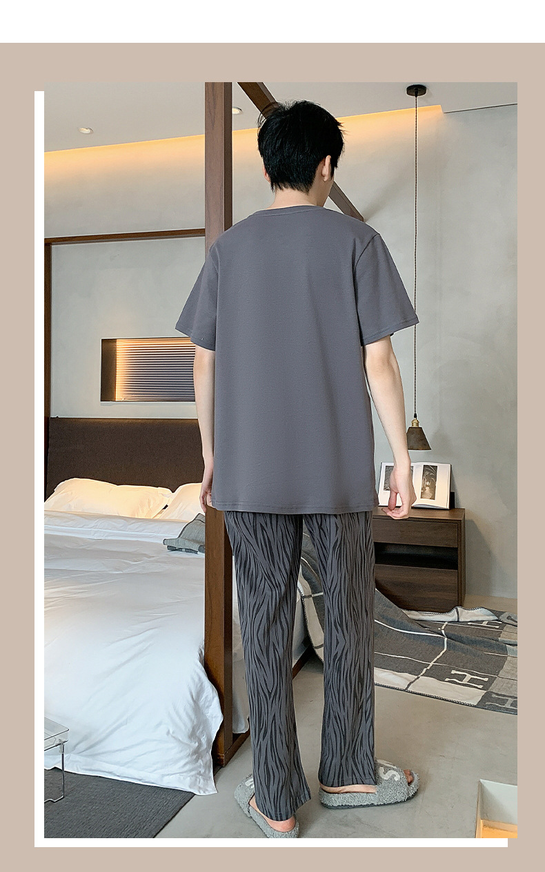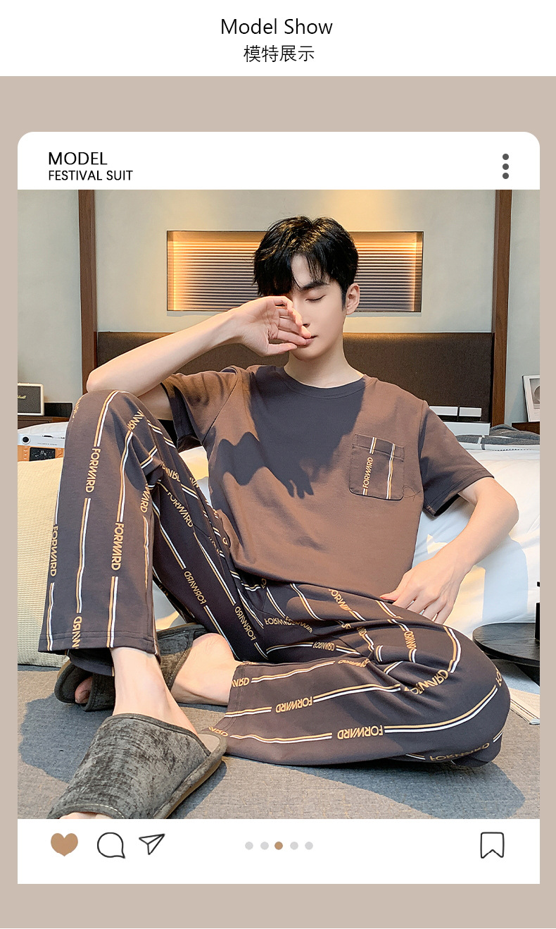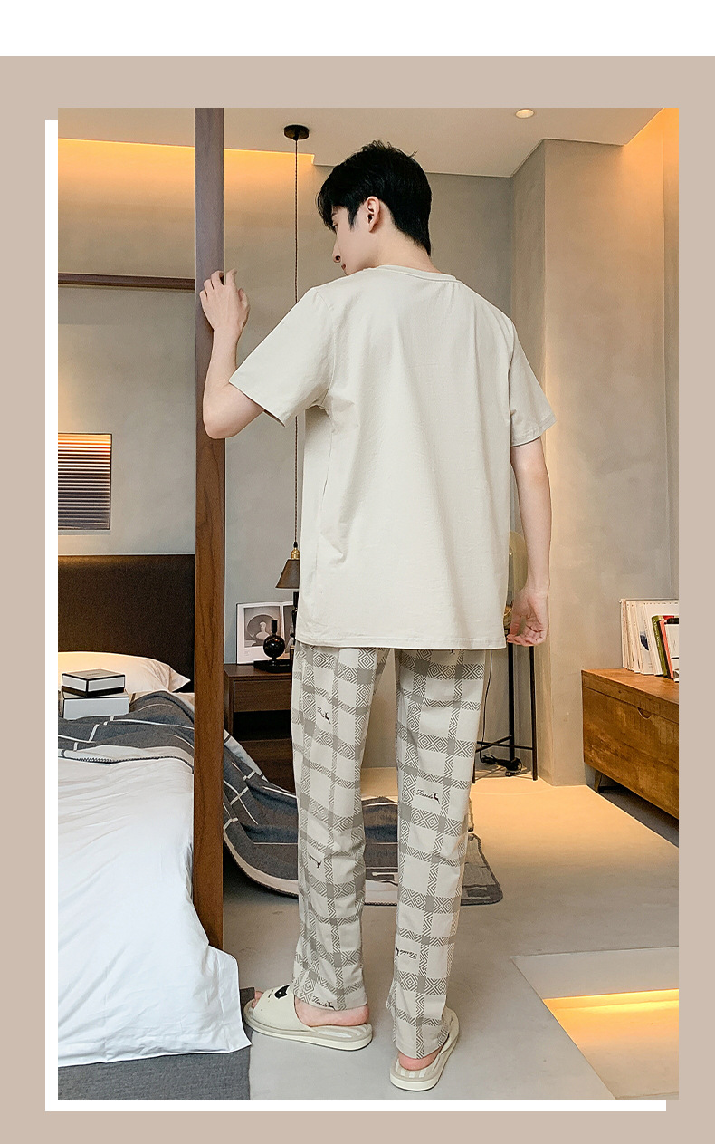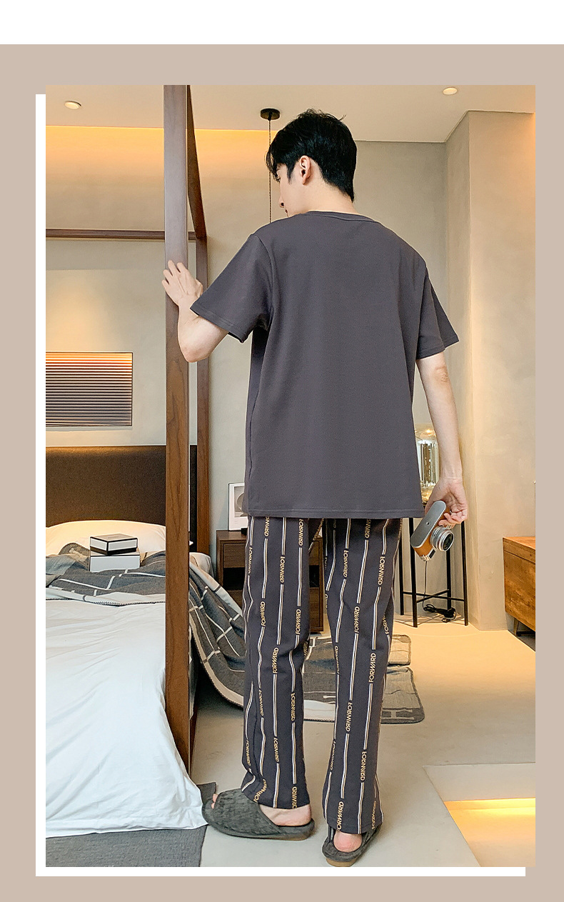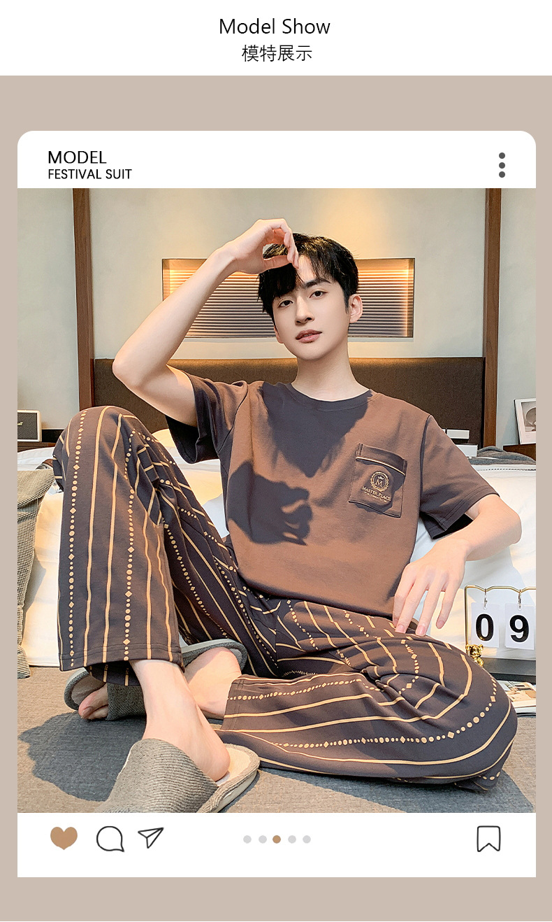 새로운 잠옷 남자 둥근 목 얇은 면 반팔 바지 세트 청소년 봄과 여름 면 2 피스 홈 옷스토어 가기