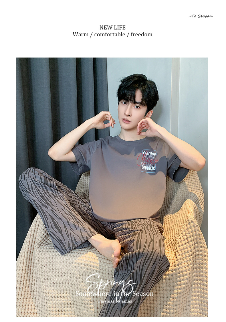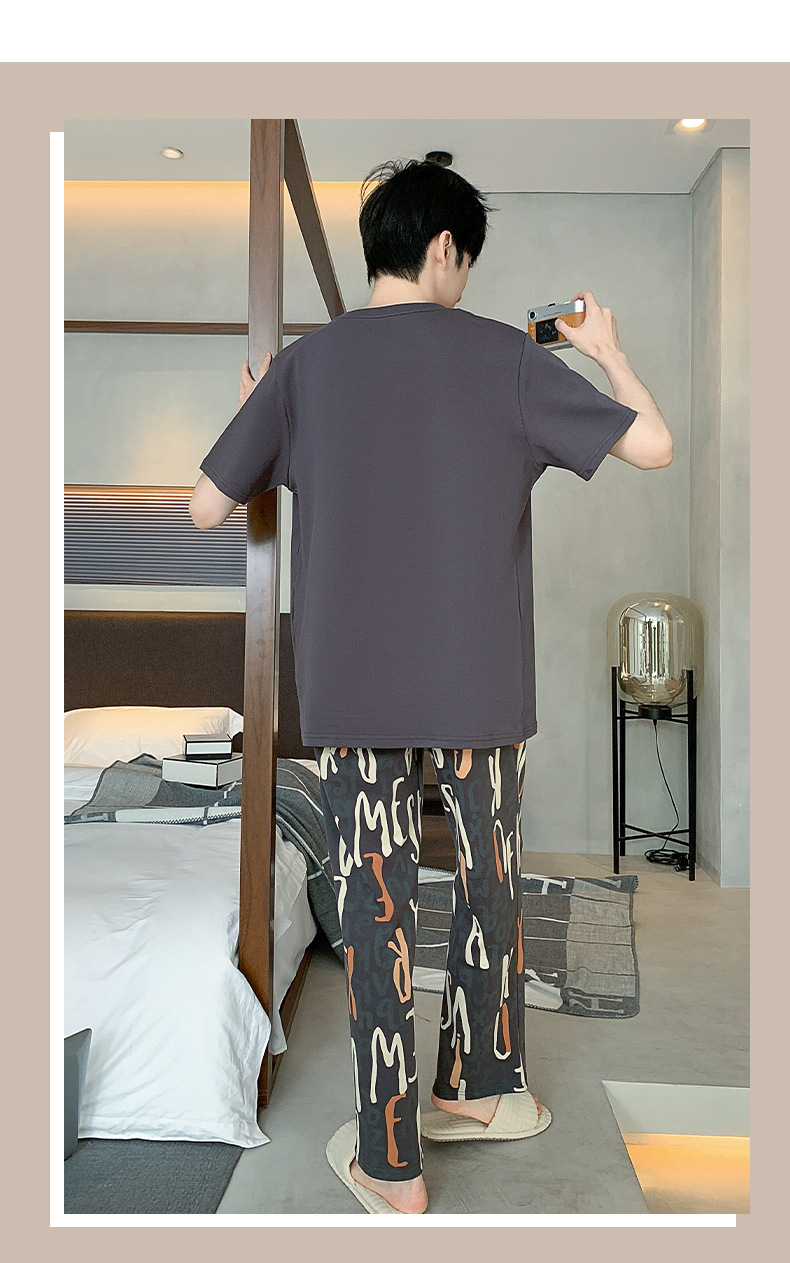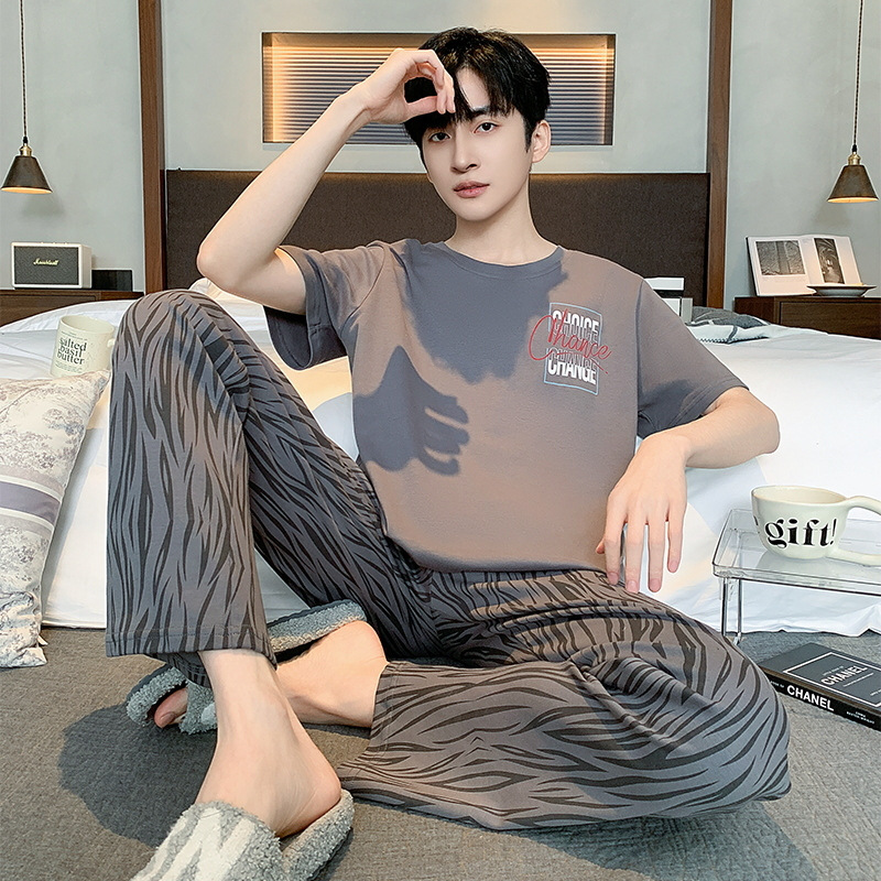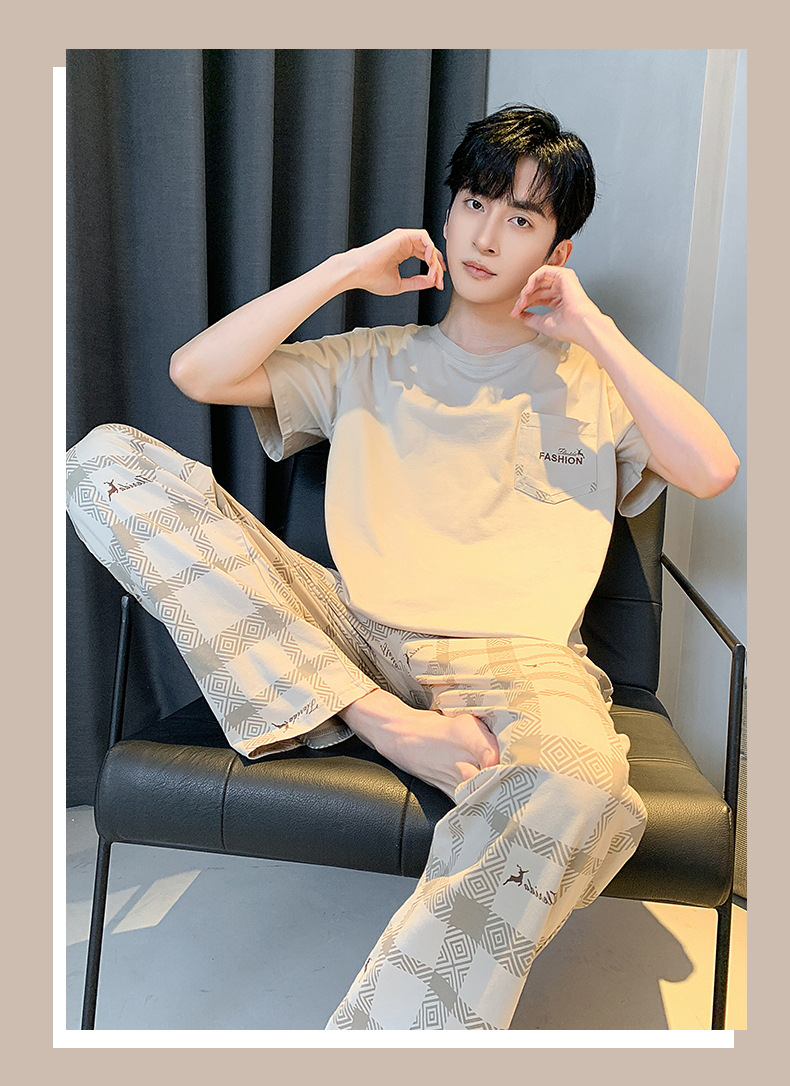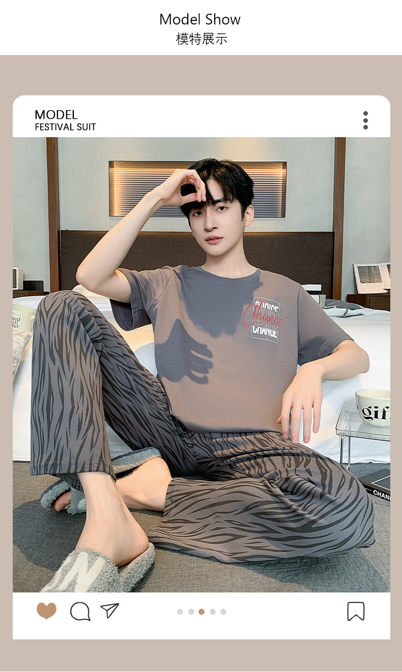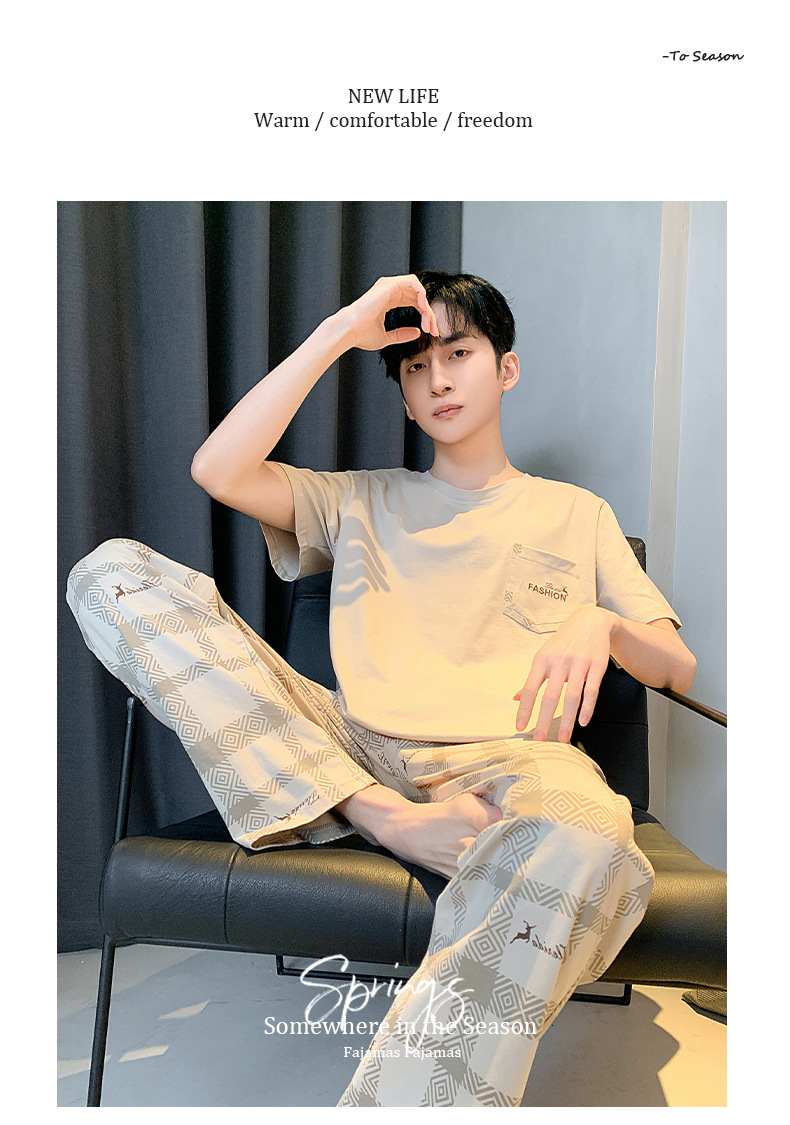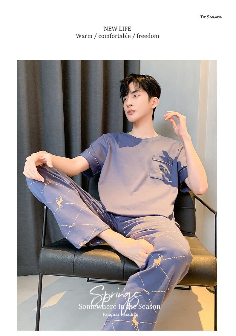 새로운 잠옷 남자 둥근 목 얇은 면 반팔 바지 세트 청소년 봄과 여름 면 2 피스 홈 옷스토어 가기