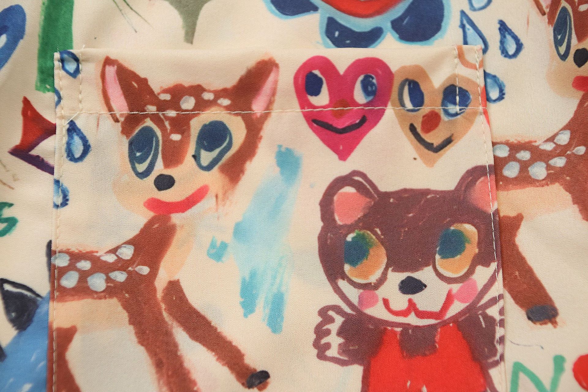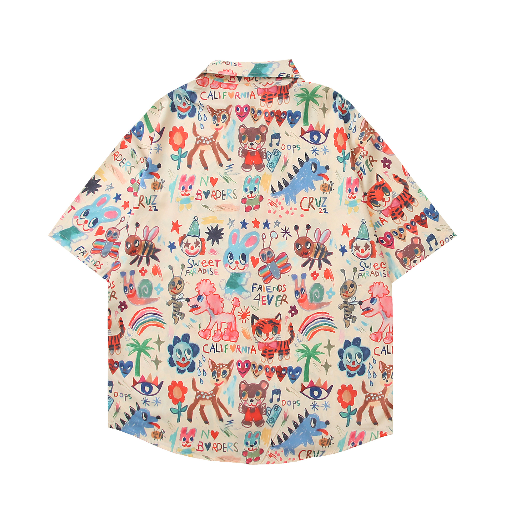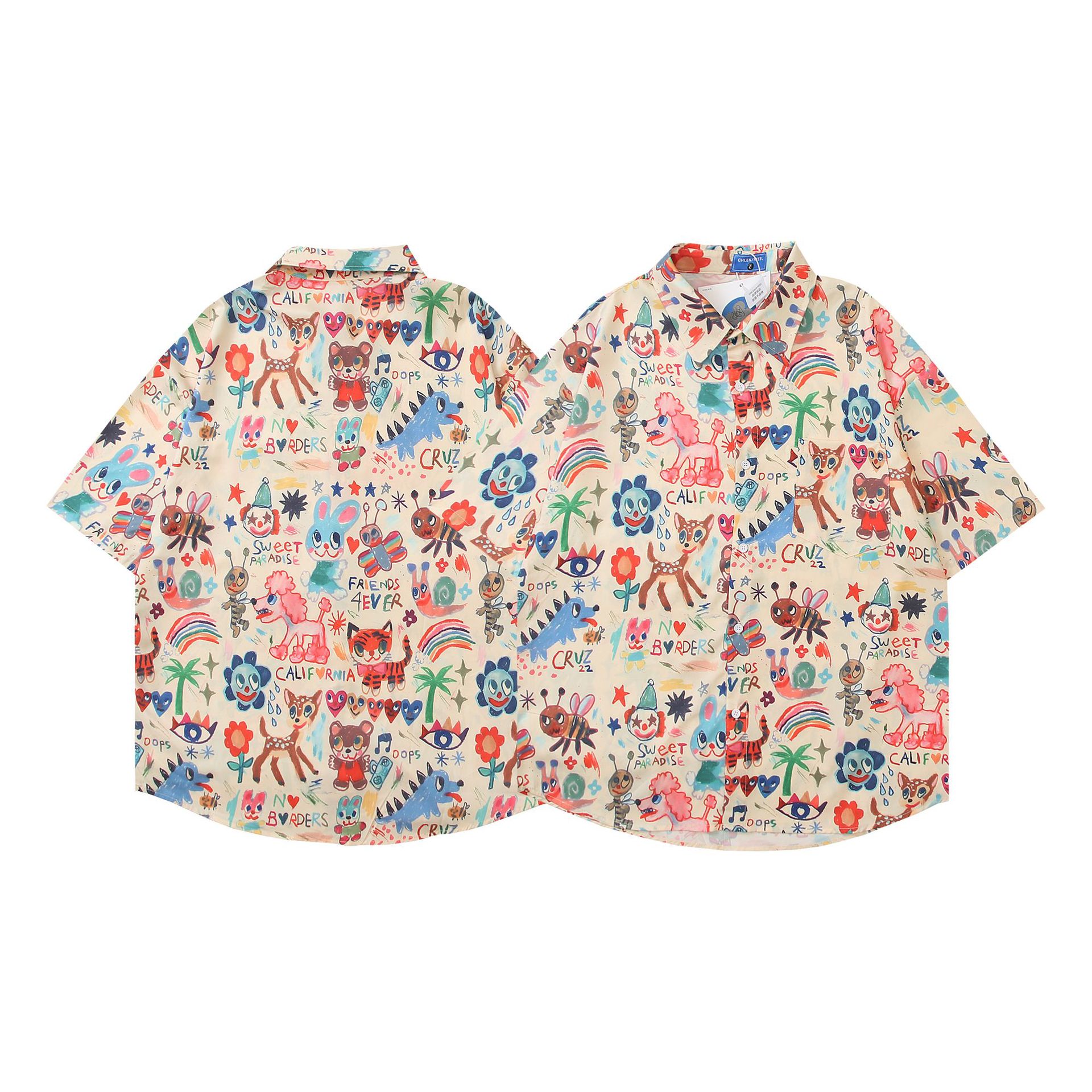일본식 유치한 복고풍 귀여운 소녀의 도파민 반팔 만화 프린트 셔츠 남성용 오버 사이즈 루즈 셔츠