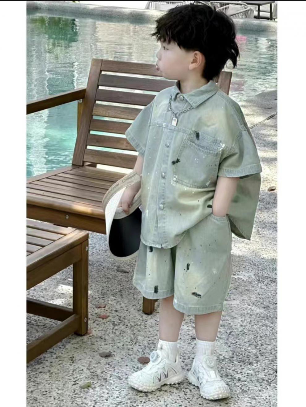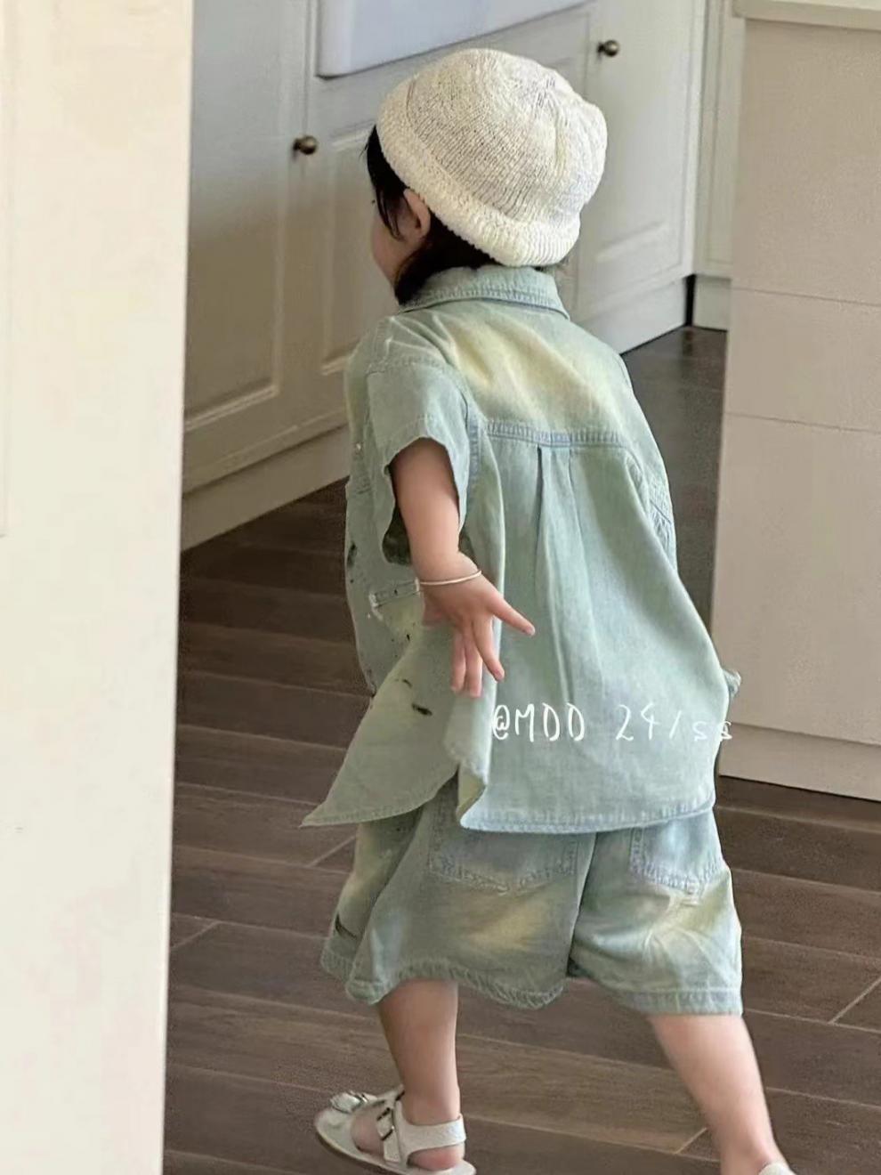 2024 년 여름 새 아동복 어린이 한국 그라데이션 데님 세트 소년 소녀 스프레이 페인트 투피스 세트 조수스토어 가기