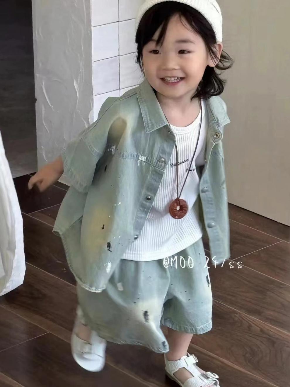 2024 년 여름 새 아동복 어린이 한국 그라데이션 데님 세트 소년 소녀 스프레이 페인트 투피스 세트 조수