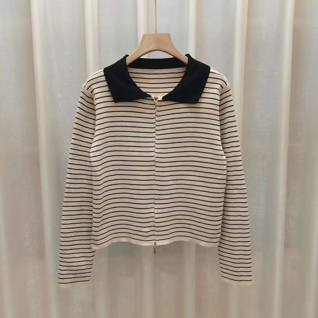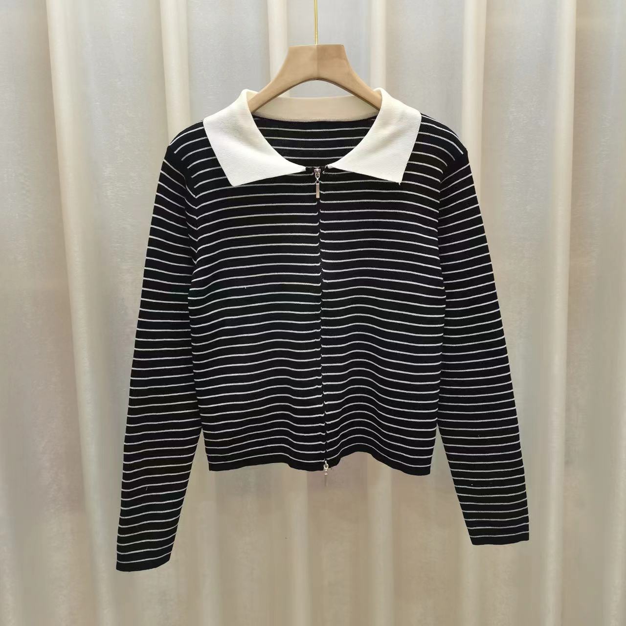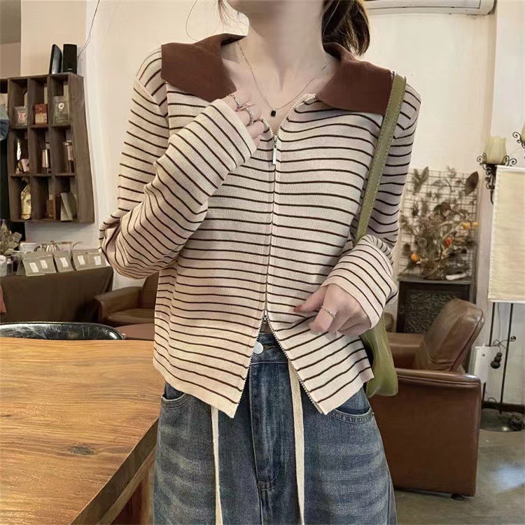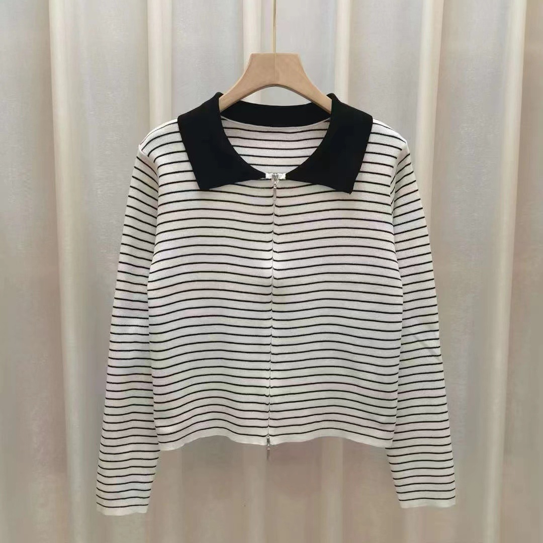대조 칼라 스트라이프 긴 소매 더블 지프 스웨터 여성의 봄 새로운 슬림 핏 스웨터 쇼트 탑 여성 의류스토어 가기