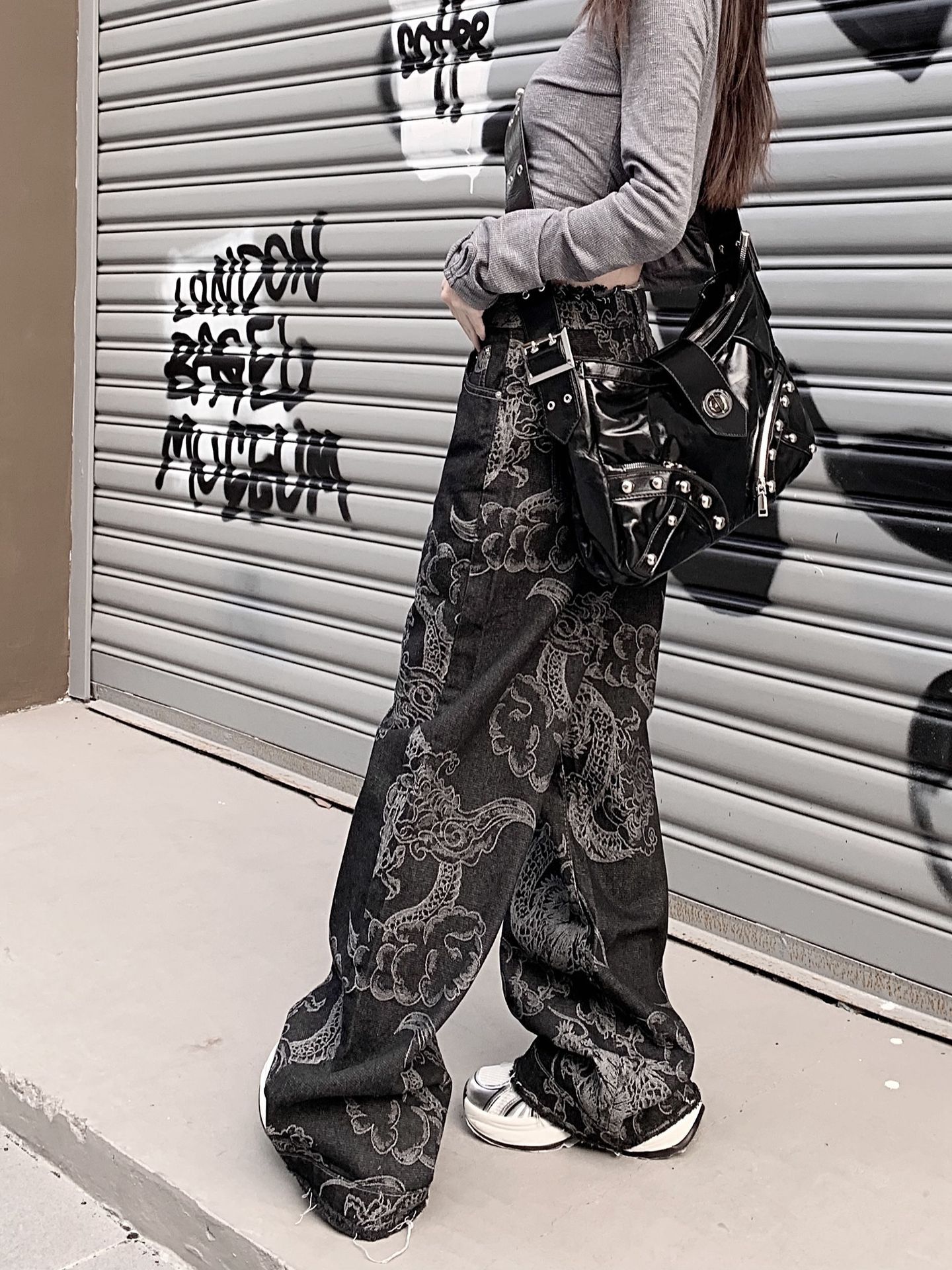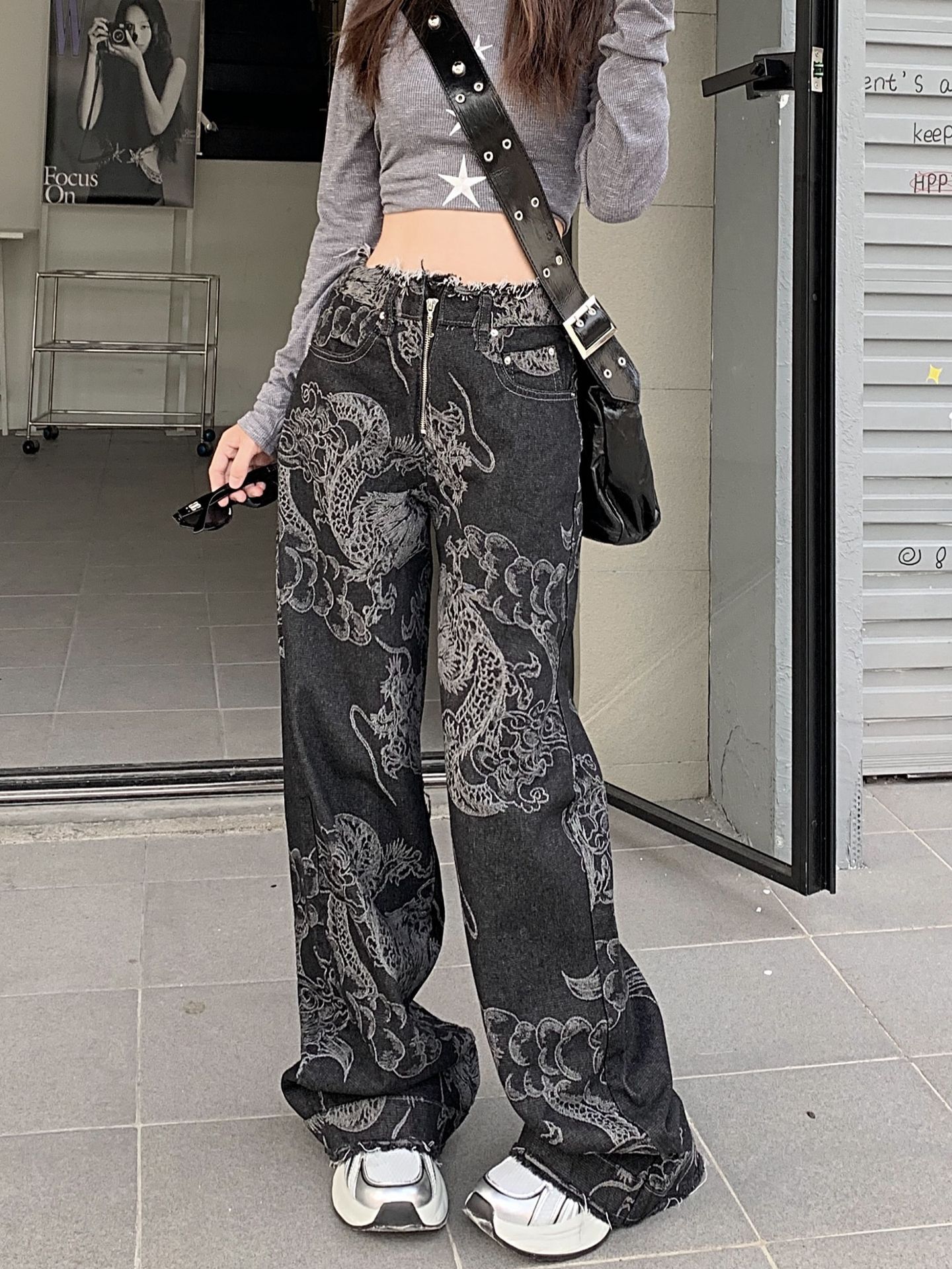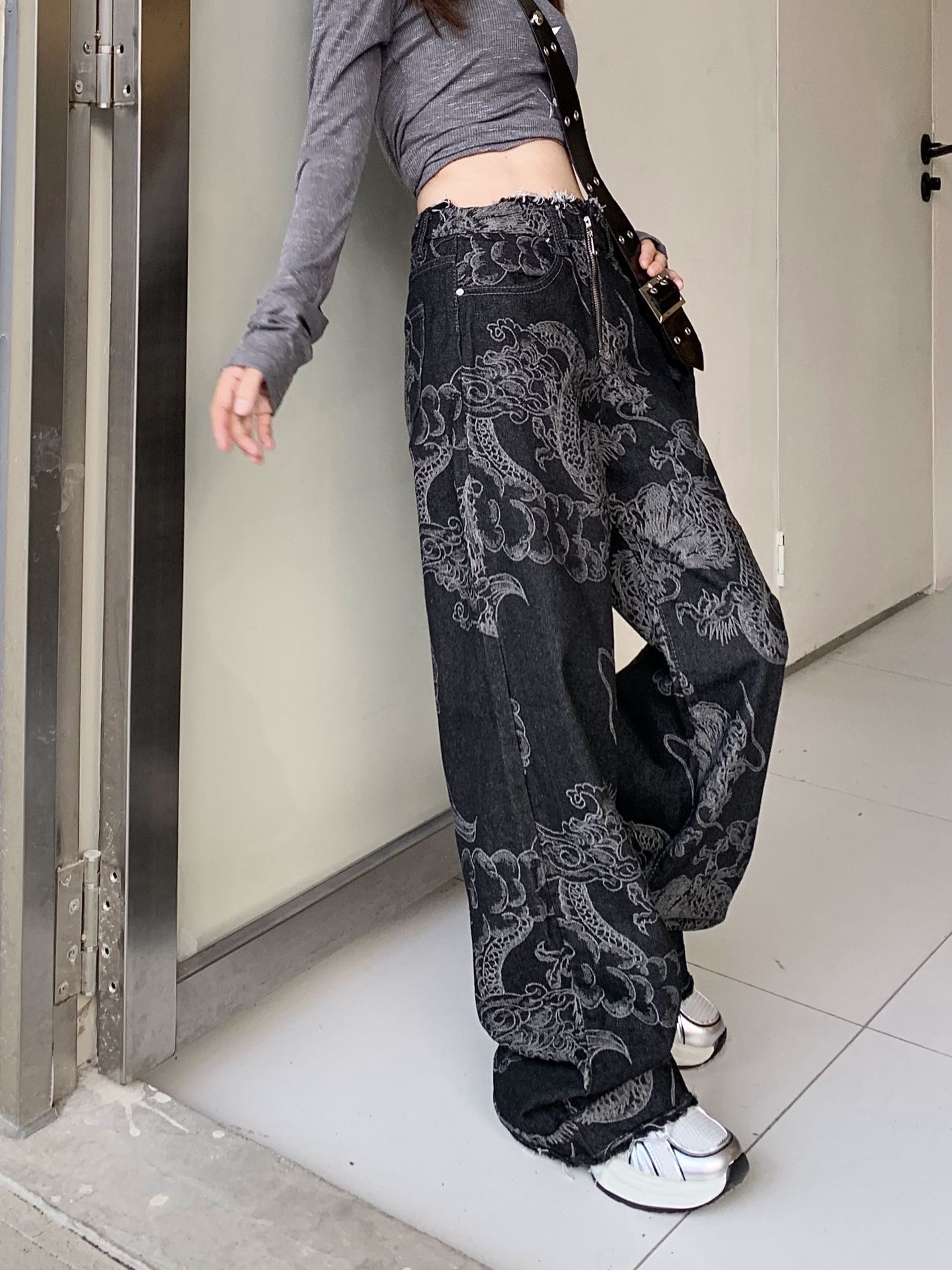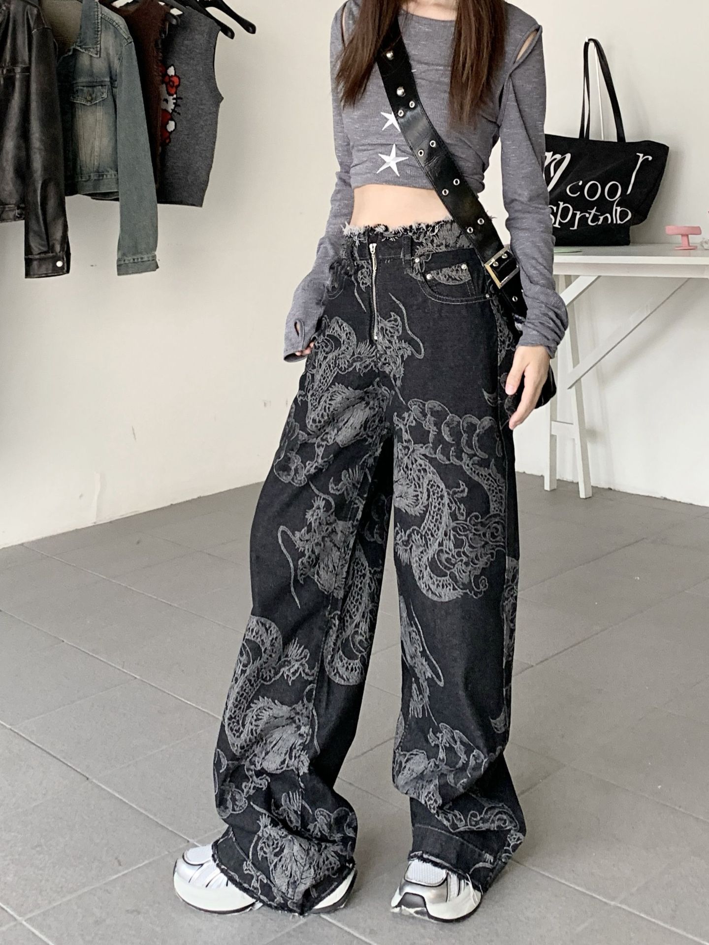 미국 스타일의 트렌디 드래곤 프린트 패션 디자인 센스 라브 와이드 레그 청바지 여성의 높은 허리 느슨한 슬림 핏 모핑 바지