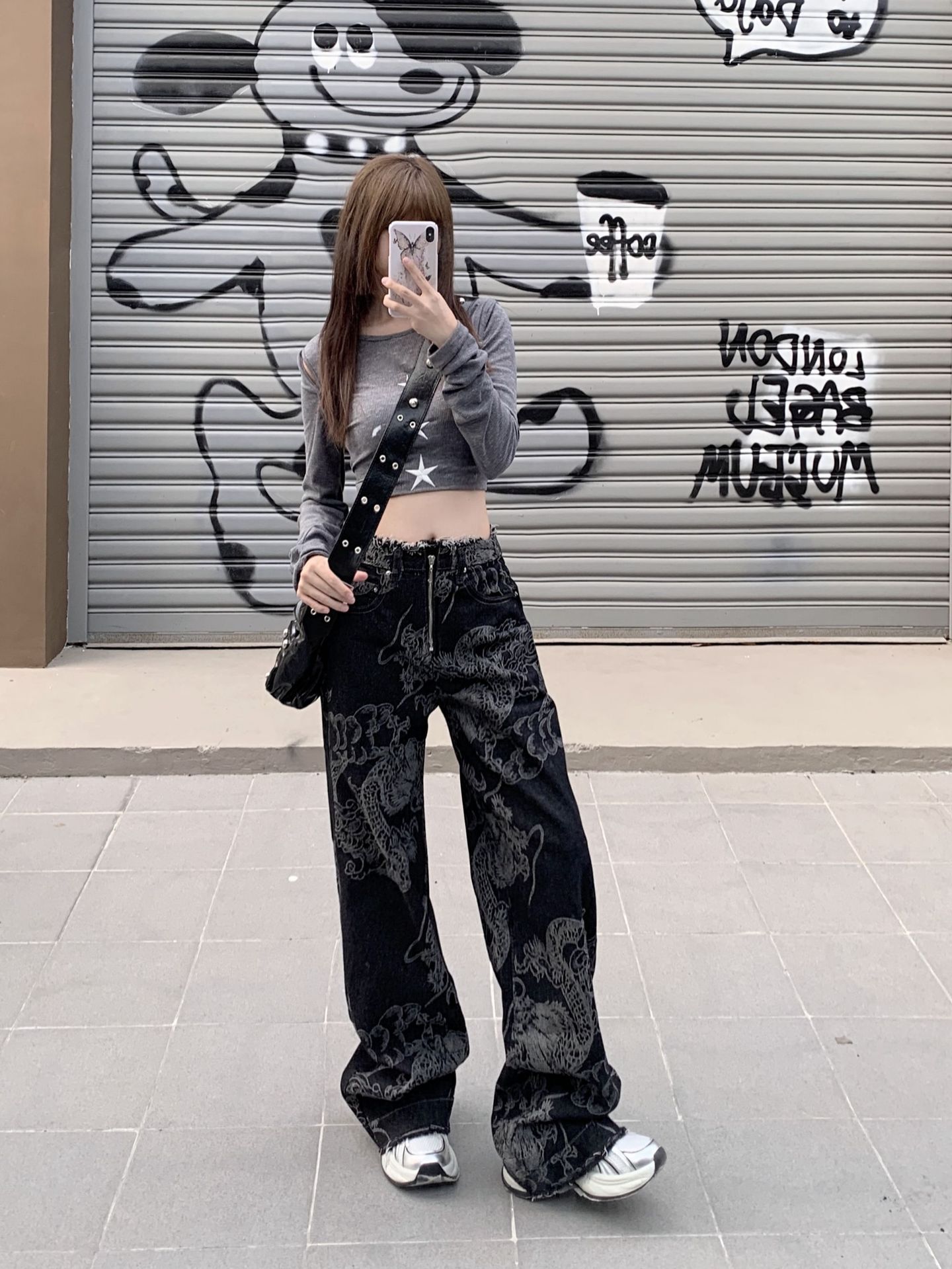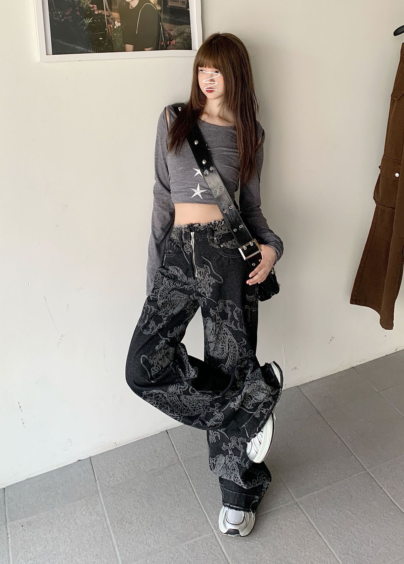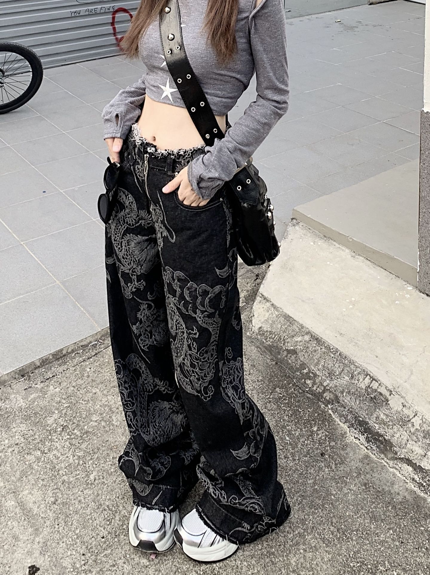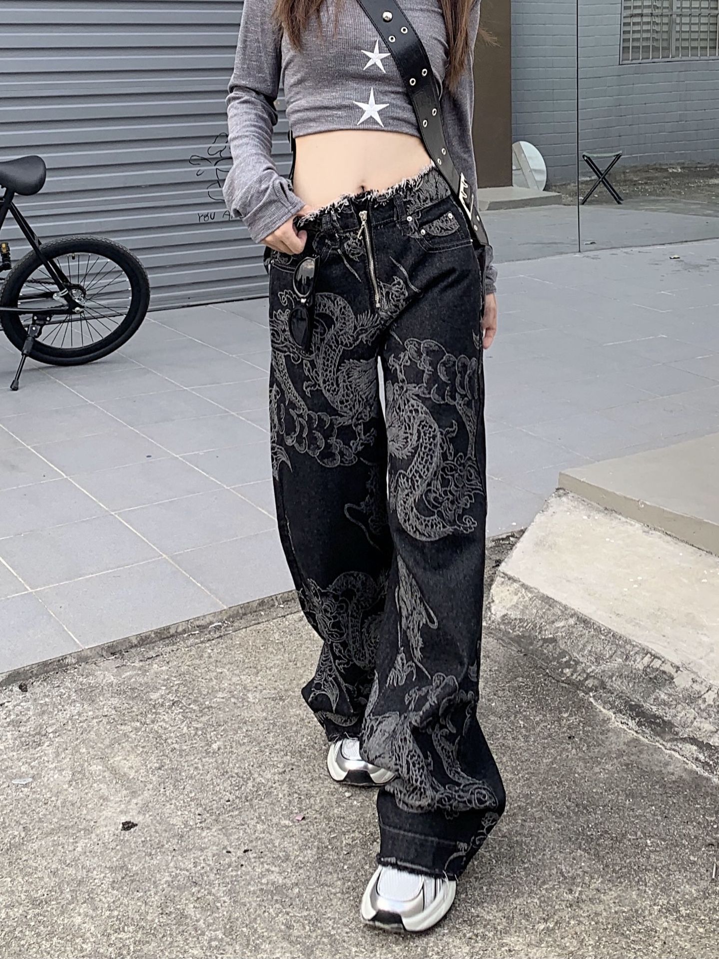 미국 스타일의 트렌디 드래곤 프린트 패션 디자인 센스 라브 와이드 레그 청바지 여성의 높은 허리 느슨한 슬림 핏 모핑 바지