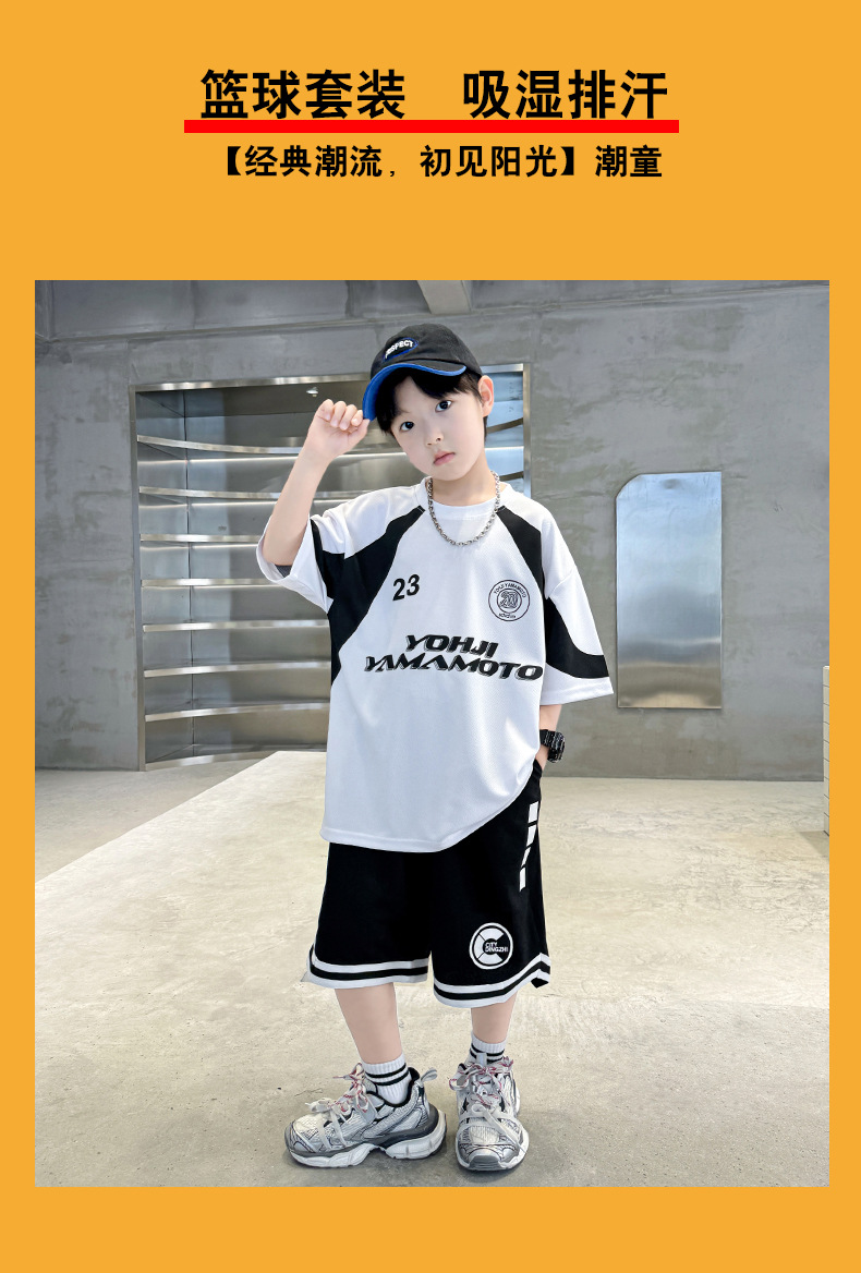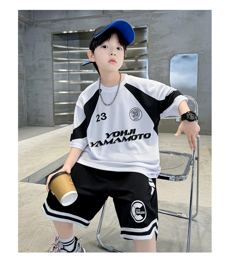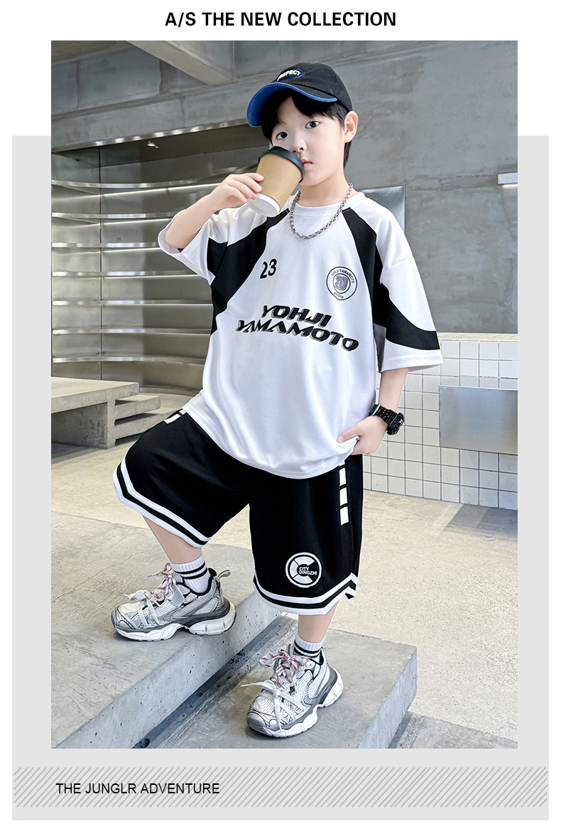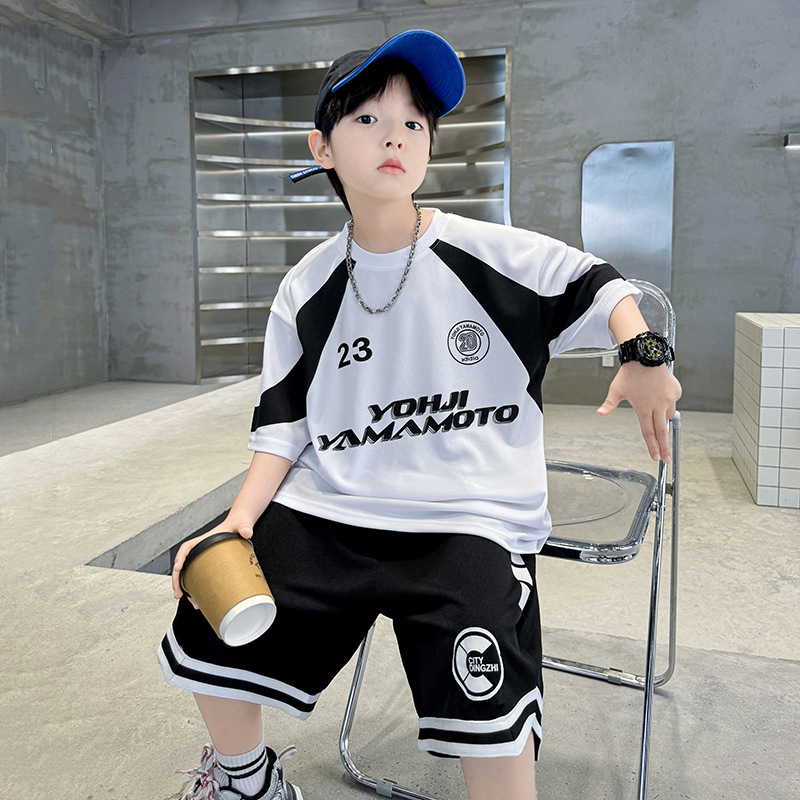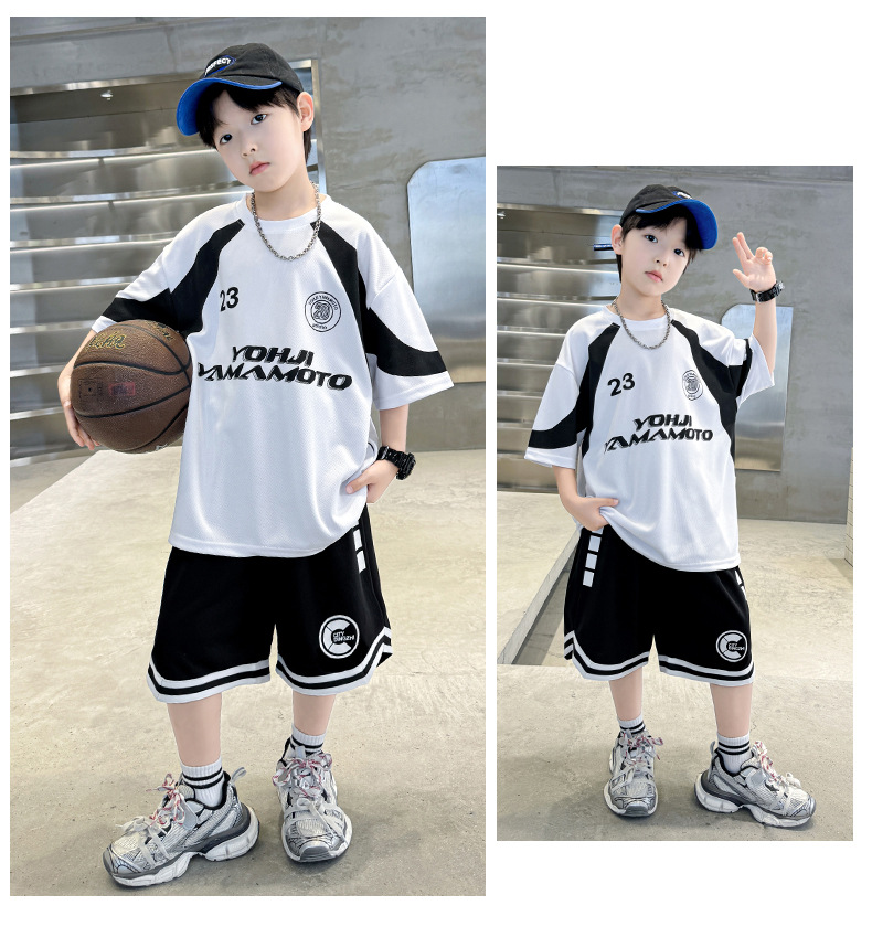 소년 농구 의류 세트 2024 새로운 여름 중형 및 대형 아동복 빠른 건조 반팔 2 피스 어린이 여름 의류 도매