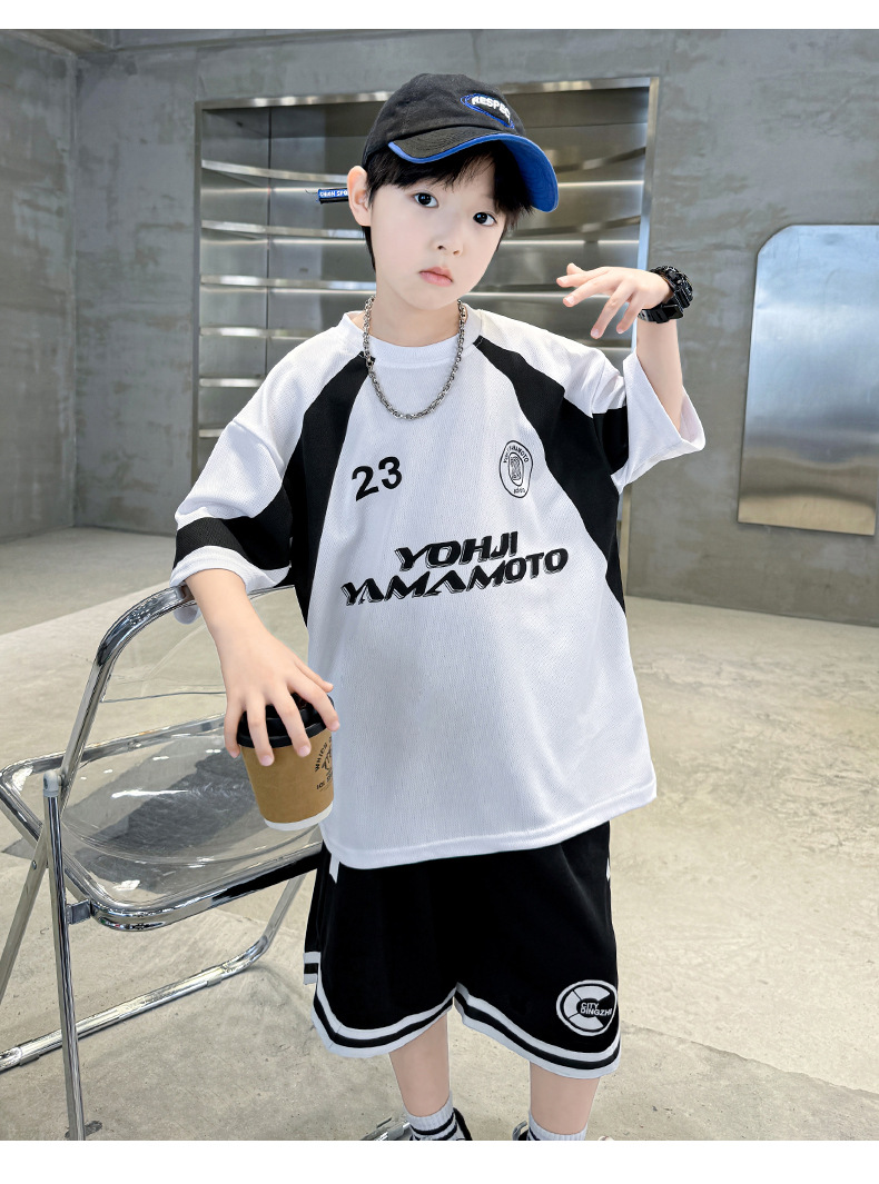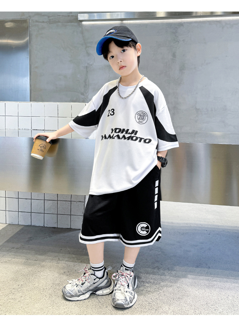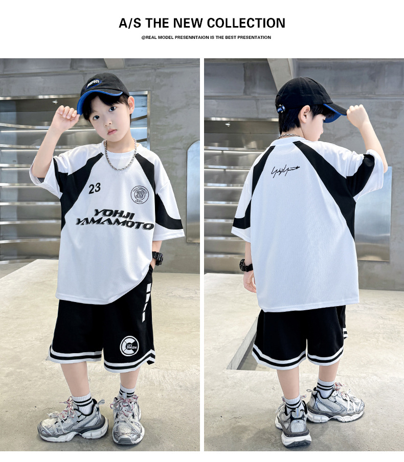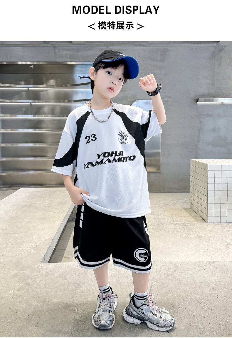 소년 농구 의류 세트 2024 새로운 여름 중형 및 대형 아동복 빠른 건조 반팔 2 피스 어린이 여름 의류 도매