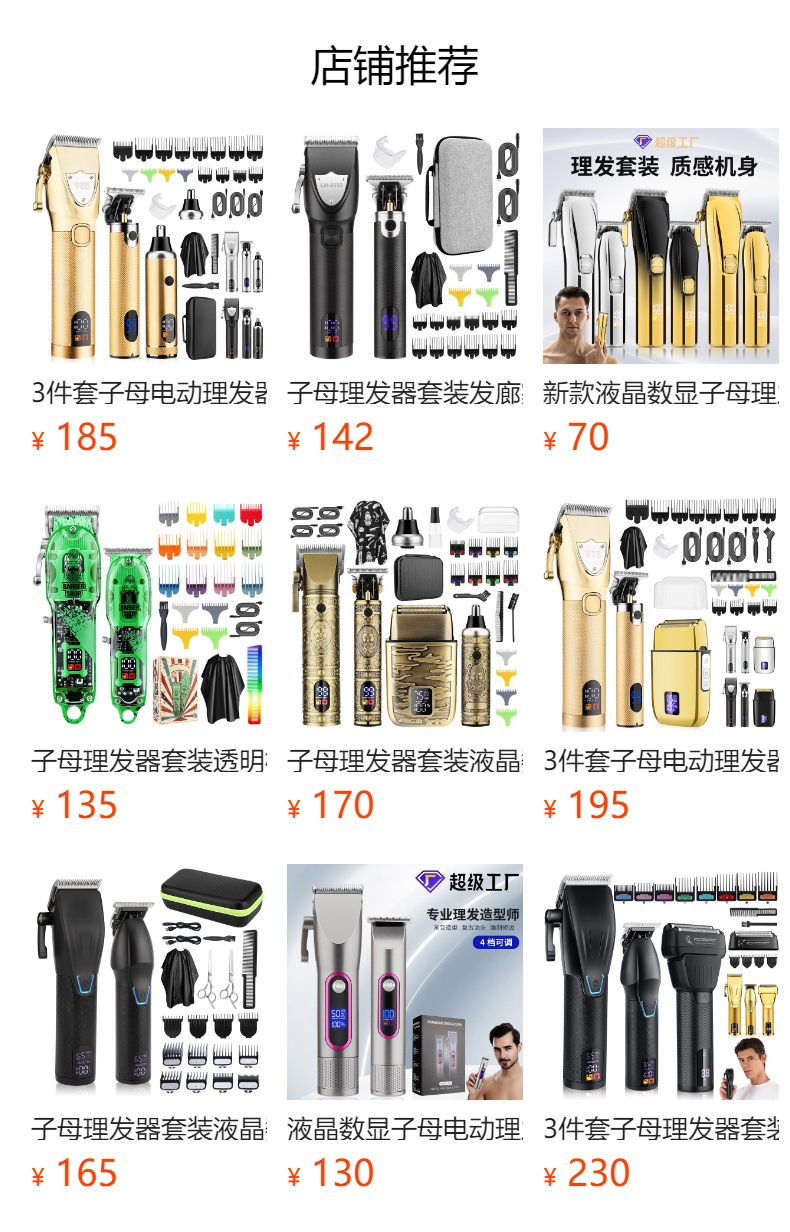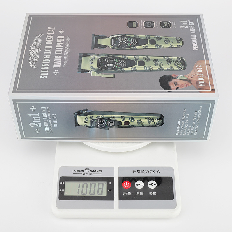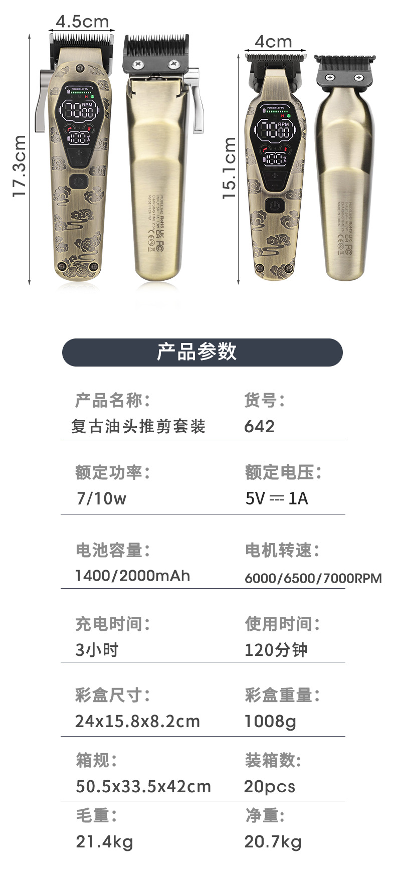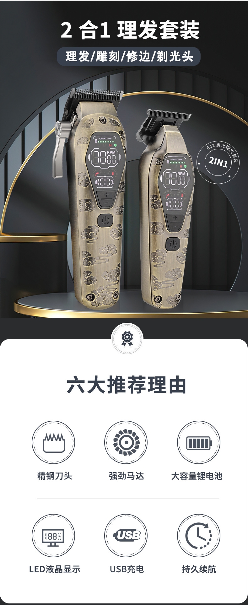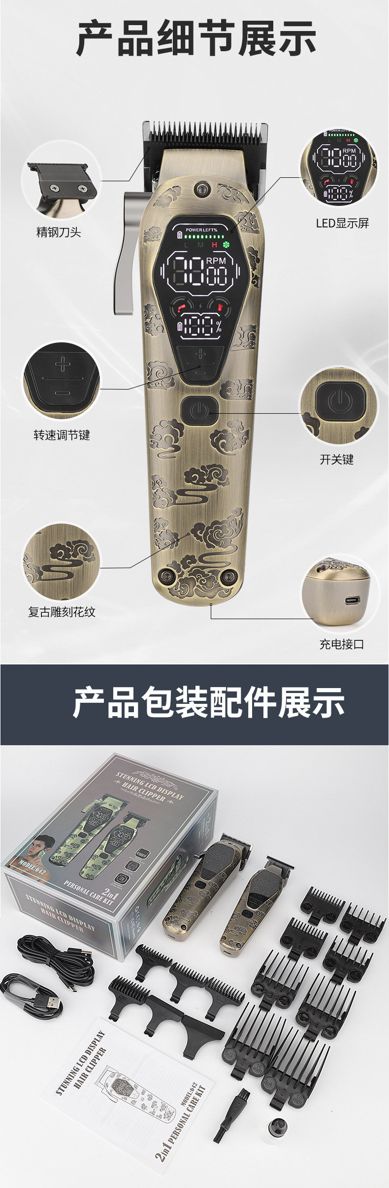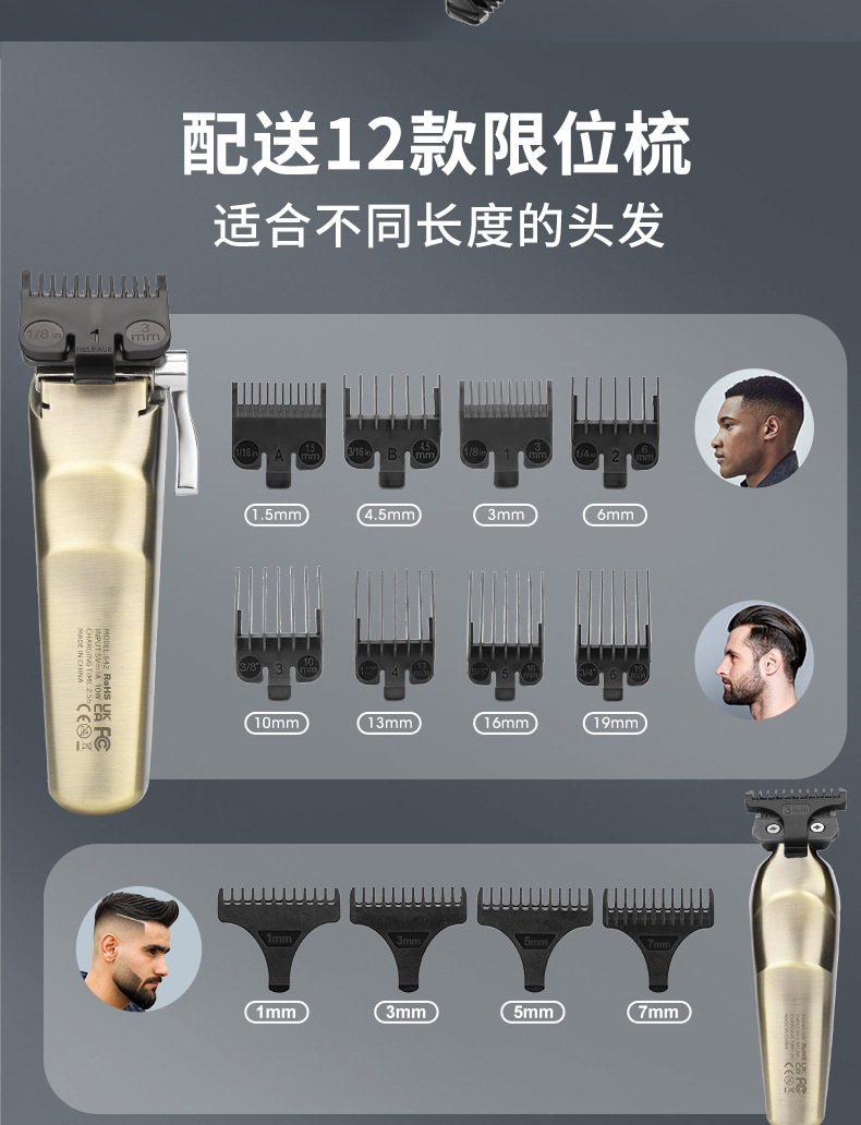 包含配件:专业理发器*1 雕刻理发器*1 大限位梳*8(1.5 3 4.5 6 10 13 16 19mm)小限位梳*4(1 2 3 4mm)USB充电线*2 清洁刷*1 英文说明书*1 油瓶*1