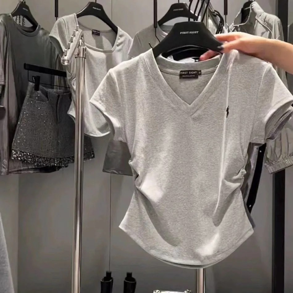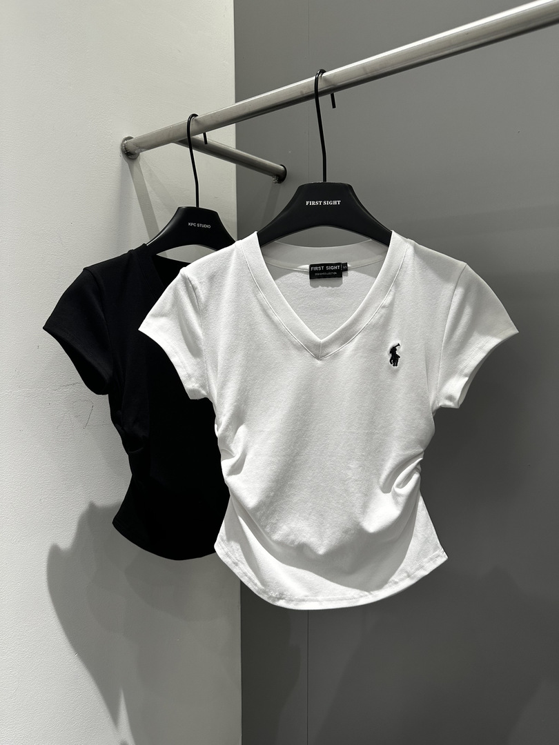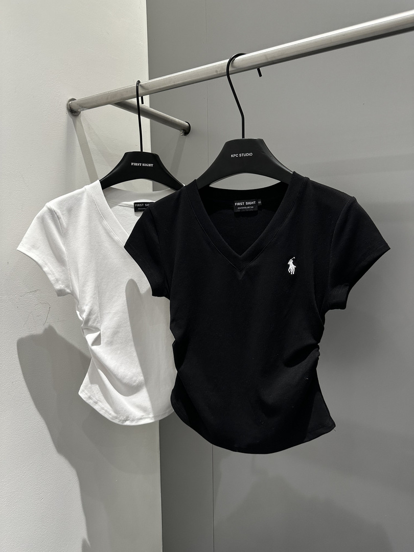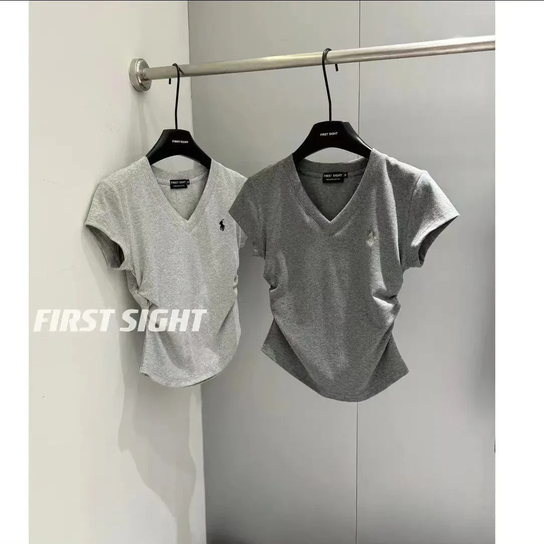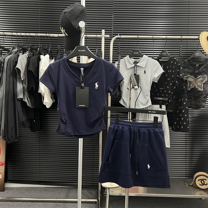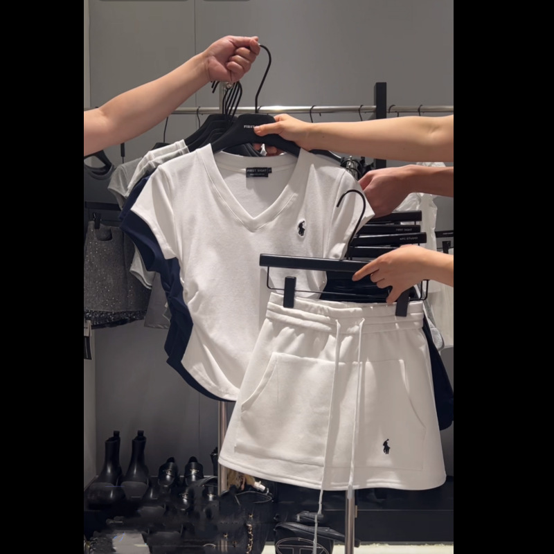 2026 여름 플리츠 포니 자수 V넥 반팔 슬림핏 탑+신축성 하이웨이스트 만능 스커트 여성용스토어 가기